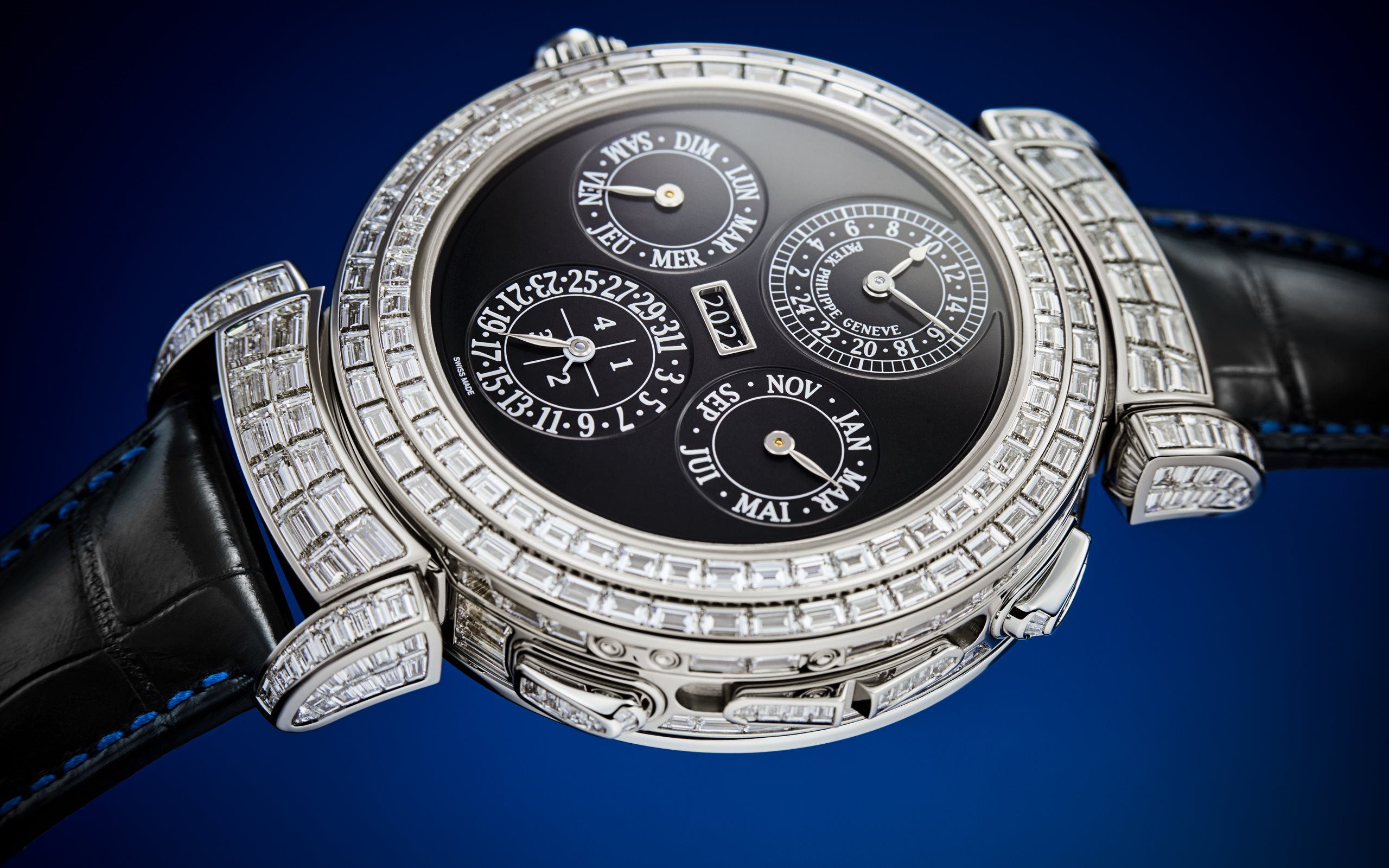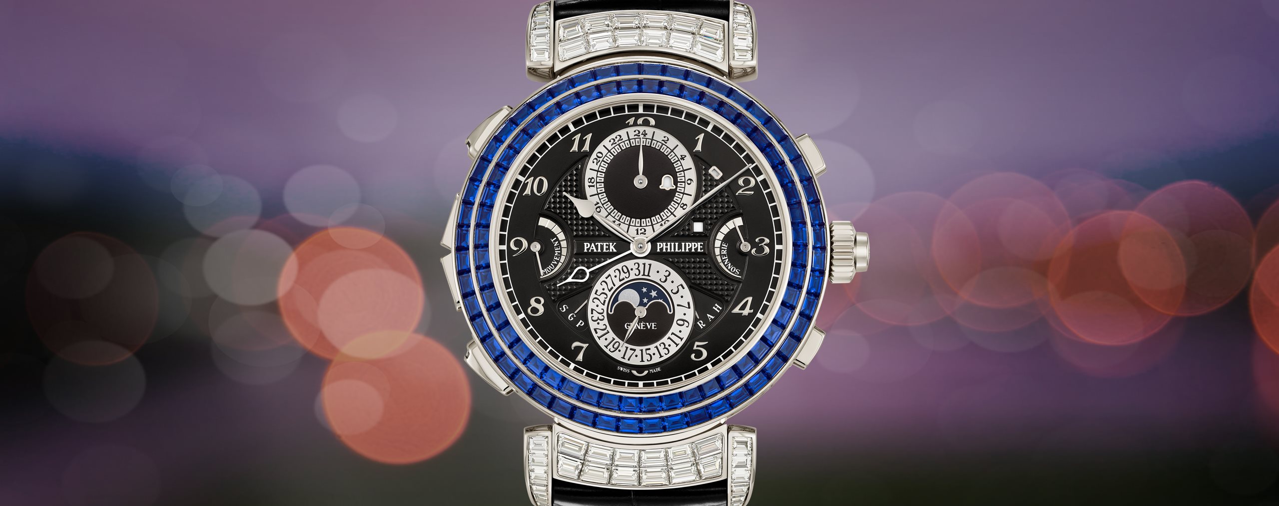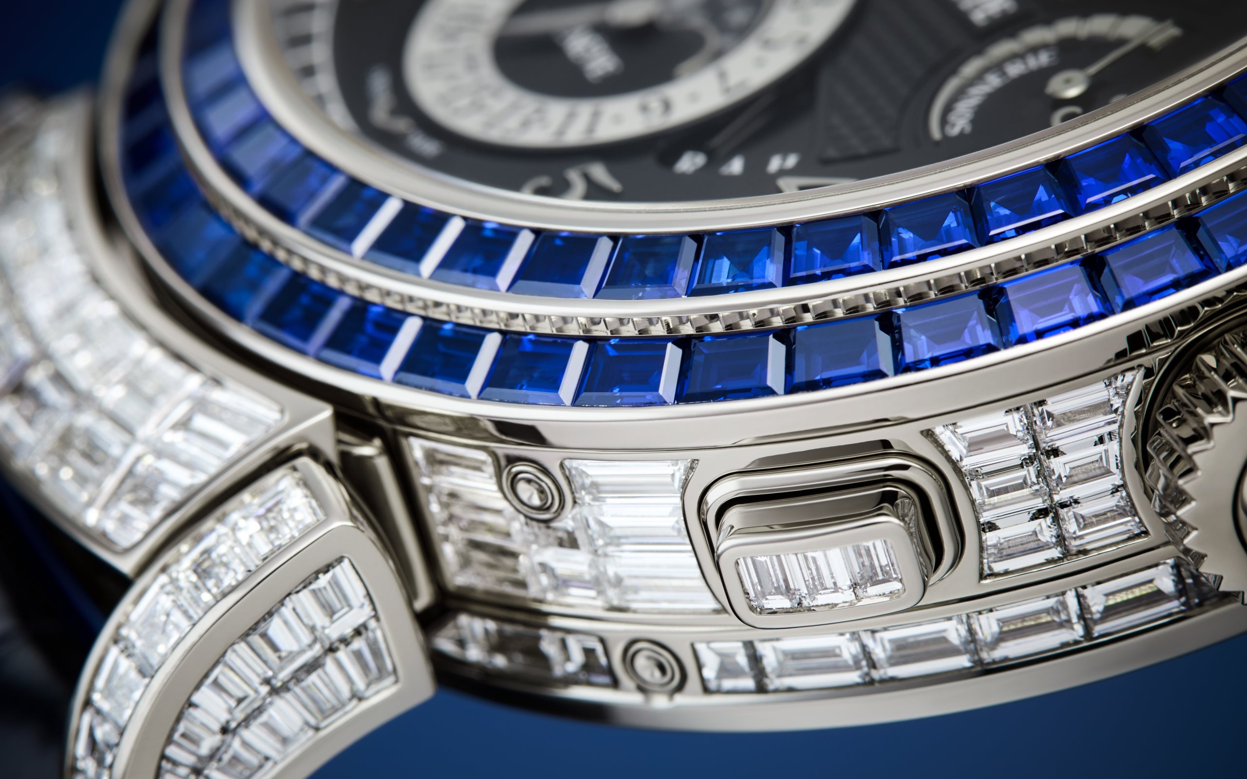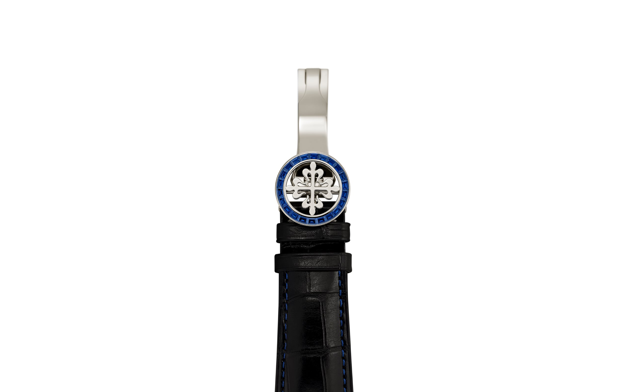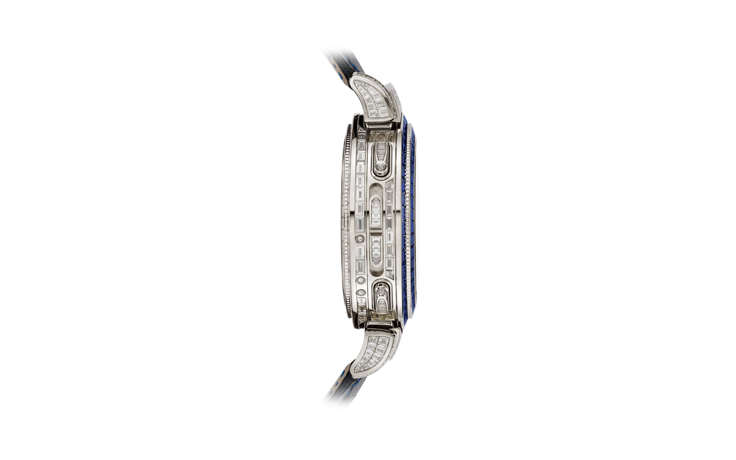 Patek Philippe combines Haute Horlogerie and Haute Joaillerie by reinterpreting its most complicated wristwatch in a white gold version set with 118 baguette-cut blue sapphires (11.9 cts) and 291 baguette-cut diamonds (20.54 cts), featuring the "invisible setting" technique.
