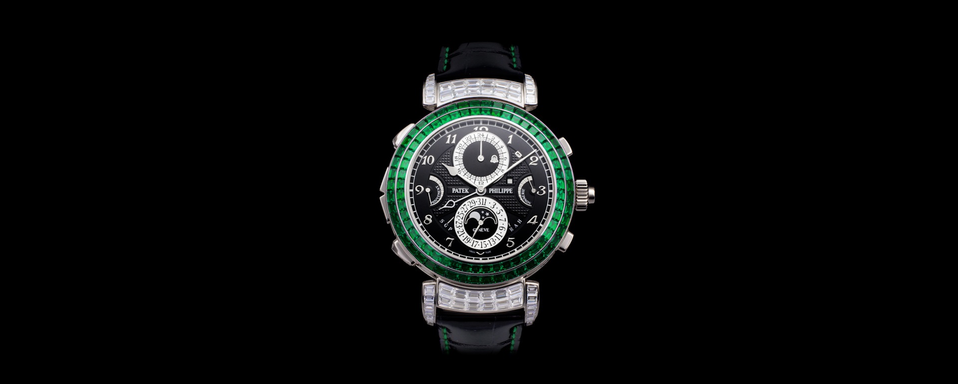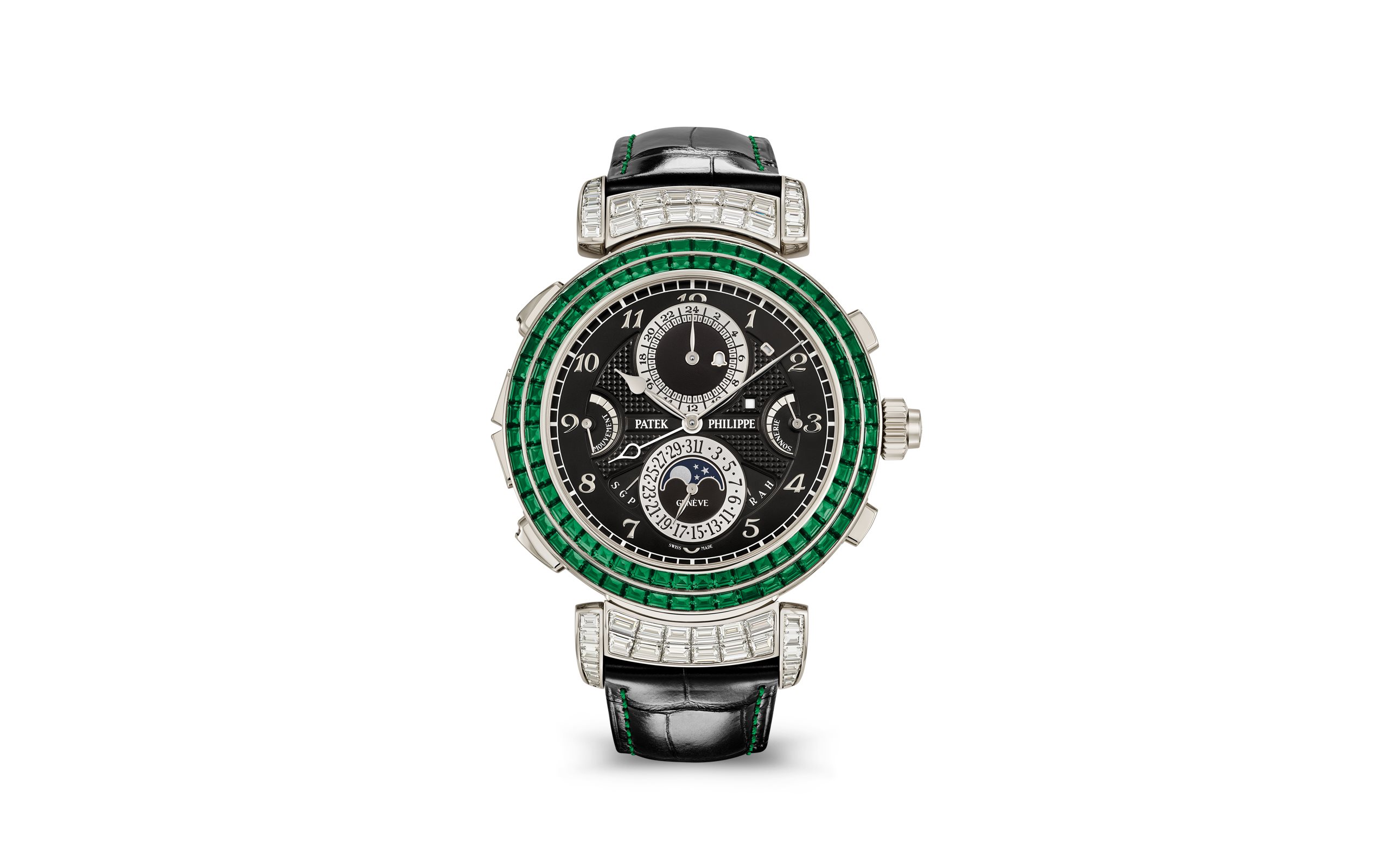 Patek Philippe has created a new alliance between Haute Horlogerie and Haute Joaillerie by reinterpreting its most complicated wristwatch in a white gold version set with 118 baguette-cut emeralds (7.87 cts) and 291 baguette-cut diamonds (20.54 cts), using the “invisible setting” technique.