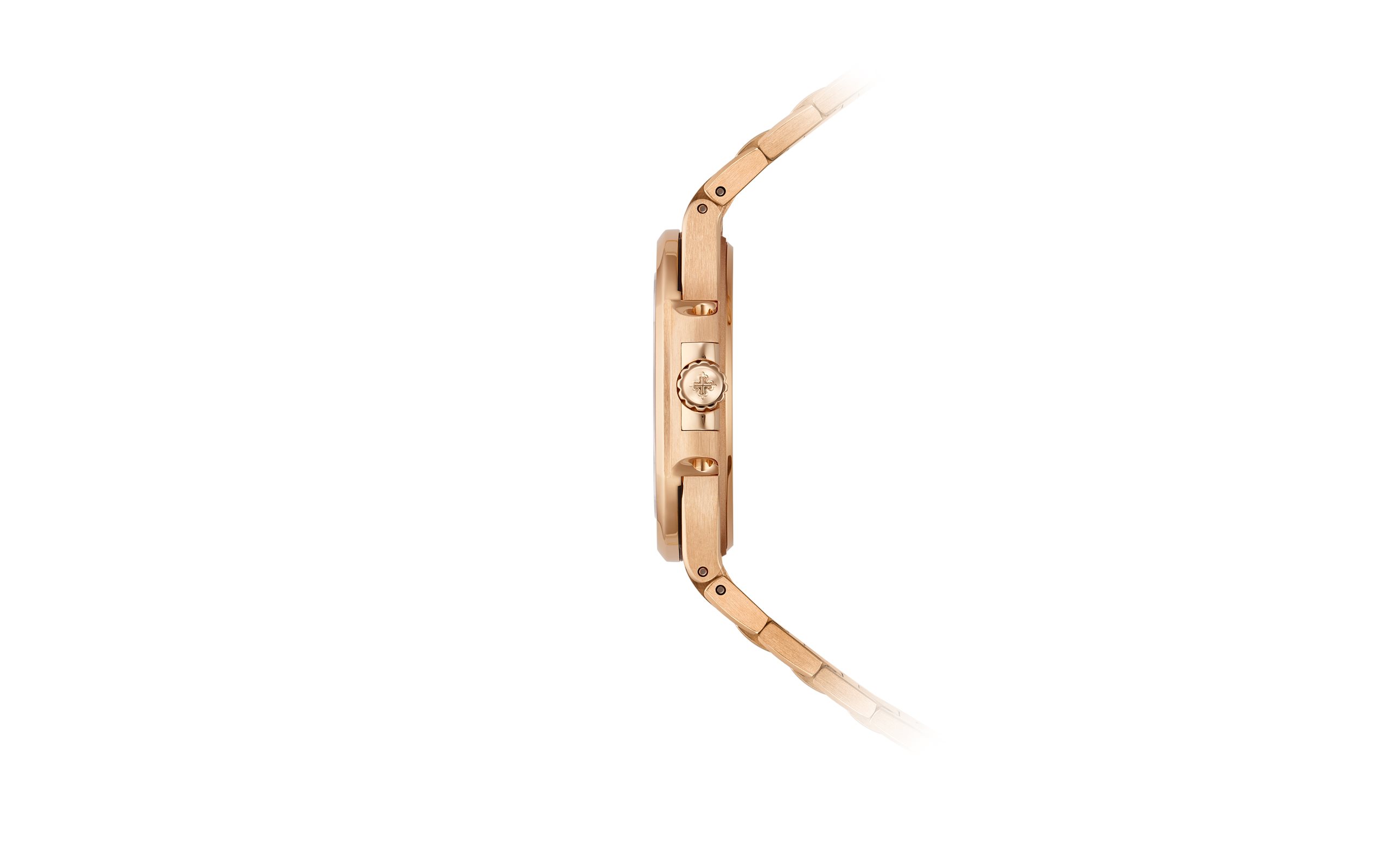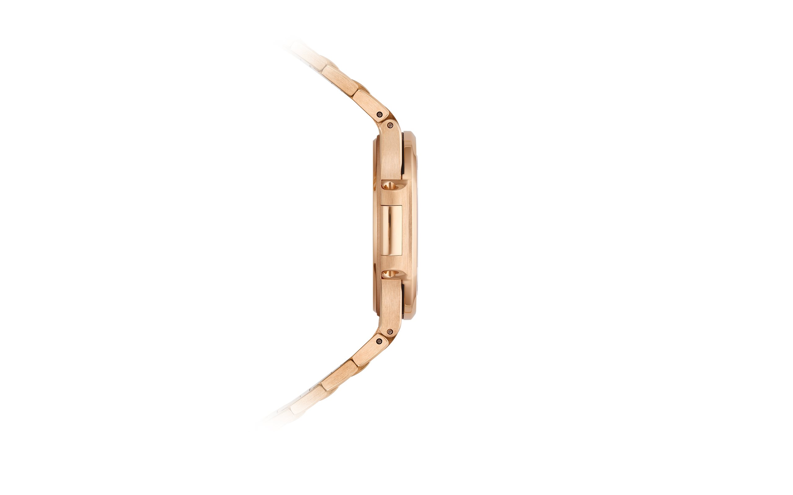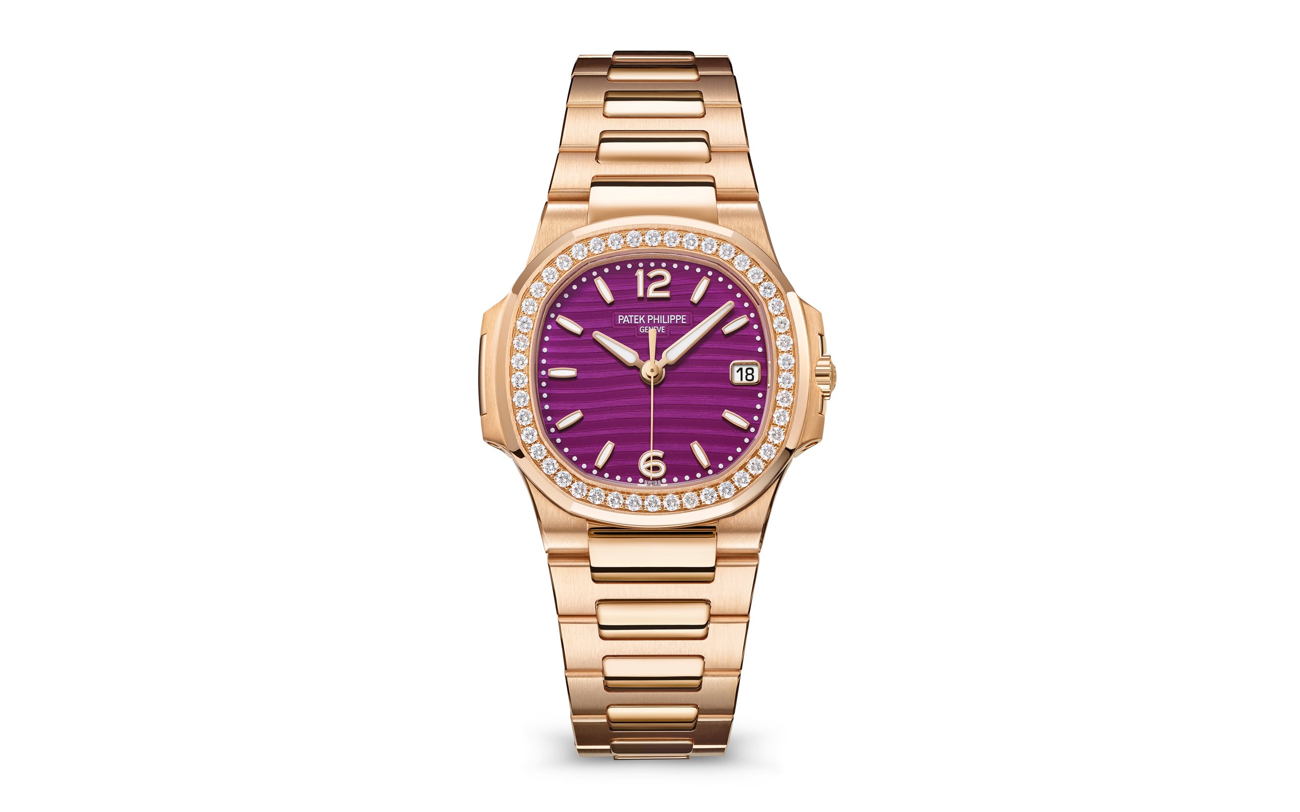 A new version of the ladies’ Nautilus watch featuring a quartz movement and a 32 mm rose gold case with matching bracelet, Reference 7010/1R-013 innovates with the purple shade of its lacquered dial bearing the wave pattern typical of this collection.
