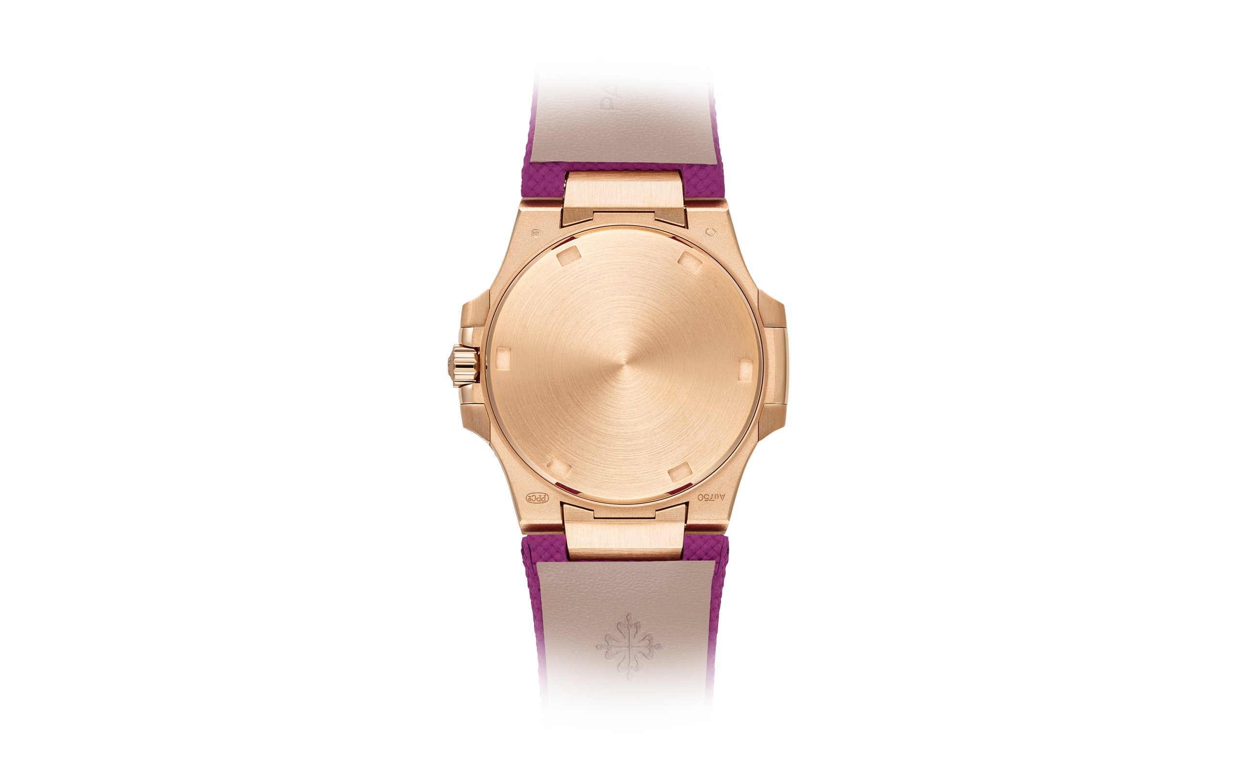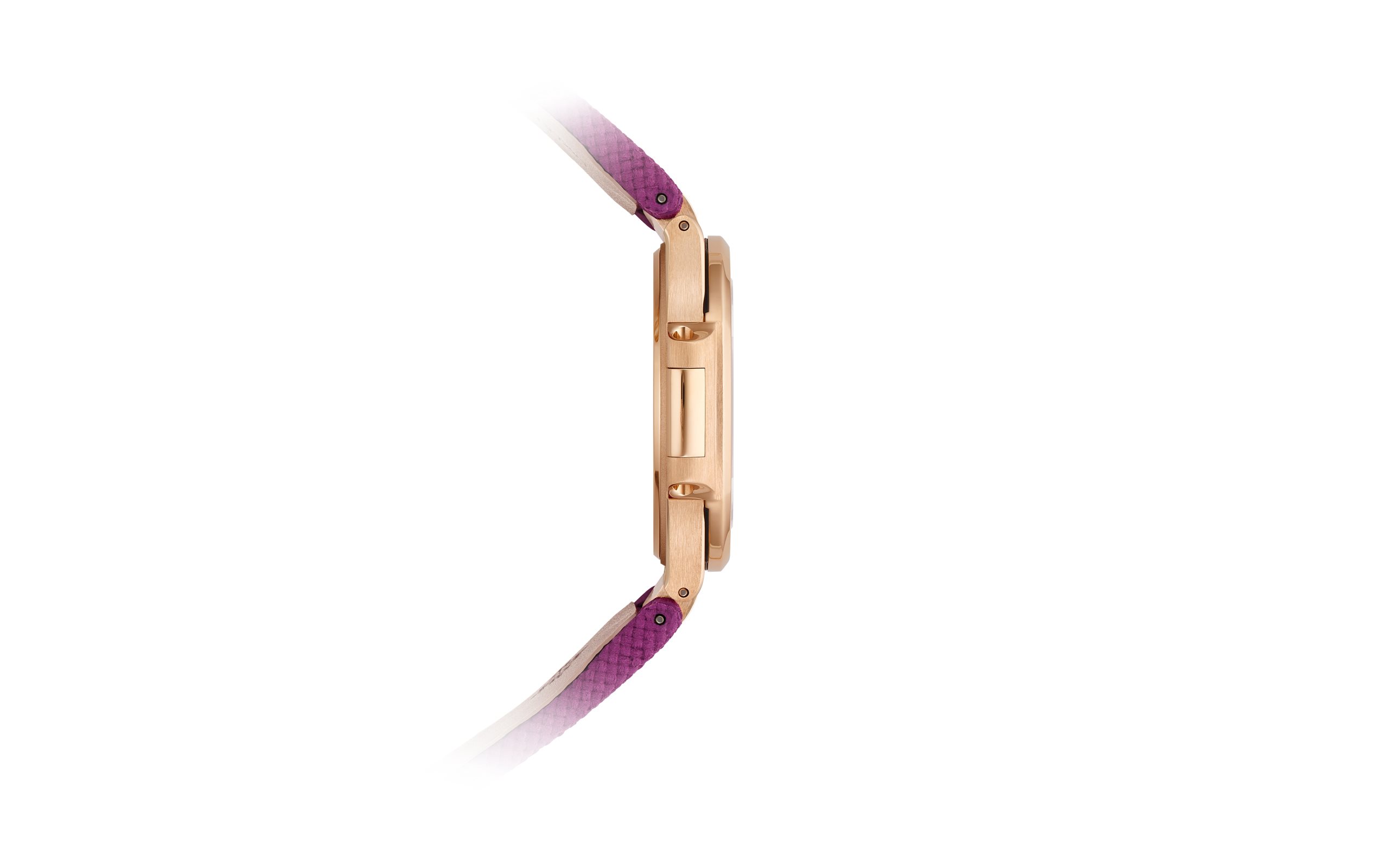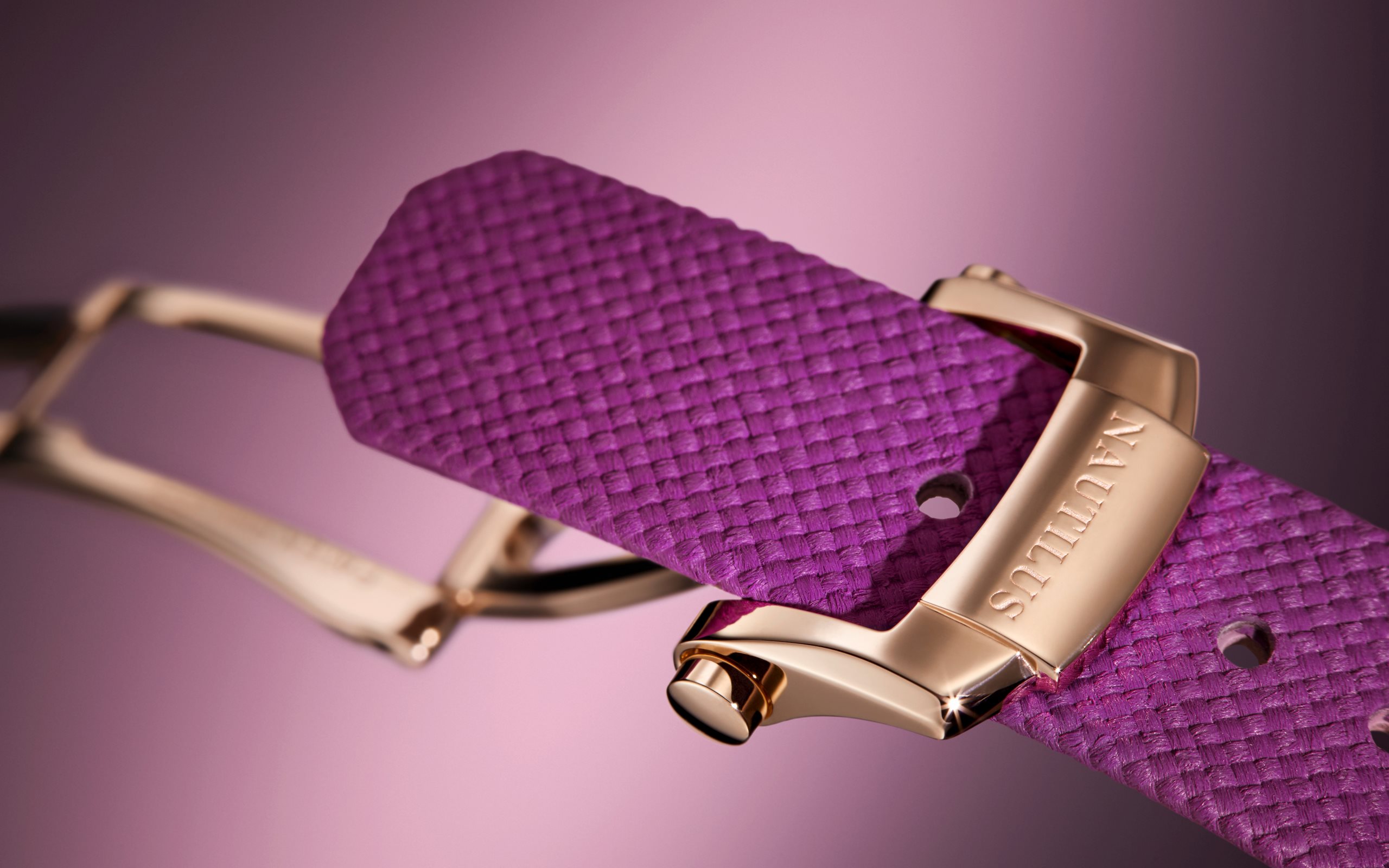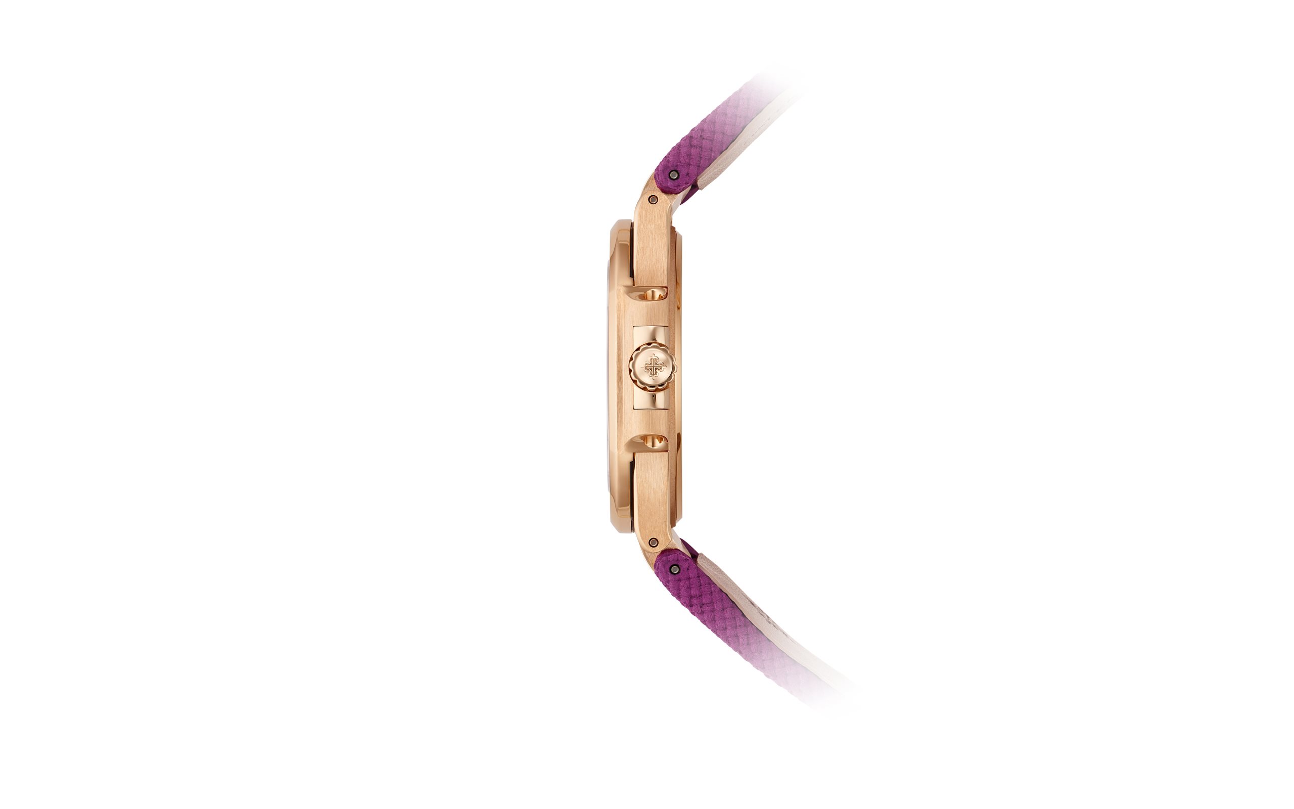 Patek Philippe reinterprets the ladies’ Nautilus quartz model with a 32 mm rose gold case and gemset bezel in a new, original and refined version. The dial is embellished with a wave pattern in an elegant purple lacquered hue. This shade is echoed on the strap in ultra-resistant composite material, with textile motif and rose gold Nautilus fold-over clasp.
