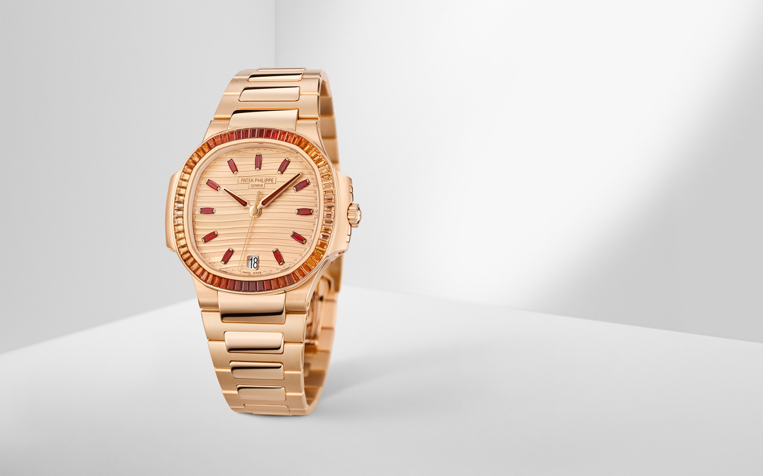 Patek Philippe presents a new ladies’ Nautilus jewelry version in which rose gold harmonizes distinctively with the luster of spessartite gems.