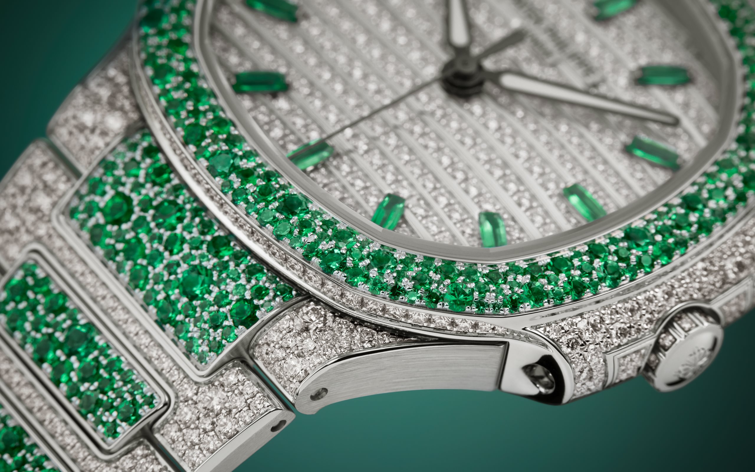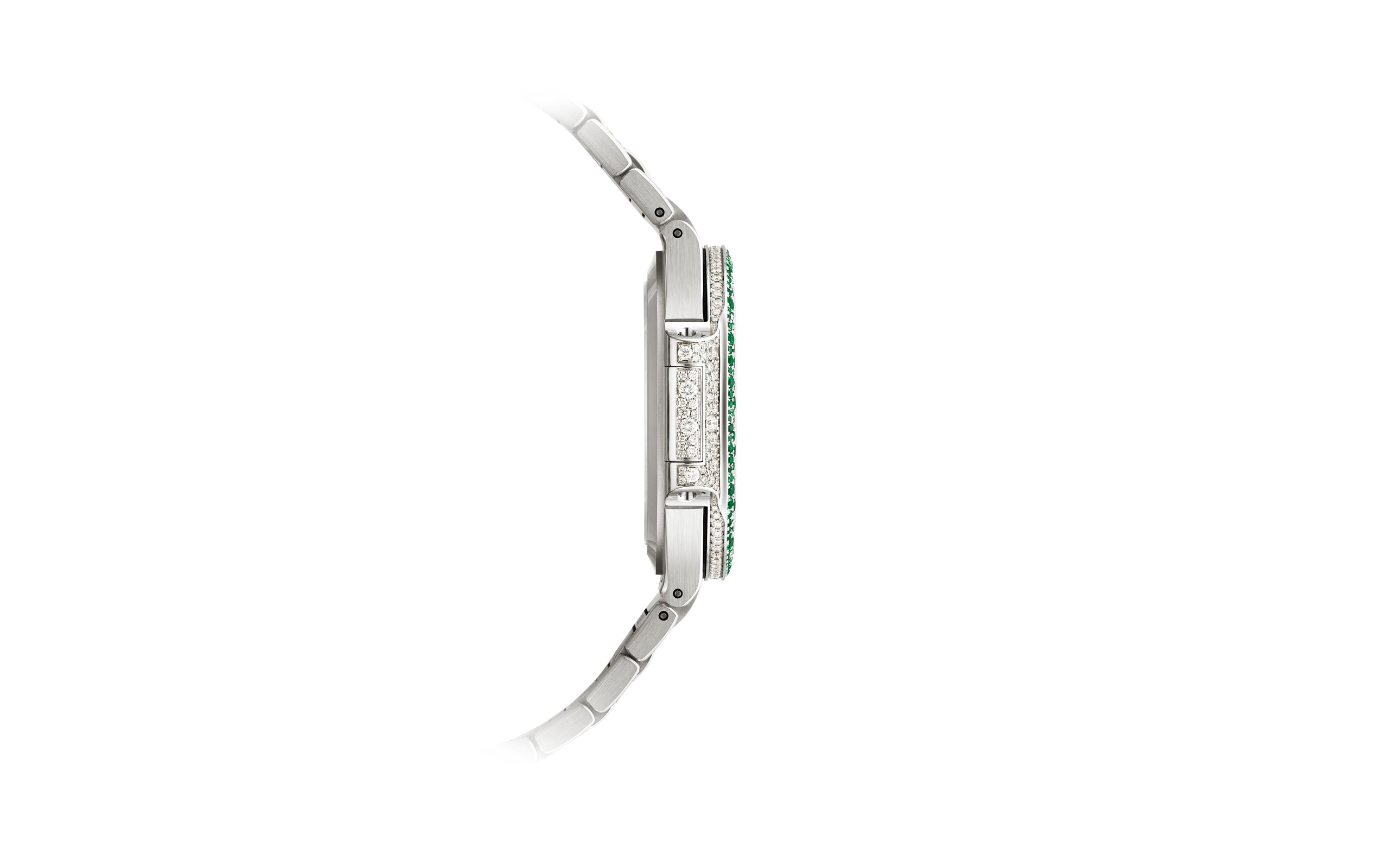 - Paved with diamonds,“wave” pattern, ogival-shaped white gold hour markers set with emeralds