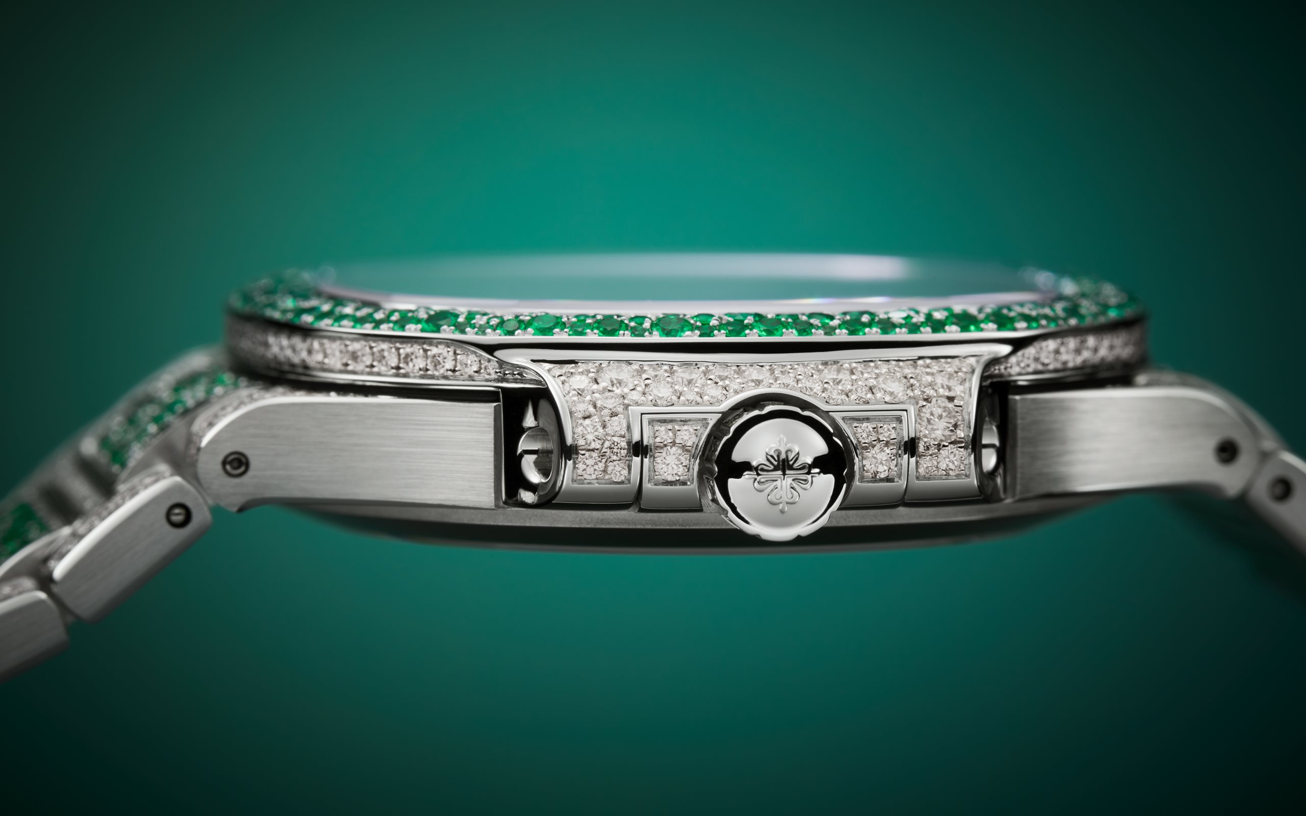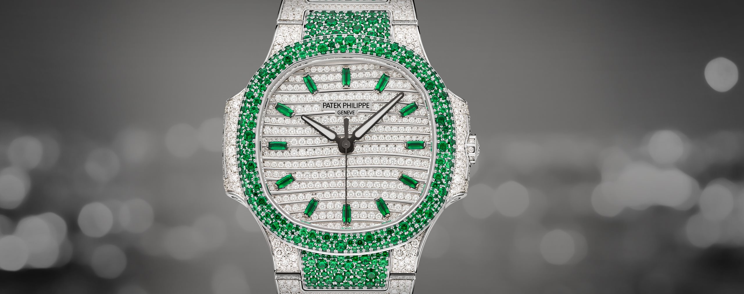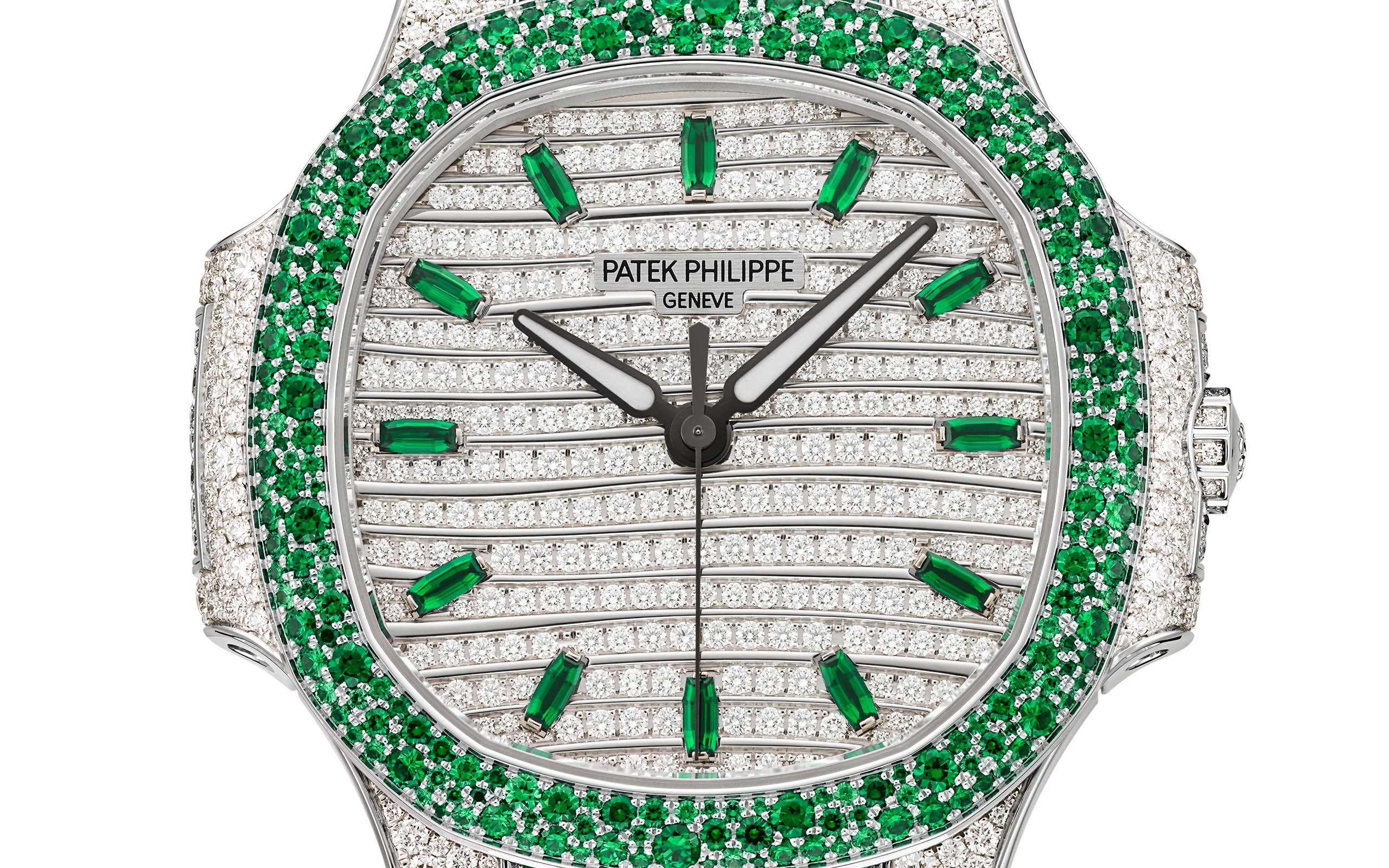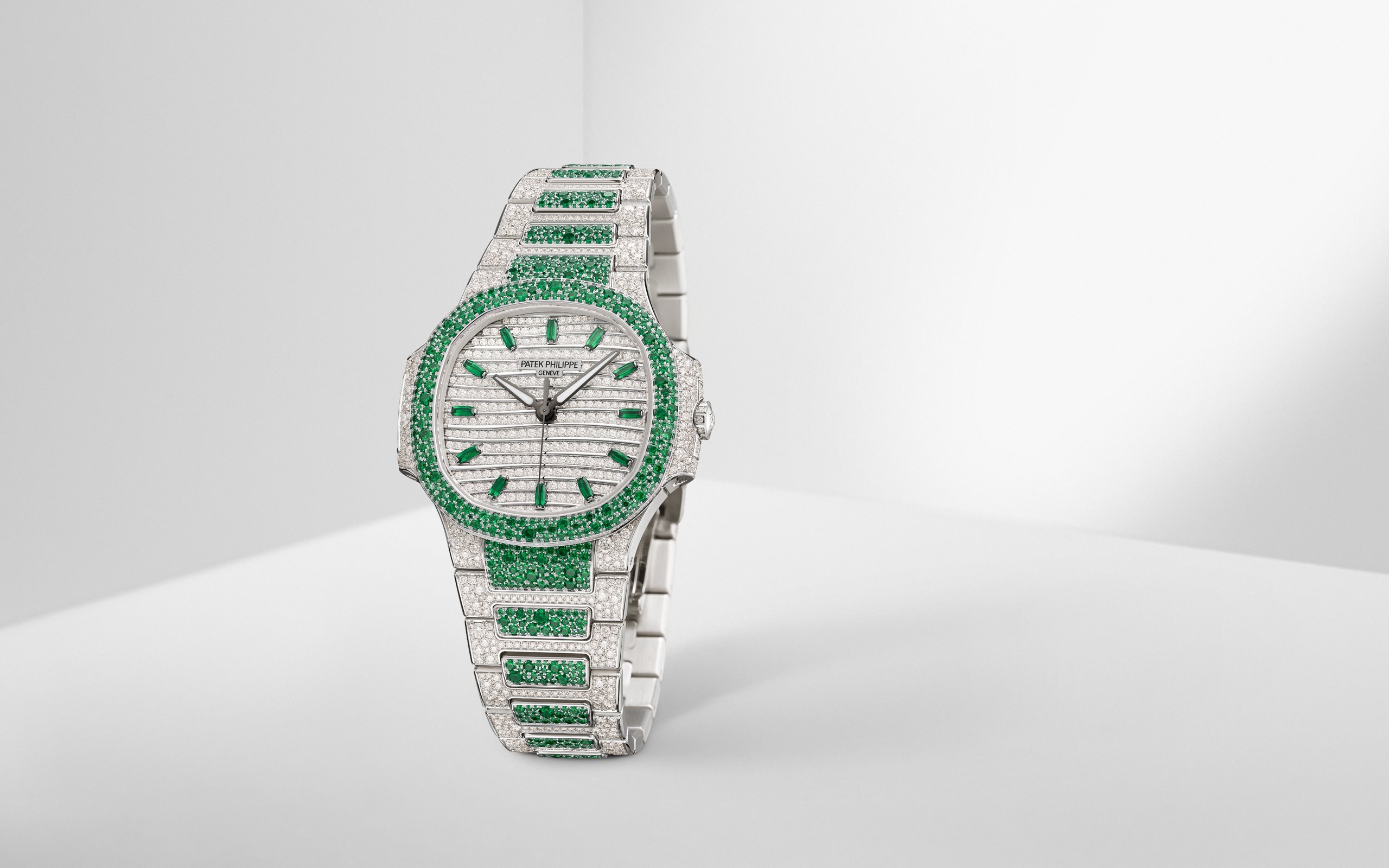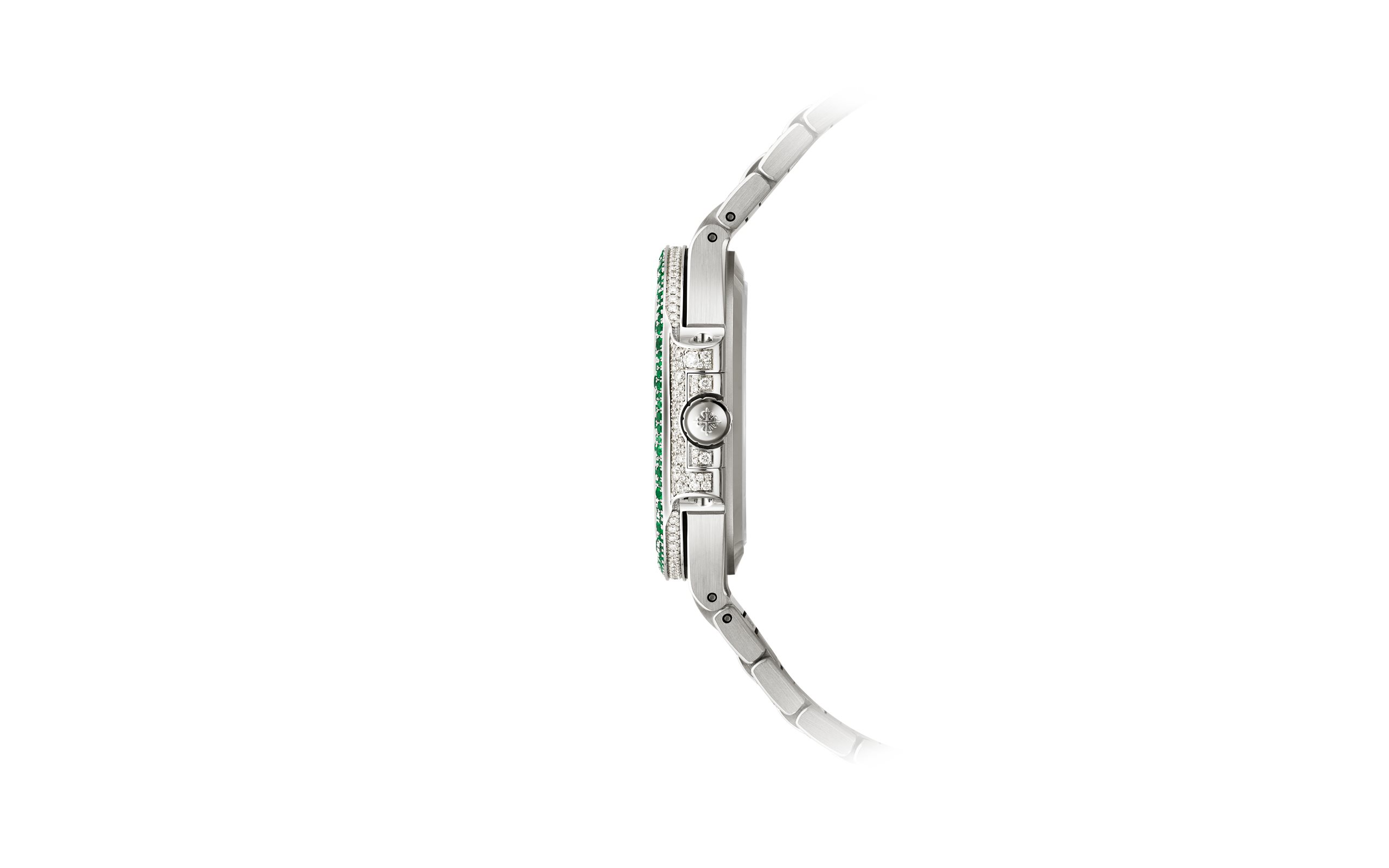 Patek Philippe offers a new alliance between "elegant sports" design and Haute Joaillerie in a ladies’ Nautilus watch adorned with 1,500 brilliant-cut diamonds (6.53 cts) and 876 emeralds (3.68 cts), with a snow-set case, bezel and bracelet. The emerald-set bezel and inner links of the bracelet magnify the inimitable geometry of the Nautilus.