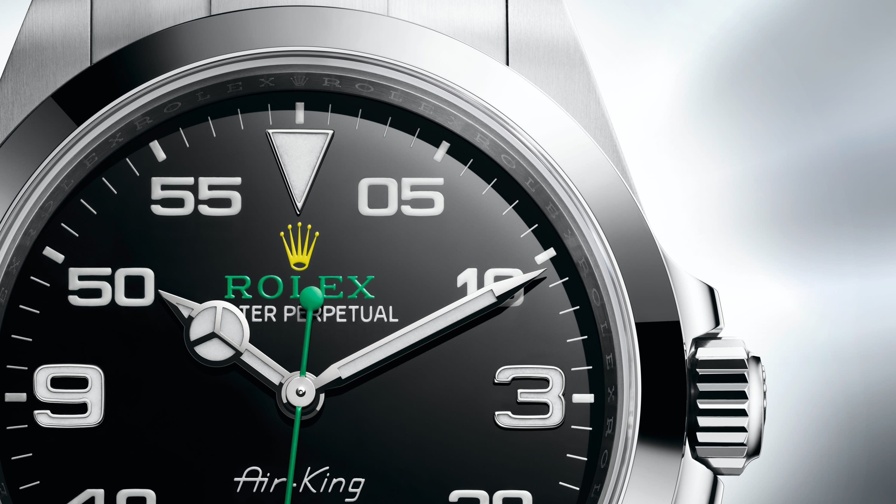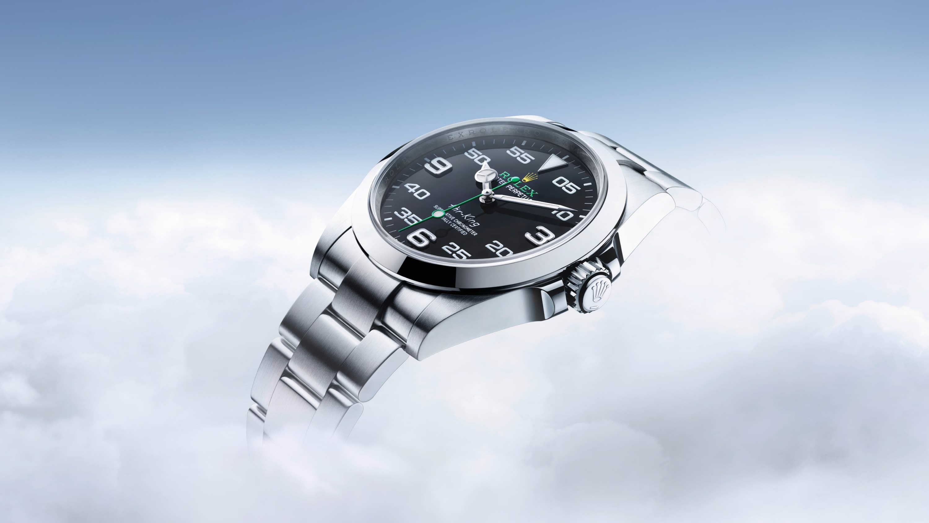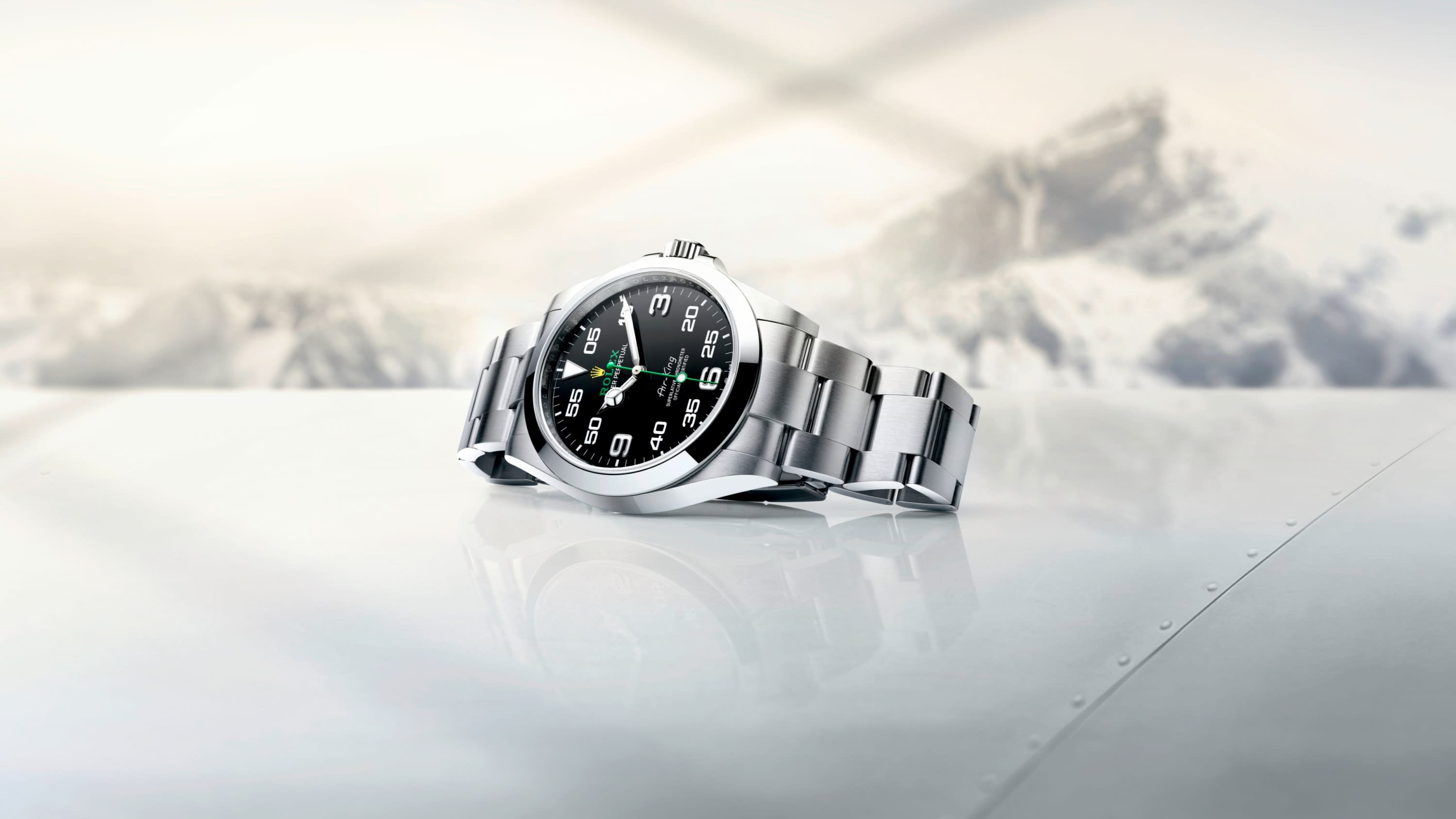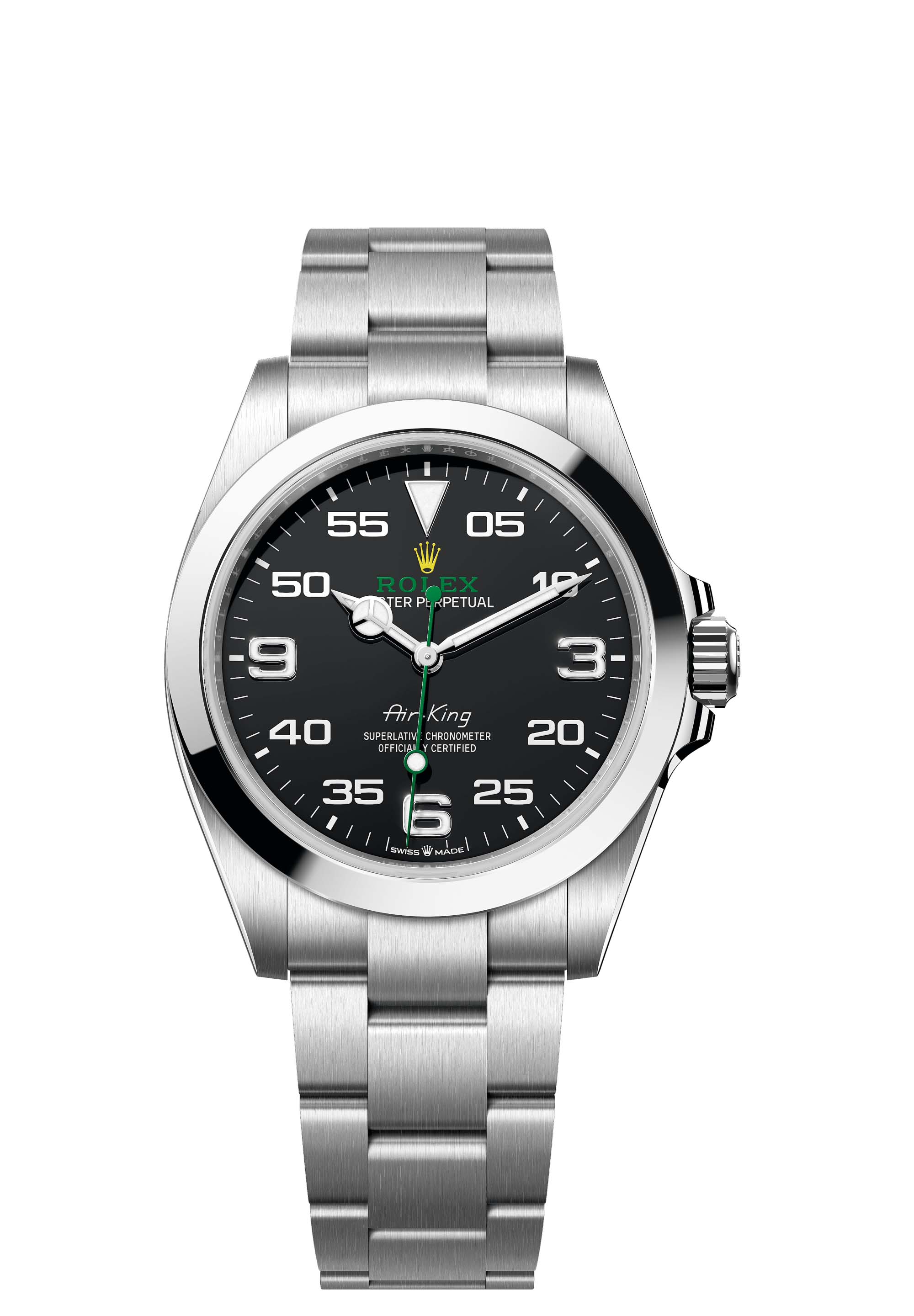 With its 40 mm case in Oystersteel, solid-link Oyster bracelet, and distinctive black dial, the Air-King perpetuates the aeronautical heritage of the original Rolex Oyster.