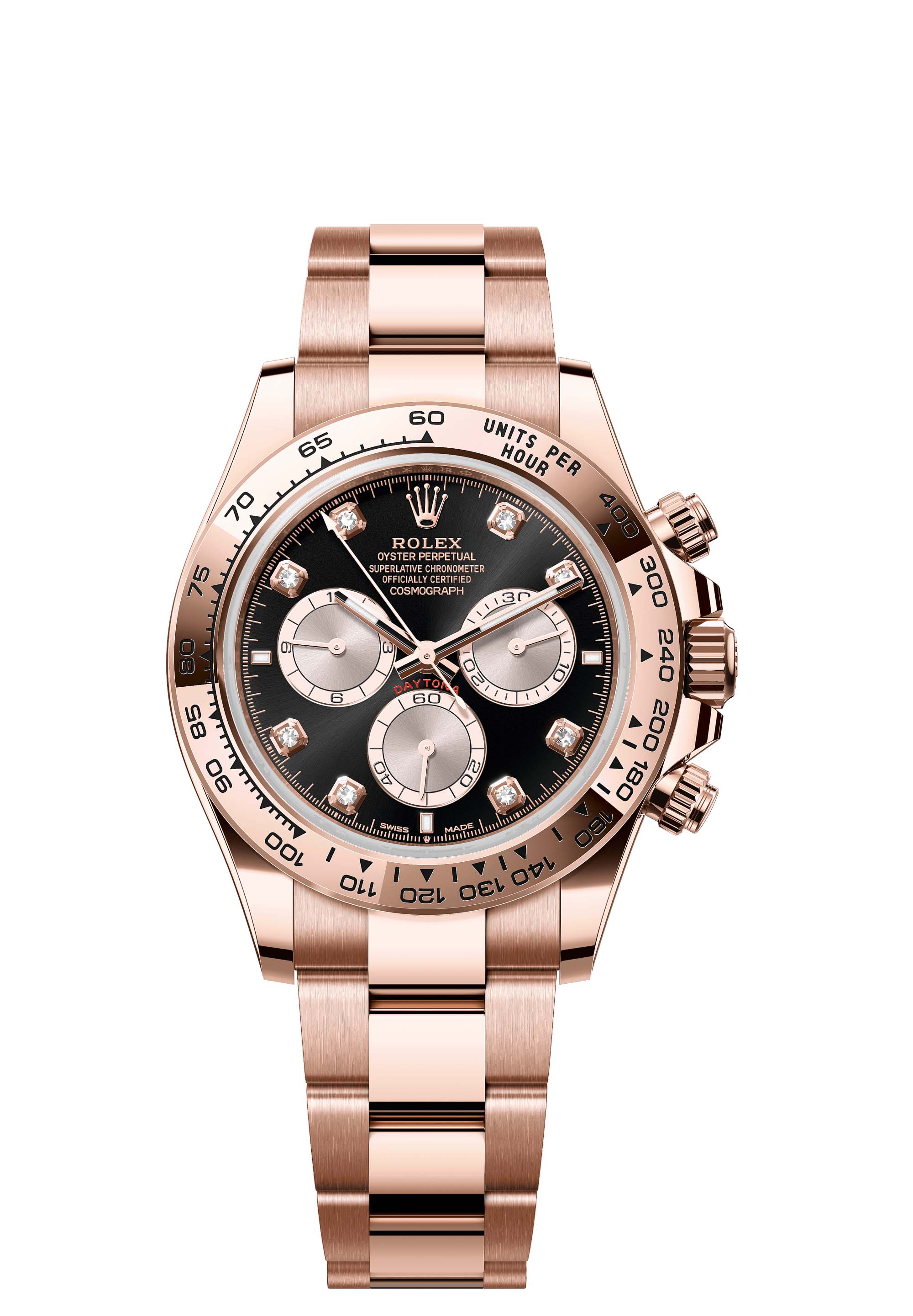 This Oyster Perpetual Cosmograph Daytona in 18 ct Everose gold, with a bright black and Sundust, diamond-set dial and an Oyster bracelet, features an 18 ct Everose gold bezel with an engraved tachymetric scale.