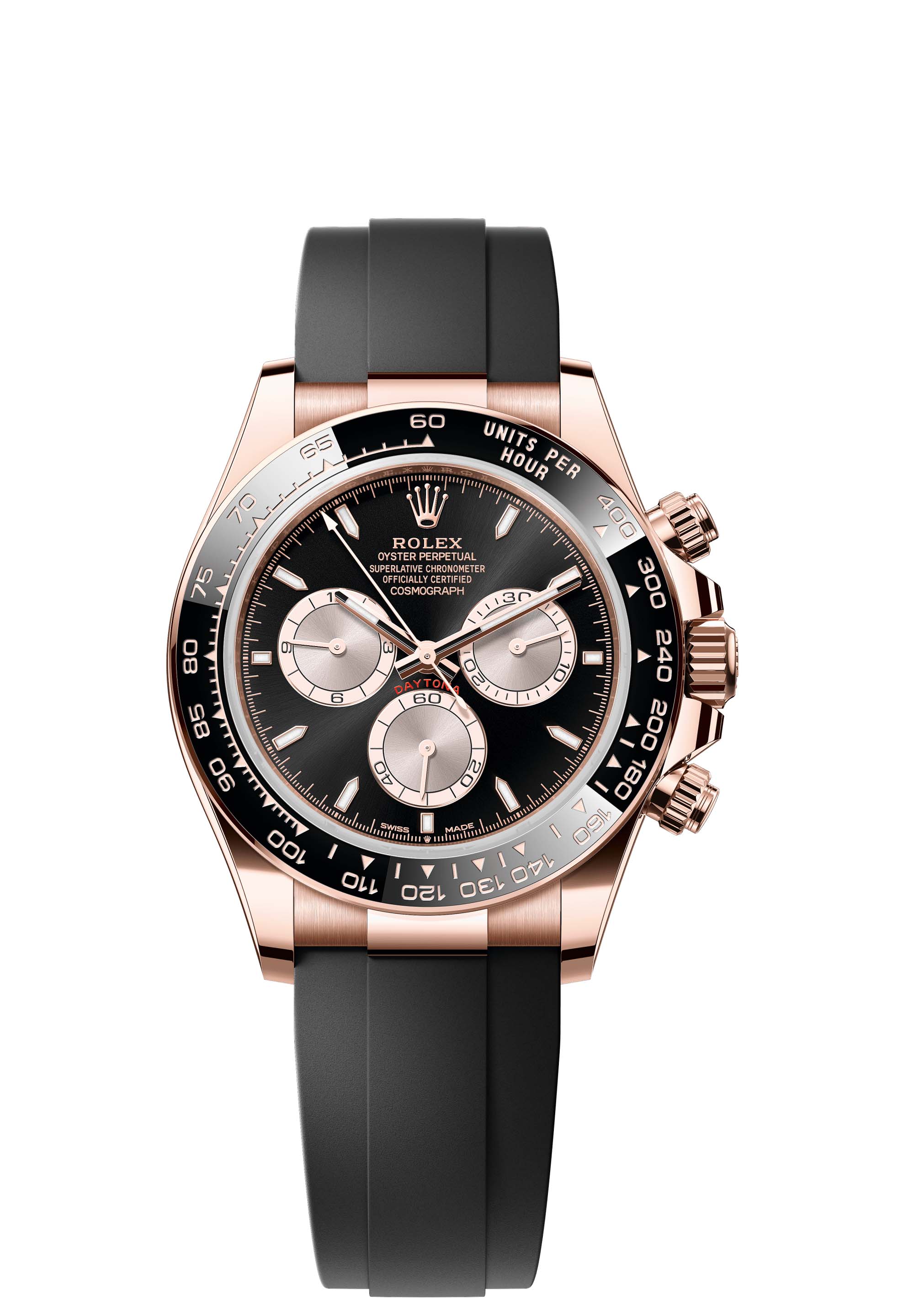 This Oyster Perpetual Cosmograph Daytona in 18 ct Everose gold, with a bright black and Sundust dial and an Oysterflex bracelet, features a black Cerachrom bezel with tachymetric scale.