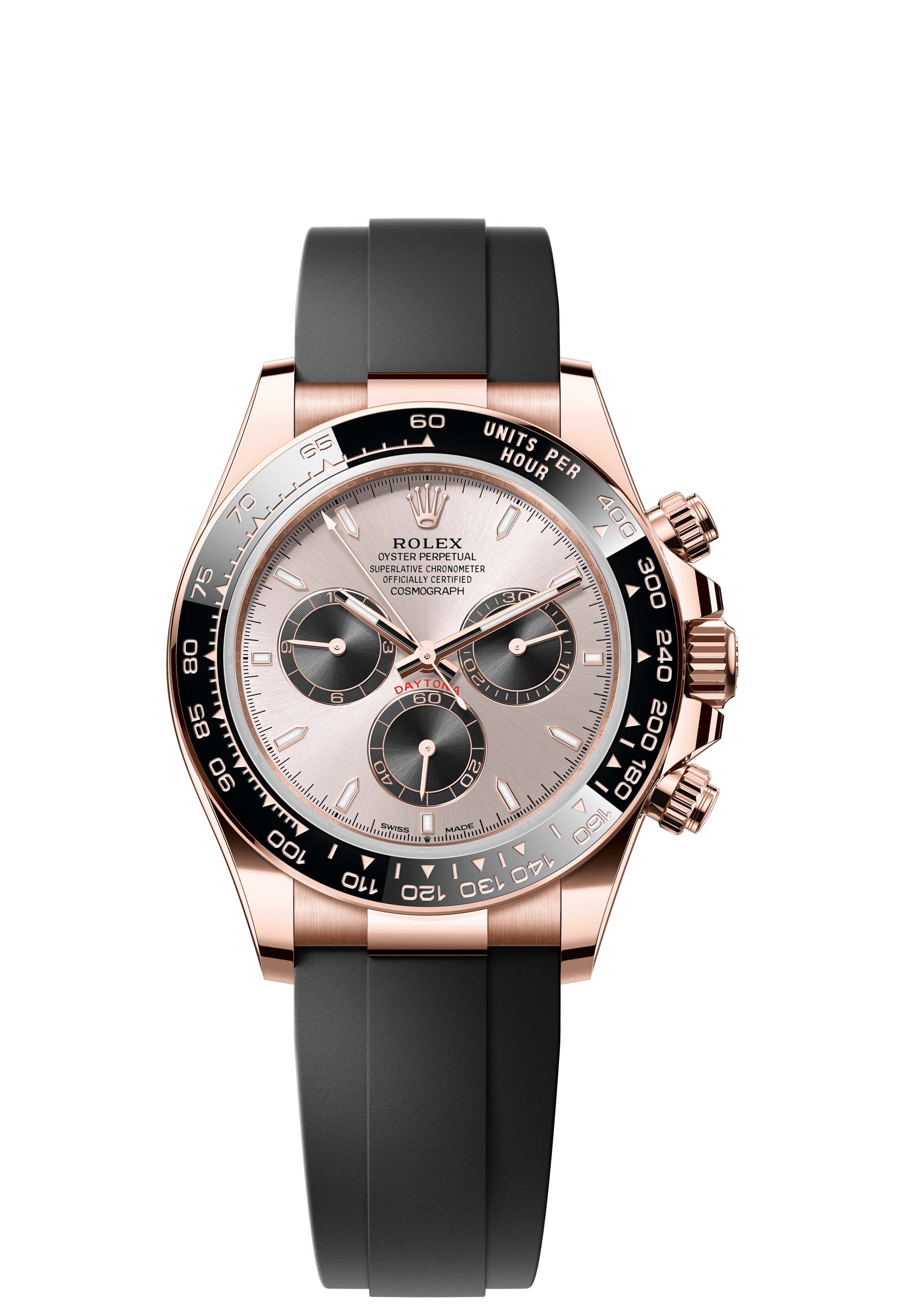 This Oyster Perpetual Cosmograph Daytona in 18 ct Everose gold, with a Sundust and bright black dial and an Oysterflex bracelet, features a black Cerachrom bezel with tachymetric scale.