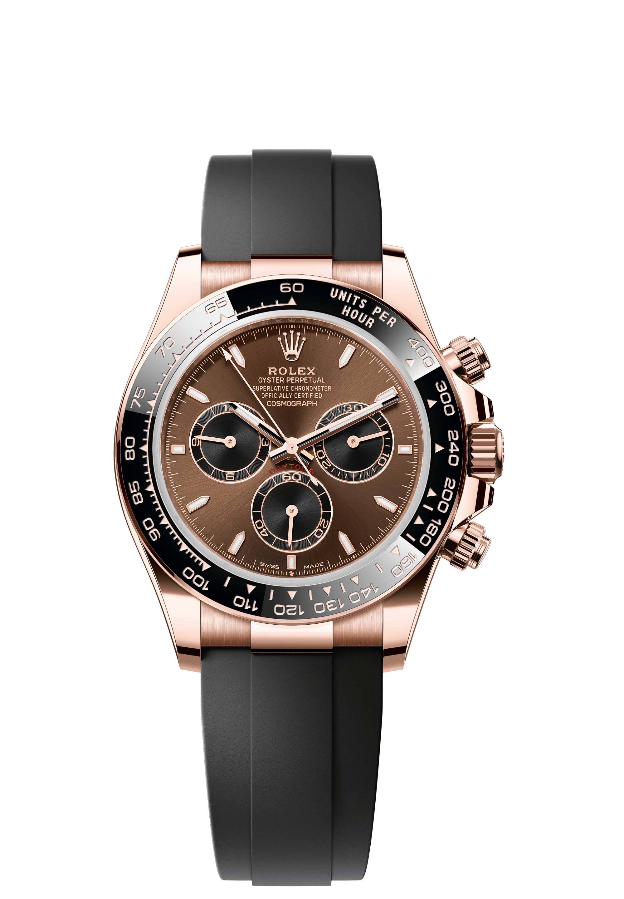 This Oyster Perpetual Cosmograph Daytona in 18 ct Everose gold, with a chocolate and black dial and an Oysterflex bracelet, features a black Cerachrom bezel with tachymetric scale.