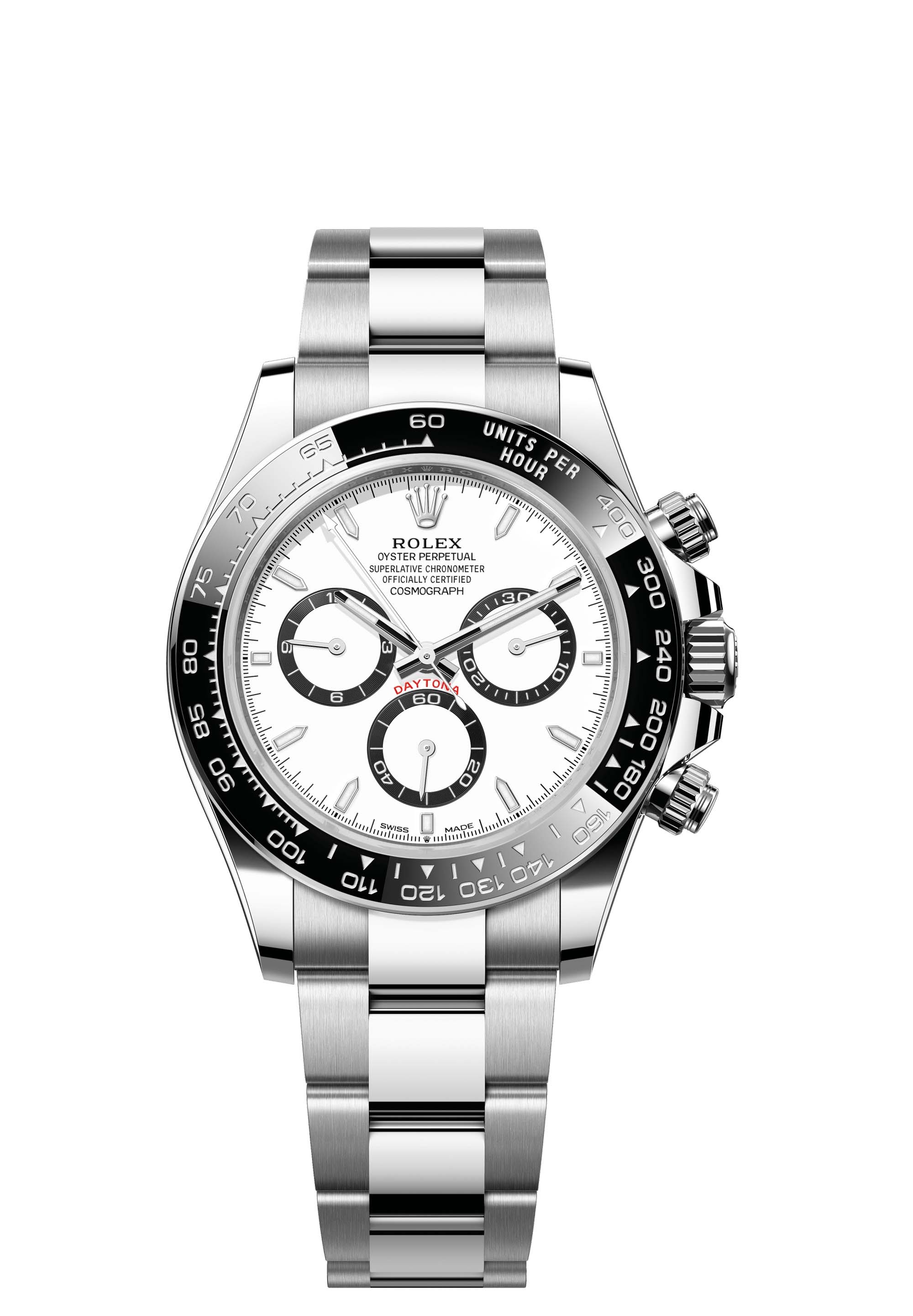 The Oyster Perpetual Cosmograph Daytona in Oystersteel with a white dial and contrasting counter rings. It features an Oyster bracelet and a black Cerachrom bezel with tachymetric scale.