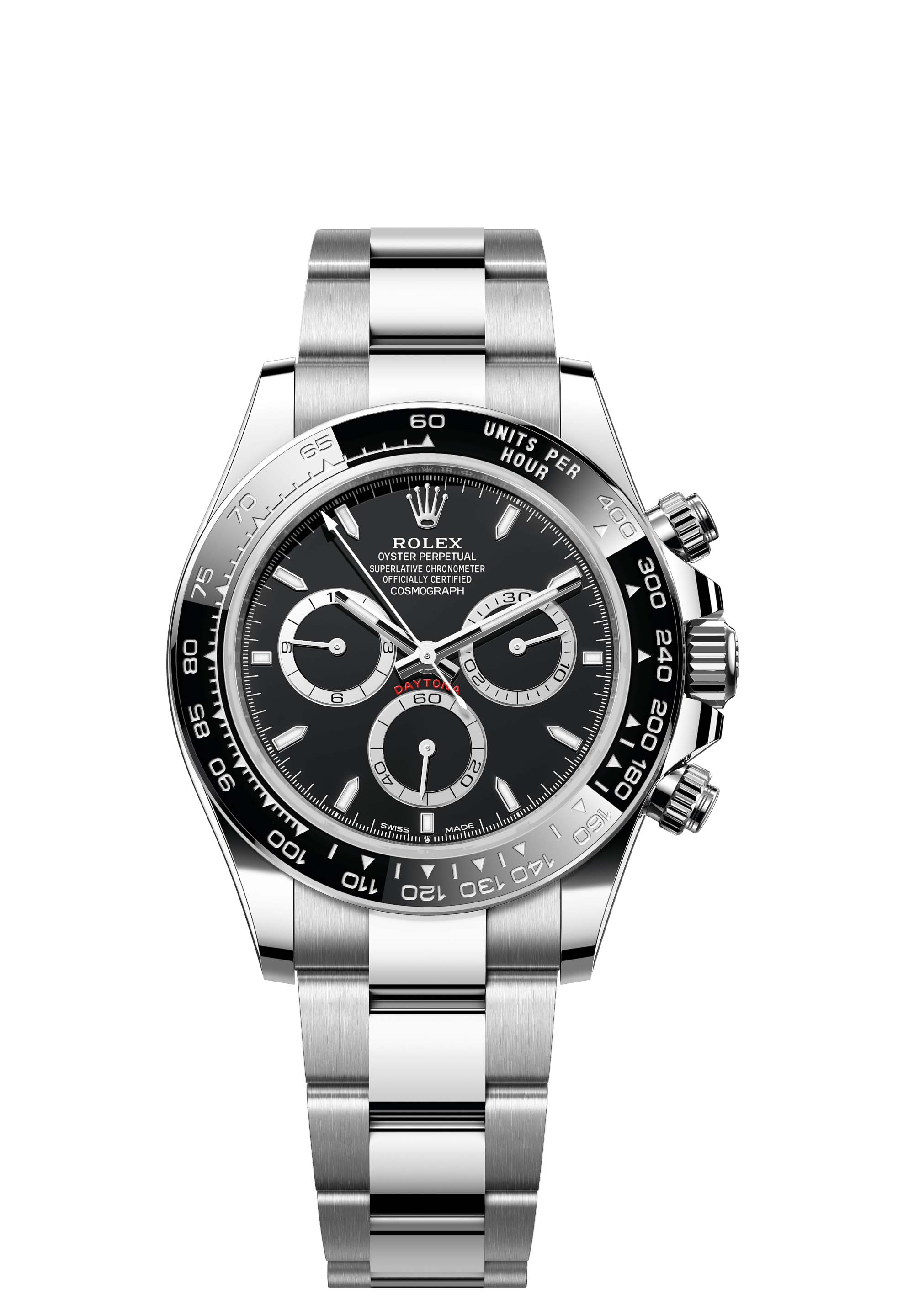 The Oyster Perpetual Cosmograph Daytona in Oystersteel with a black dial and contrasting counter rings. It features an Oyster bracelet and a black Cerachrom bezel with tachymetric scale.