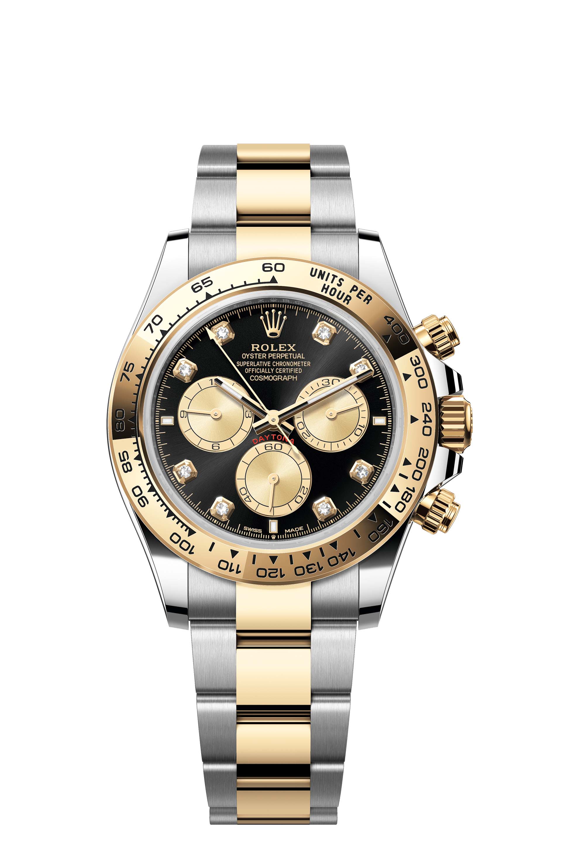 This Oyster Perpetual Cosmograph Daytona in Oystersteel and yellow gold, with a bright black and golden, diamond-set dial and an Oyster bracelet, features a yellow gold bezel with an engraved tachymetric scale.