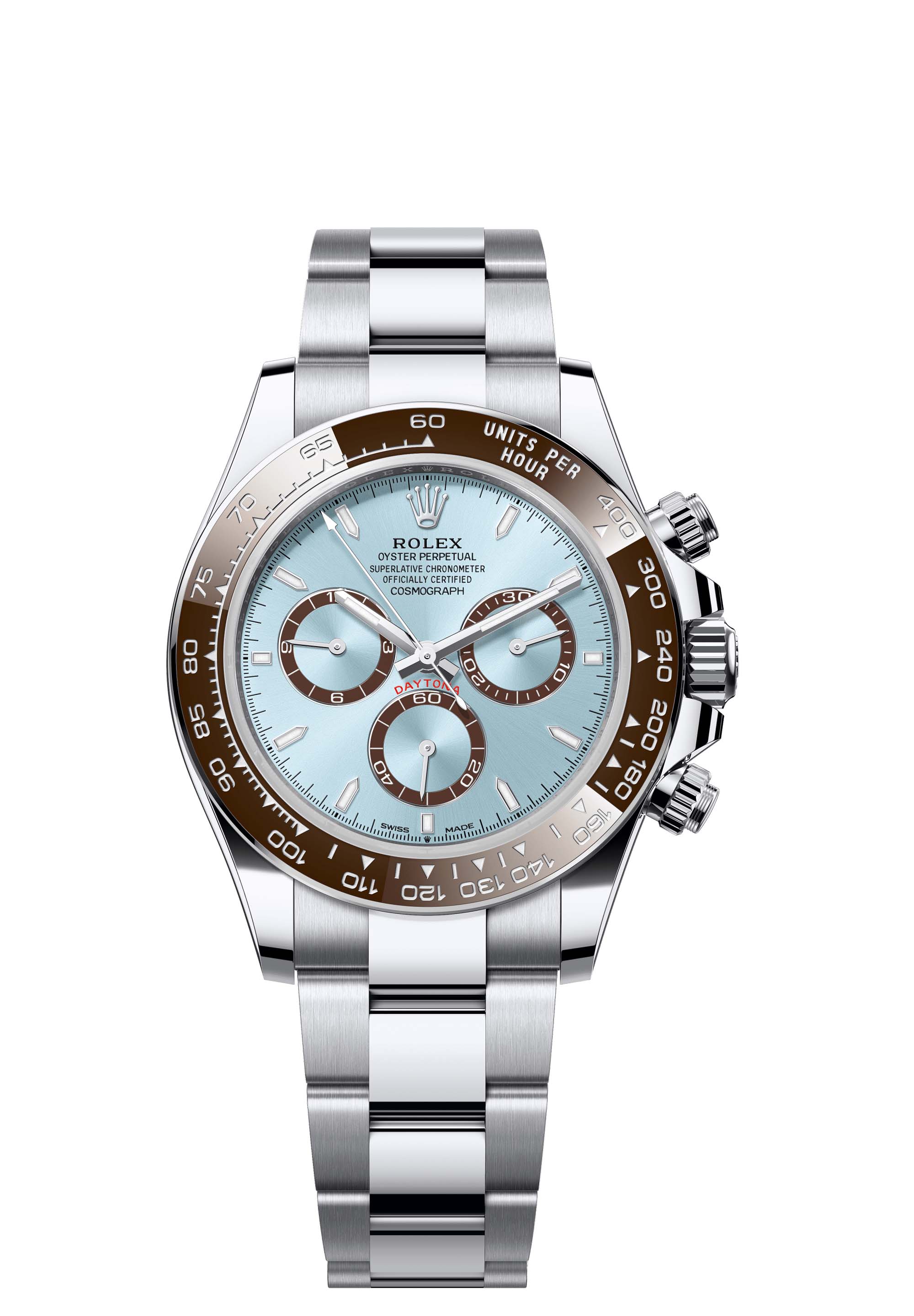 The Oyster Perpetual Cosmograph Daytona in platinum with an ice-blue dial and contrasting counter rings. It features an Oyster bracelet and a chestnut brown Cerachrom bezel with tachymetric scale.