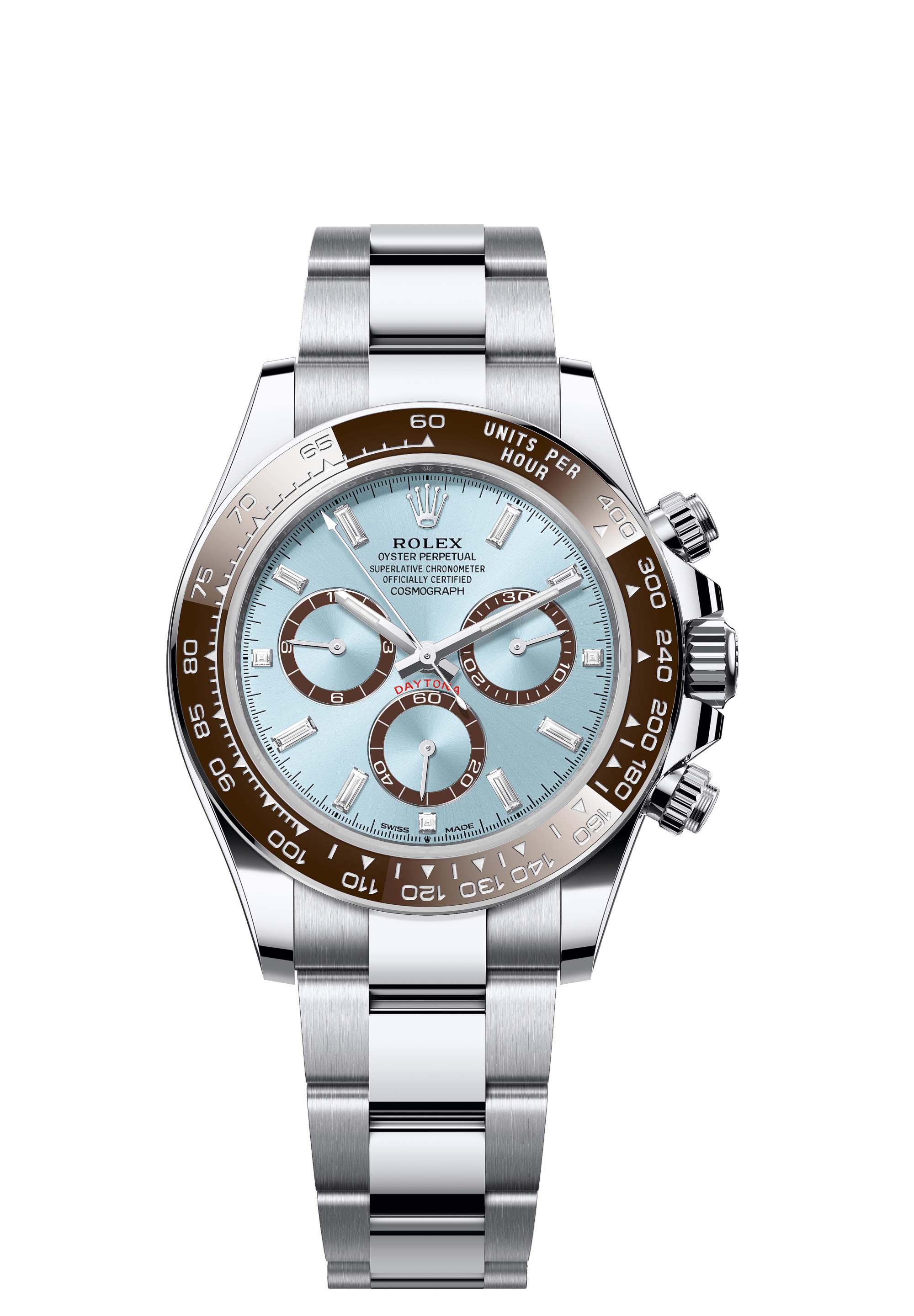 The Oyster Perpetual Cosmograph Daytona in platinum with an ice-blue, diamond-set dial and contrasting counter rings. It features an Oyster bracelet and a chestnut brown Cerachrom bezel with tachymetric scale.