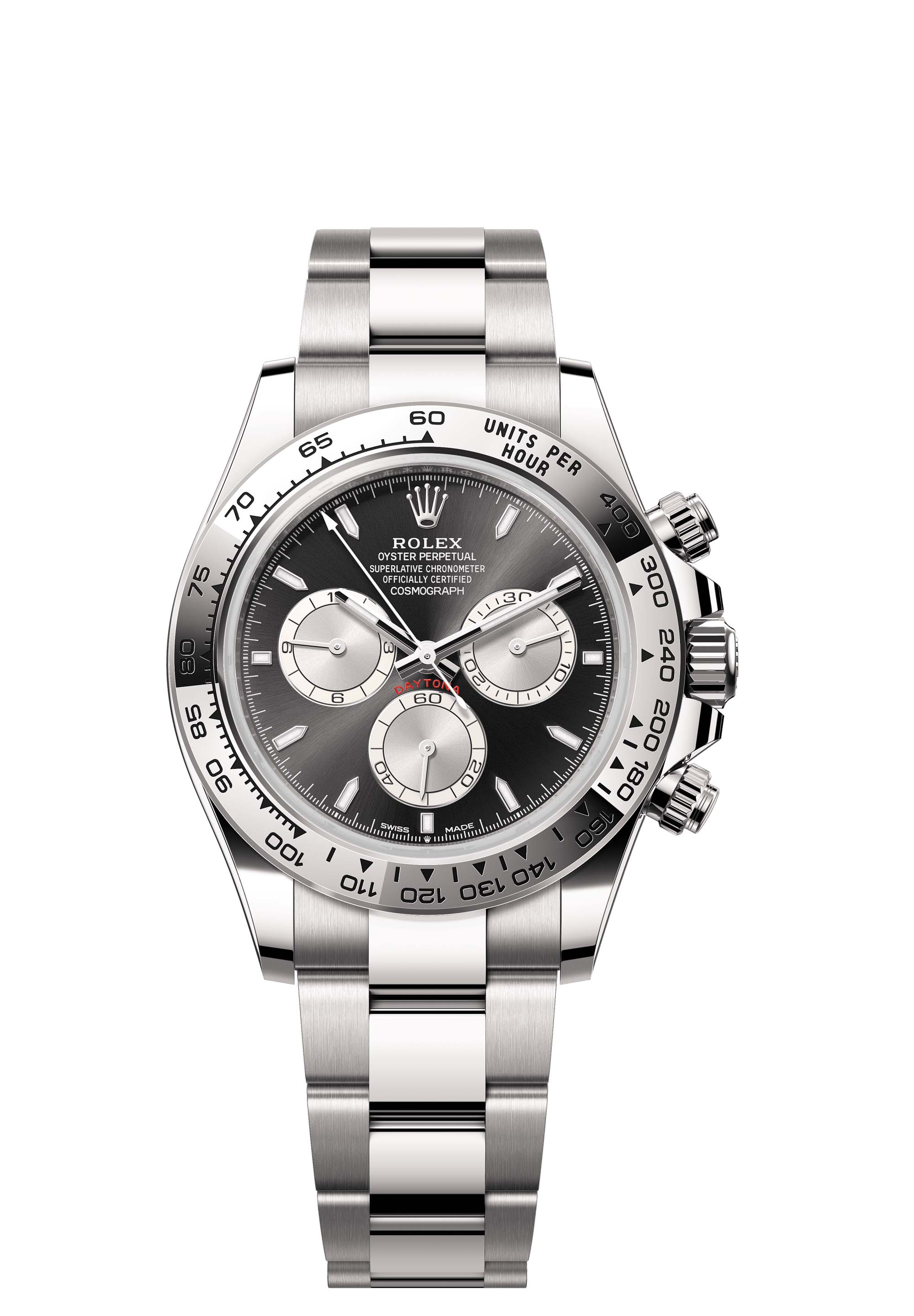 With its tachymetric scale, its three counters and its pushers, the Cosmograph Daytona was designed to be the ultimate timing tool for endurance racing drivers. The bezel features a tachymetric scale to read average speed over a given distance based on elapsed time. This scale offers optimal legibility, making the Cosmograph Daytona the ideal instrument for measuring speeds up to 400 units per hour, expressed in kilometres or miles.