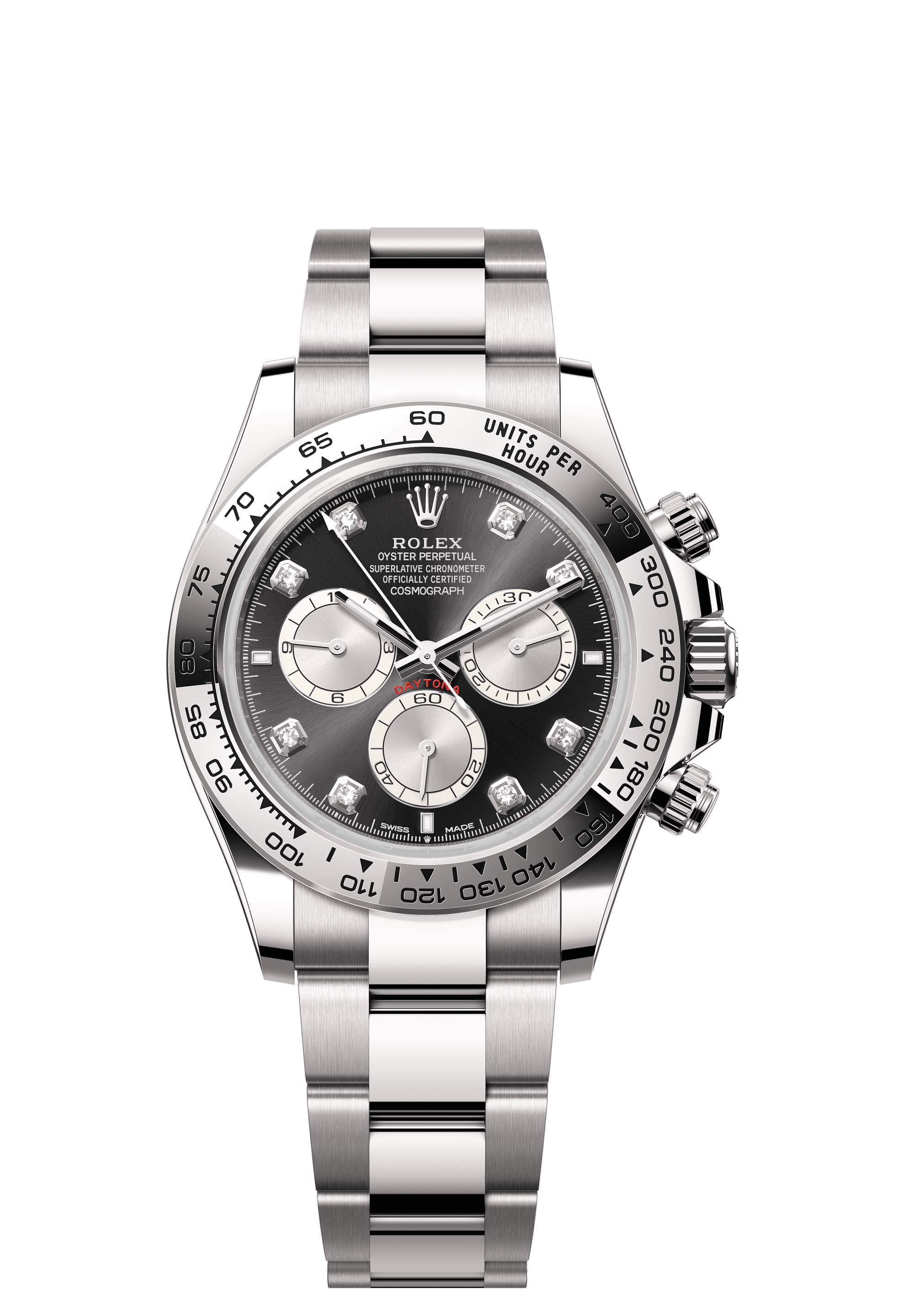 This Oyster Perpetual Cosmograph Daytona in 18 ct white gold, with a bright black and steel, diamond-set dial and an Oyster bracelet, features an 18 ct white gold bezel with an engraved tachymetric scale.