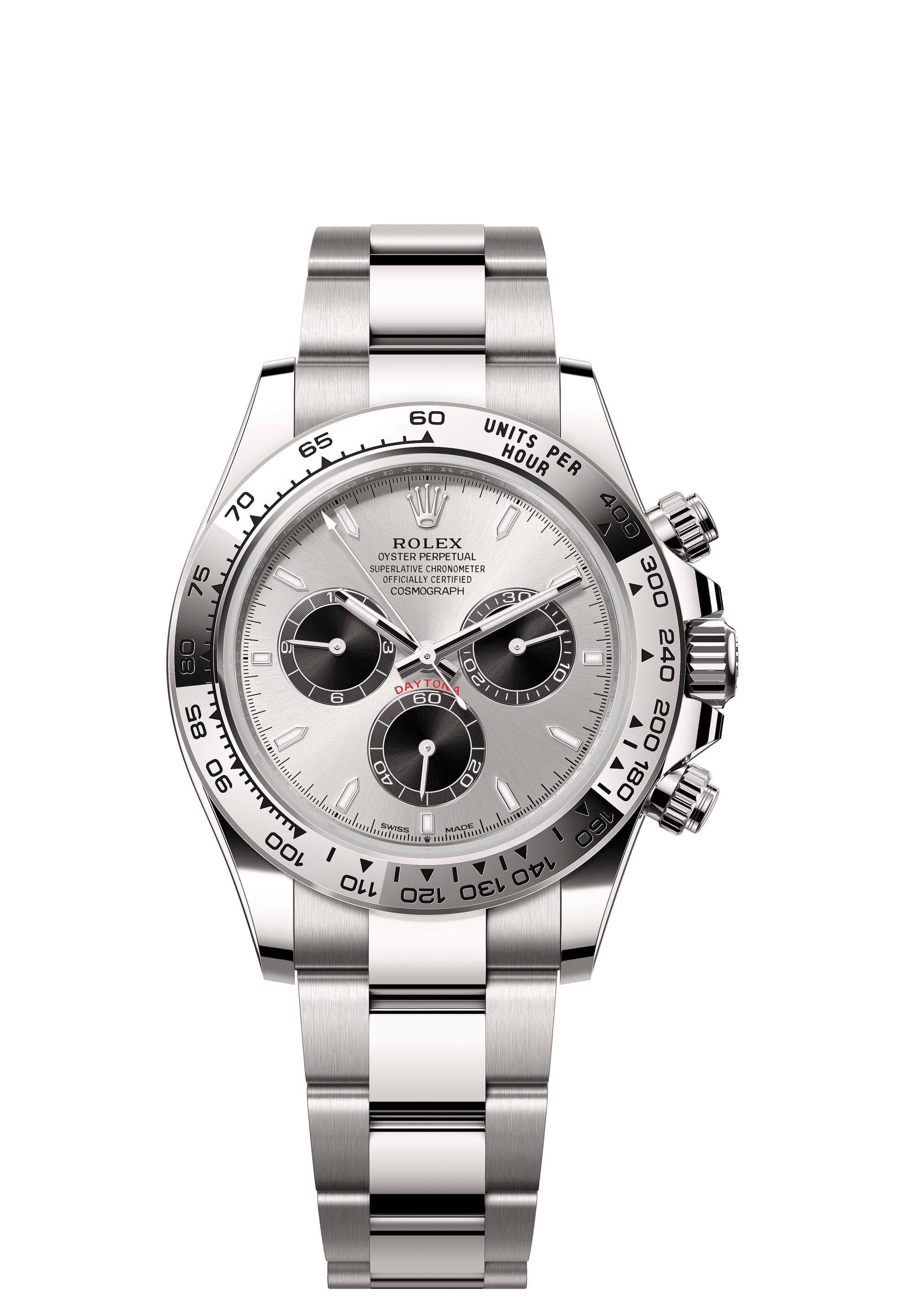 With its tachymetric scale, its three counters and its pushers, the Cosmograph Daytona was designed to be the ultimate timing tool for endurance racing drivers. The bezel features a tachymetric scale to read average speed over a given distance based on elapsed time. This scale offers optimal legibility, making the Cosmograph Daytona the ideal instrument for measuring speeds up to 400 units per hour, expressed in kilometres or miles.