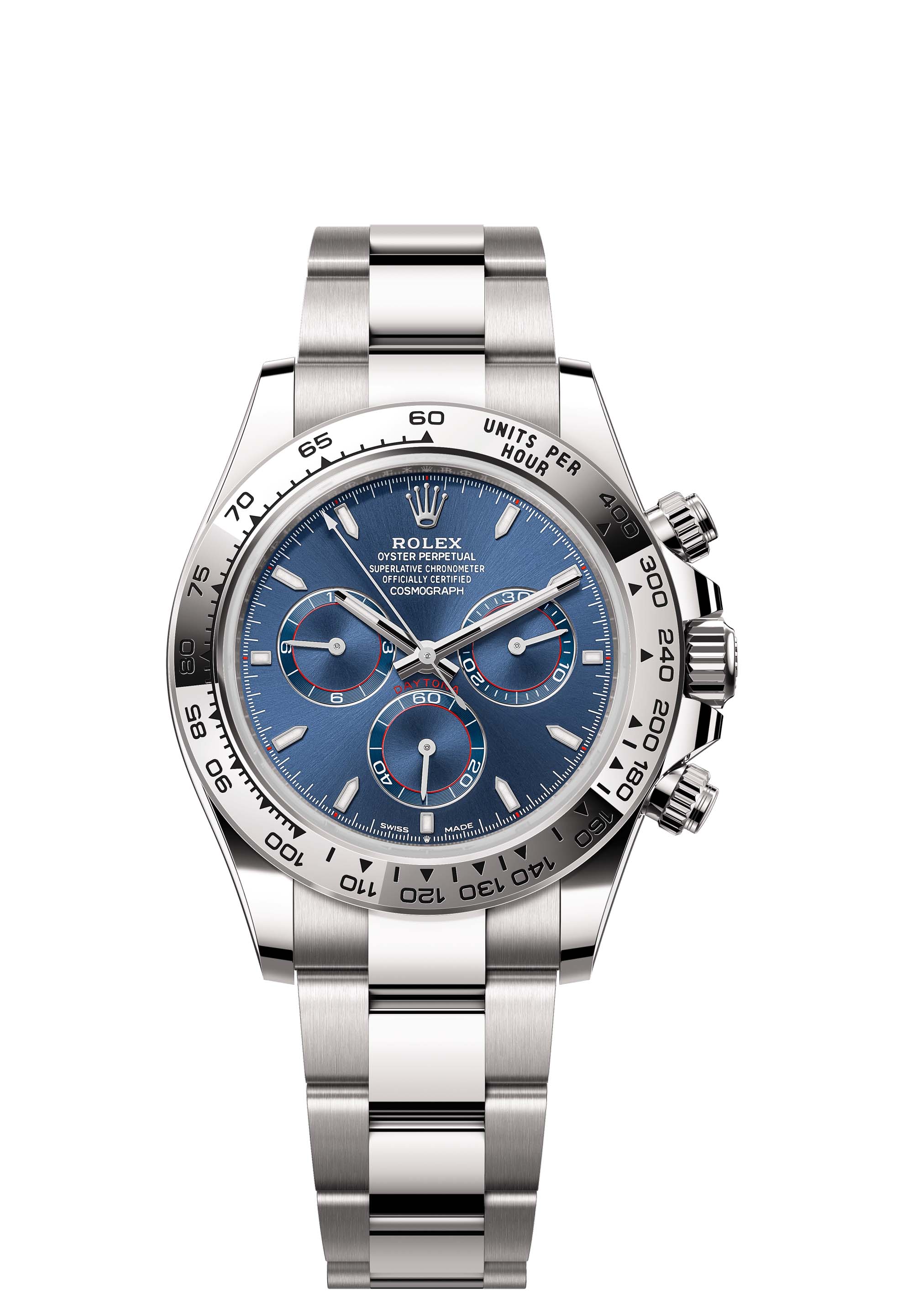 This Oyster Perpetual Cosmograph Daytona in 18 ct white gold, with a bright blue dial and an Oyster bracelet, features an 18 ct white gold bezel with an engraved tachymetric scale.