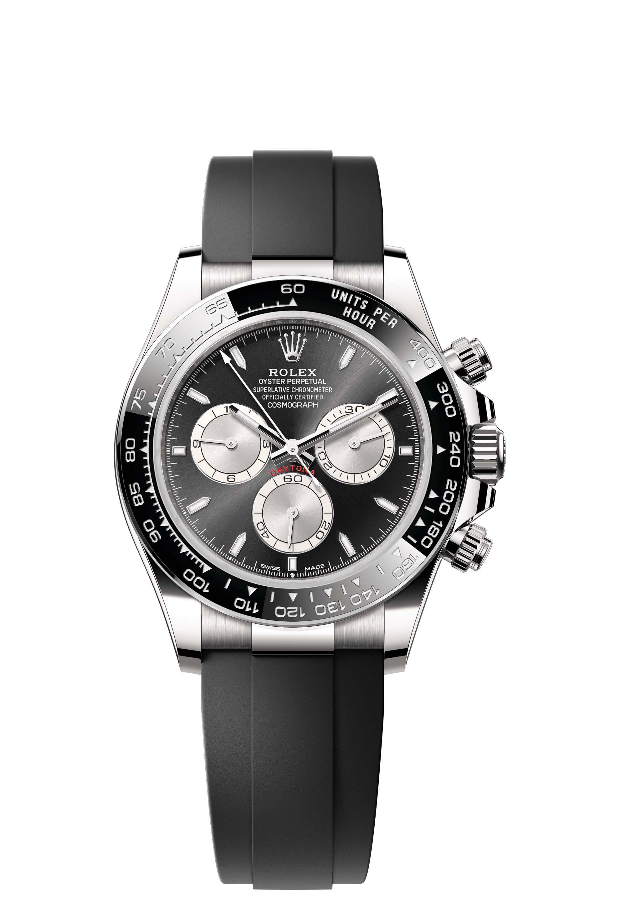 This Oyster Perpetual Cosmograph Daytona in 18 ct white gold, with a bright black and steel dial and an Oysterflex bracelet, features a black Cerachrom bezel with tachymetric scale.