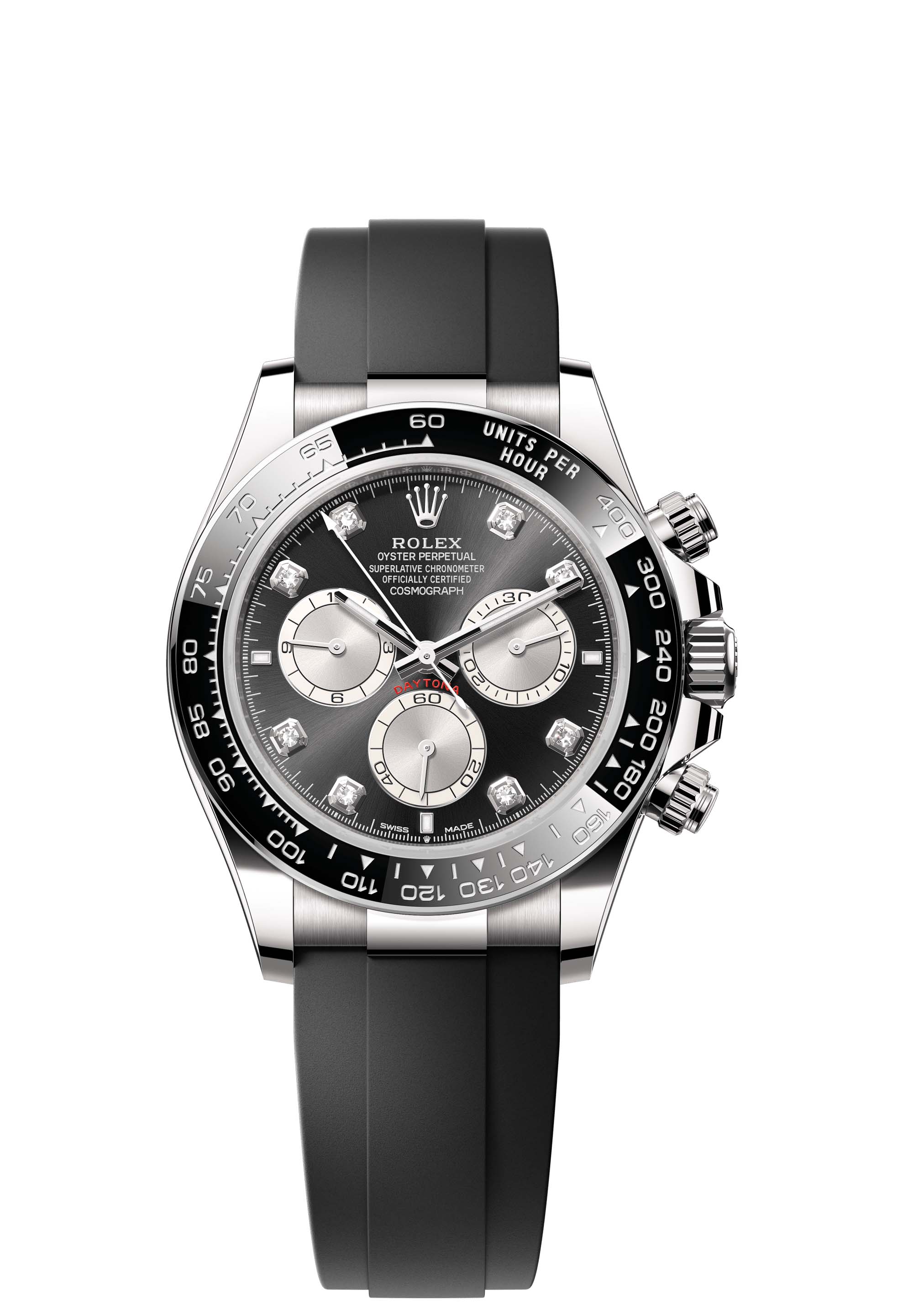 This Oyster Perpetual Cosmograph Daytona in 18 ct white gold, with a bright black and steel, diamond-set dial and an Oysterflex bracelet, features a black Cerachrom bezel with tachymetric scale.