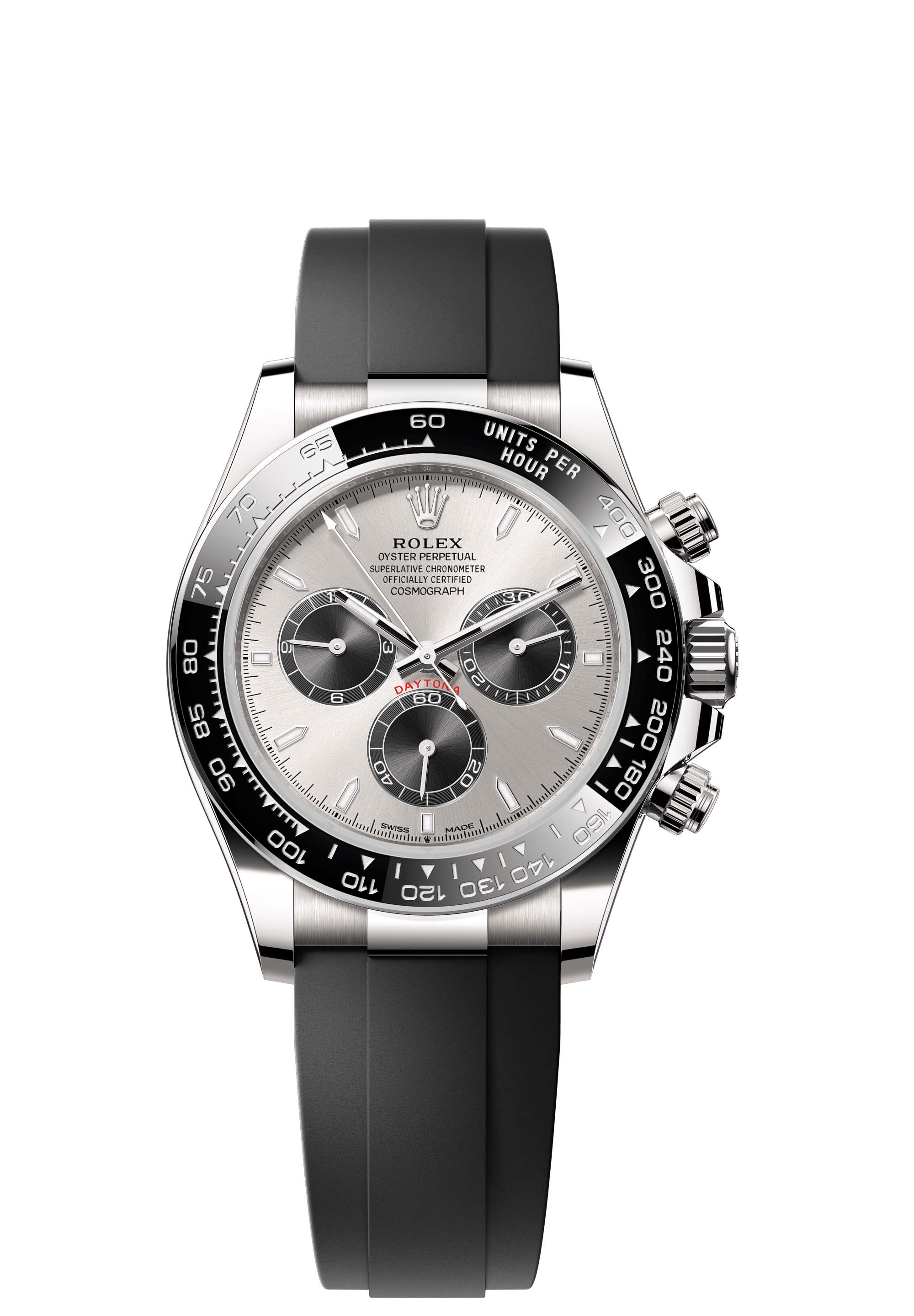 This Oyster Perpetual Cosmograph Daytona in 18 ct white gold, with a steel and bright black dial and an Oysterflex bracelet, features a black Cerachrom bezel with tachymetric scale.