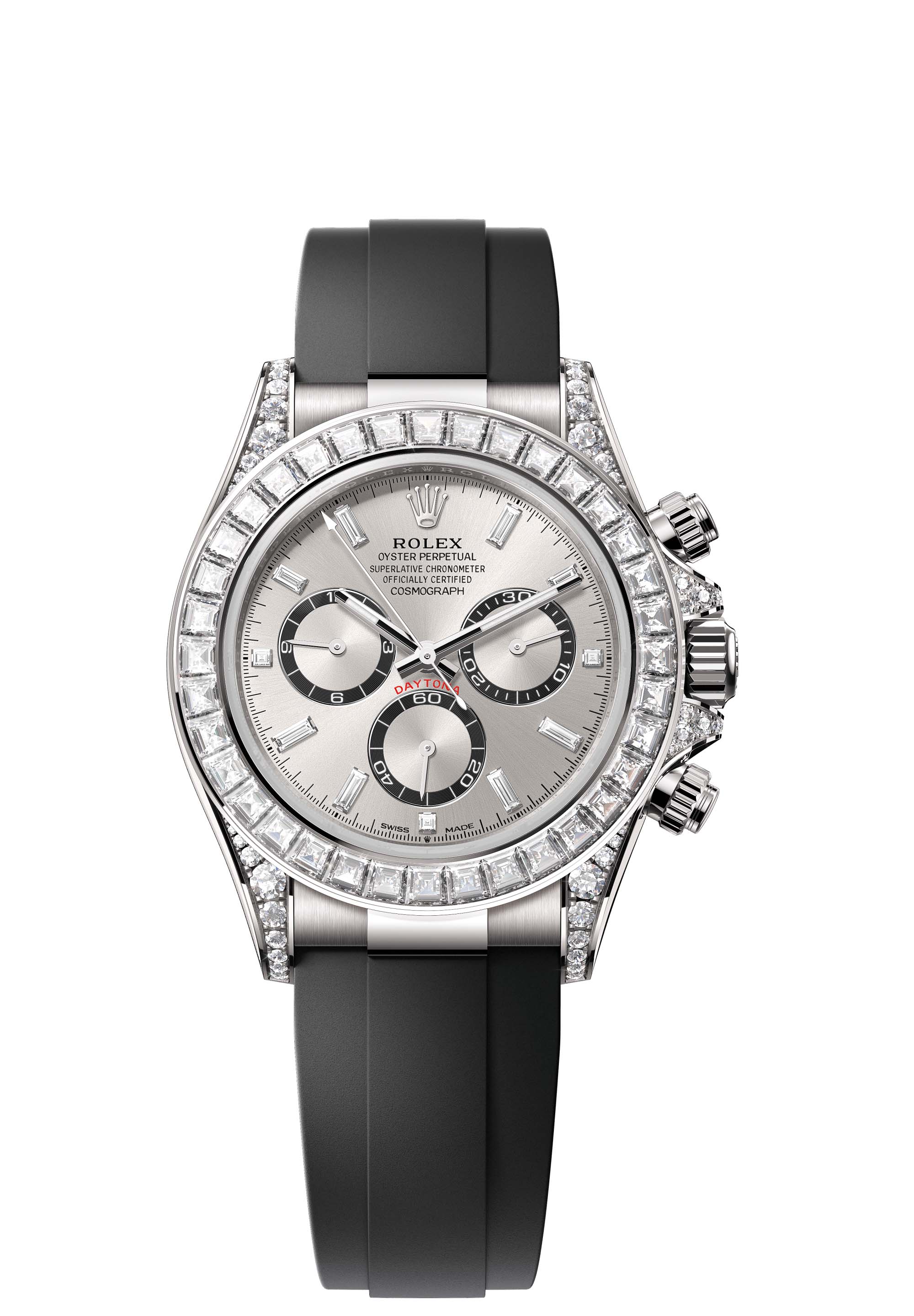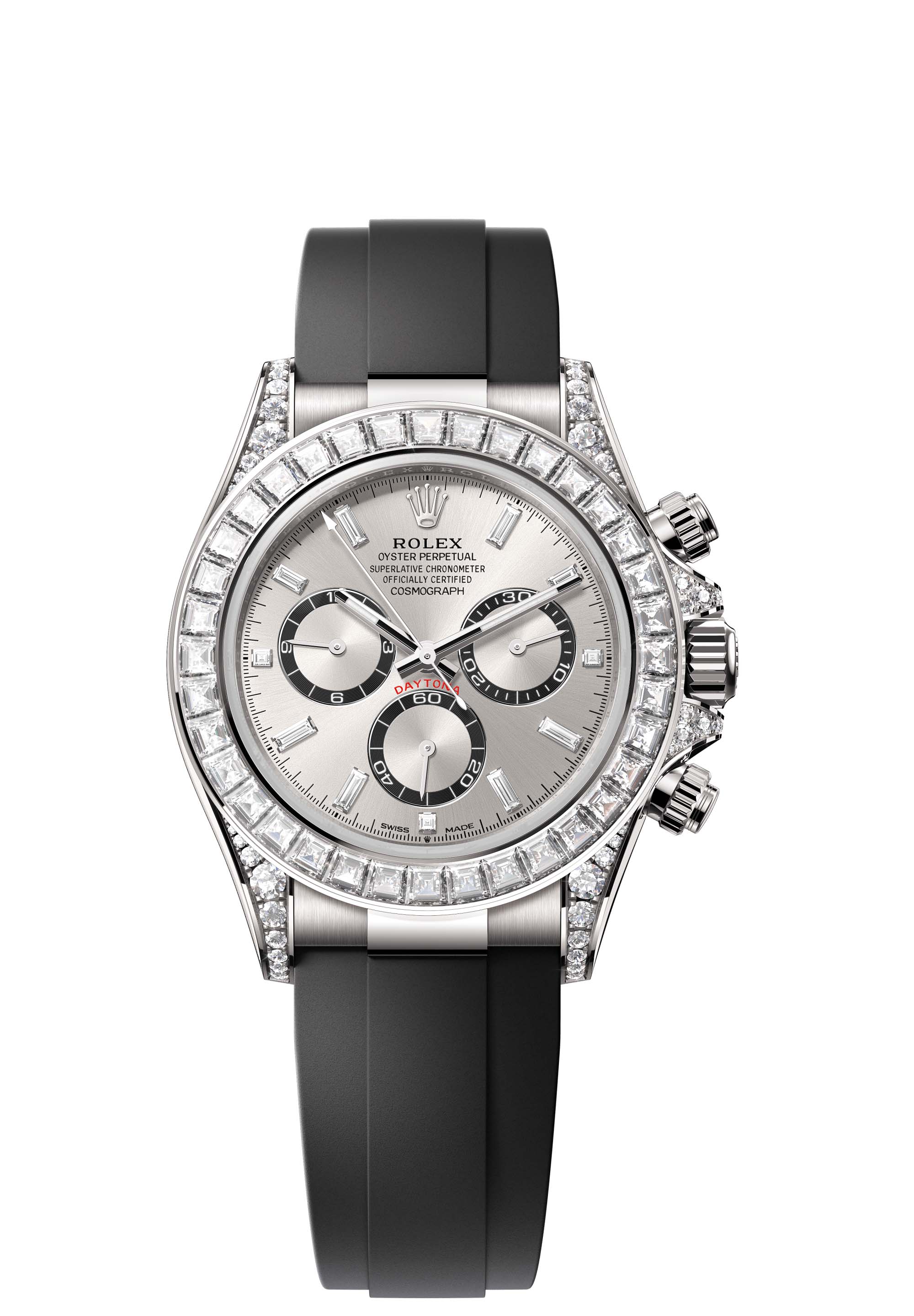 This Oyster Perpetual Cosmograph Daytona in 18 ct white gold, with a steel, diamond-set dial and contrasting counter rings, features an Oysterflex bracelet as well as a diamond-set bezel and diamond-set lugs.