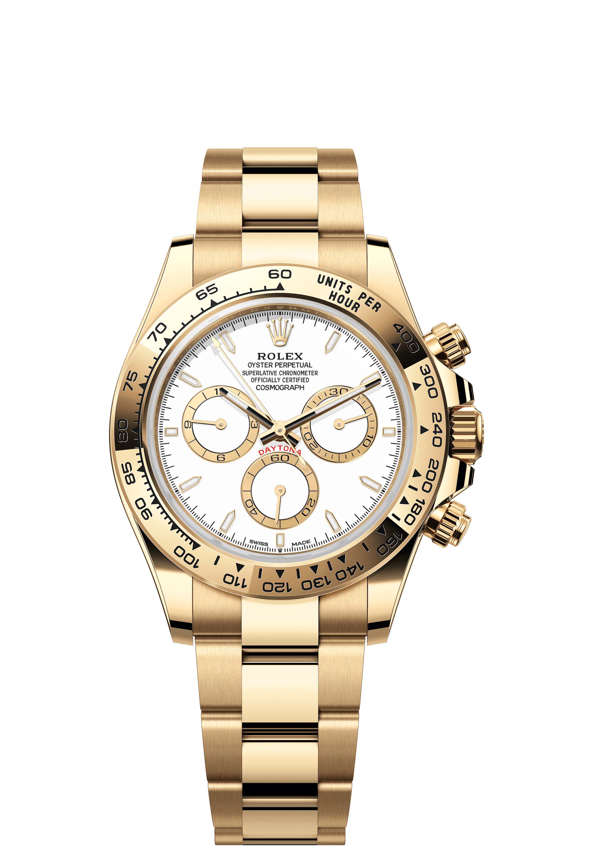 The Oyster Perpetual Cosmograph Daytona in 18 ct yellow gold with a white dial and contrasting counter rings. It features an Oyster bracelet and an 18 ct yellow gold bezel with an engraved tachymetric scale.