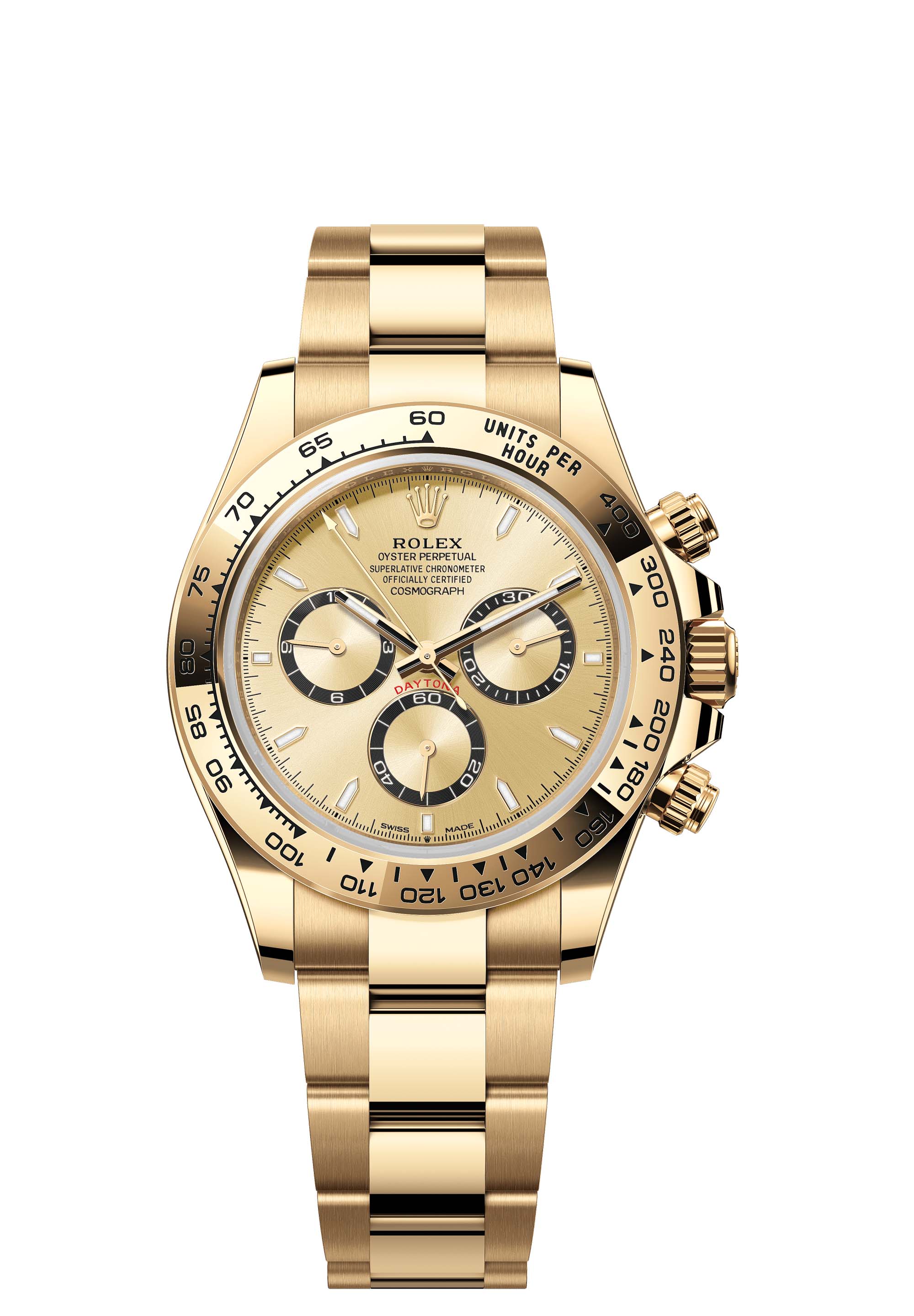The Oyster Perpetual Cosmograph Daytona in 18 ct yellow gold with a golden dial and contrasting counter rings. It features an Oyster bracelet and an 18 ct yellow gold bezel with an engraved tachymetric scale.