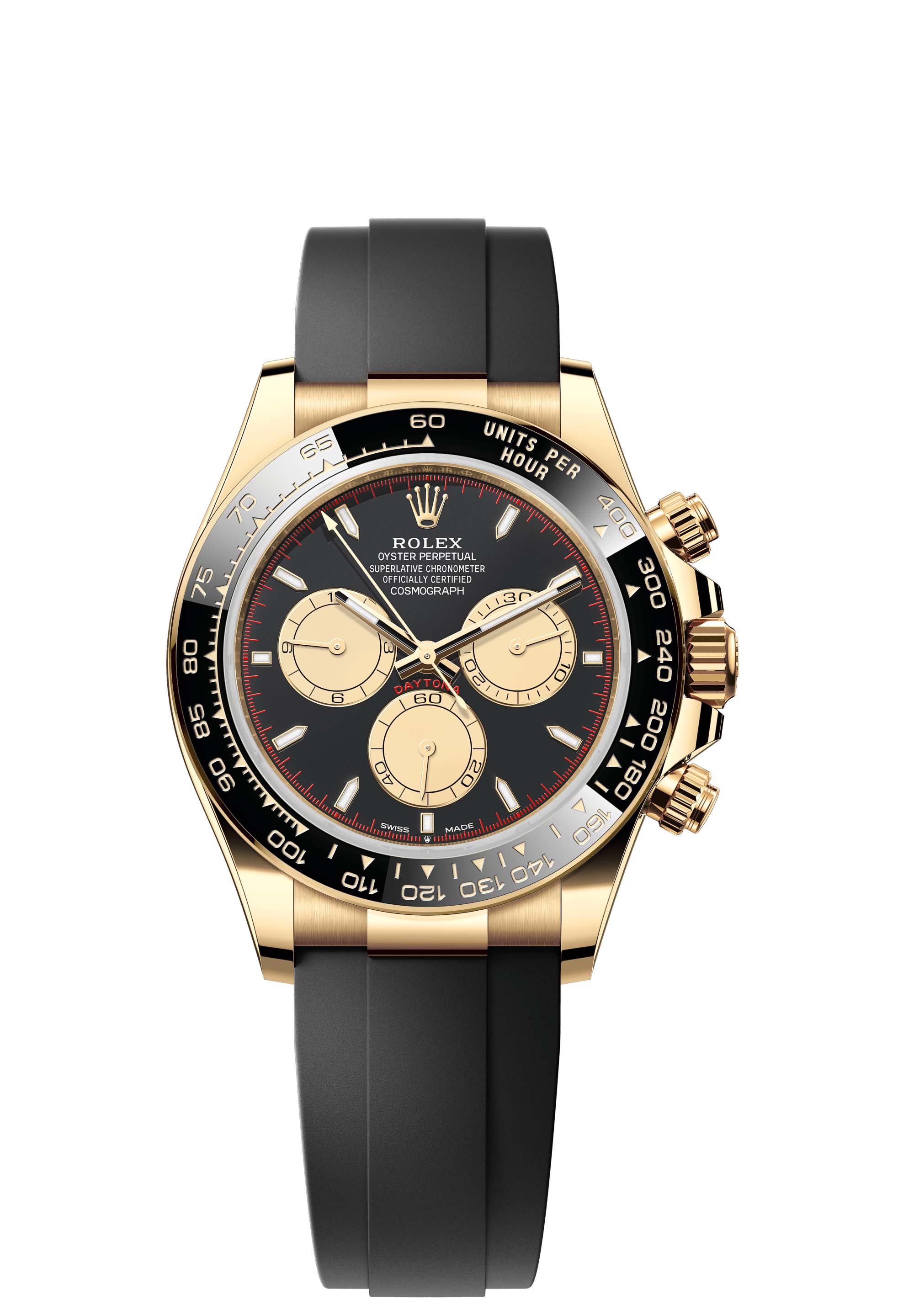 This Oyster Perpetual Cosmograph Daytona in 18 ct yellow gold, with an intense black and champagne-colour dial and an Oysterflex bracelet, features a black Cerachrom bezel with tachymetric scale.