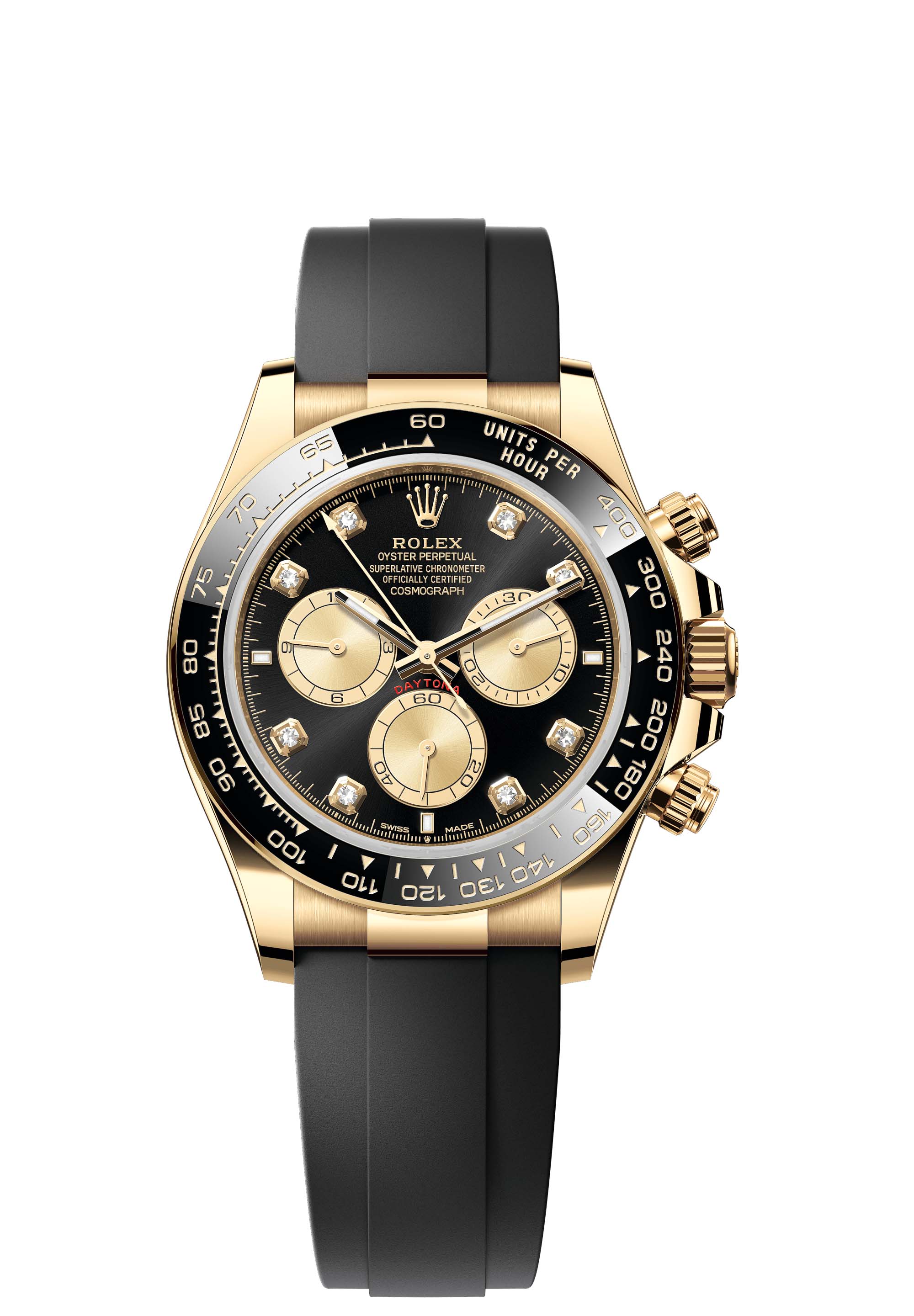 This Oyster Perpetual Cosmograph Daytona in 18 ct yellow gold, with a bright black and golden, diamond-set dial and an Oysterflex bracelet, features a black Cerachrom bezel with tachymetric scale.