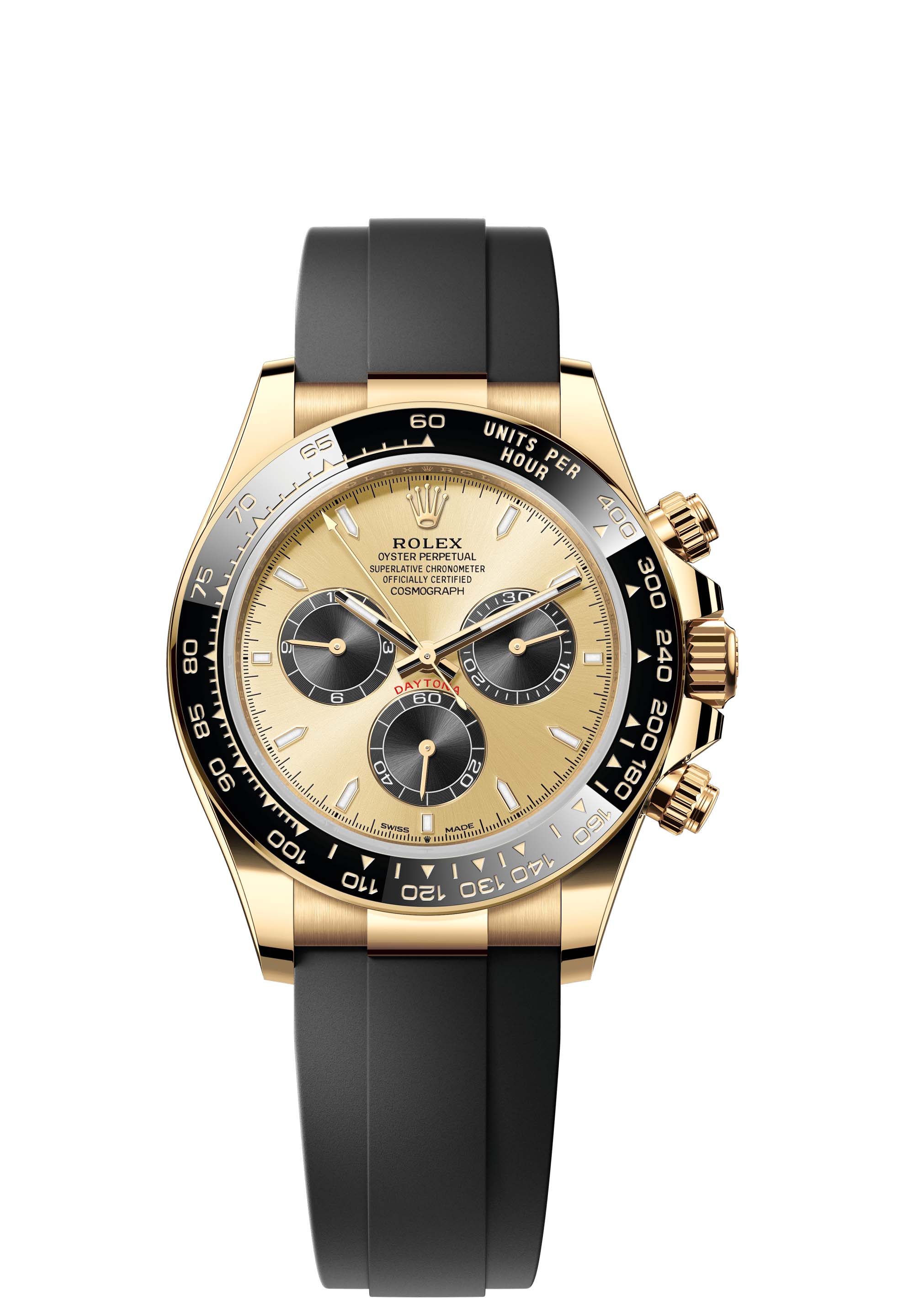This Oyster Perpetual Cosmograph Daytona in 18 ct yellow gold, with a golden and bright black dial and an Oysterflex bracelet, features a black Cerachrom bezel with tachymetric scale.
