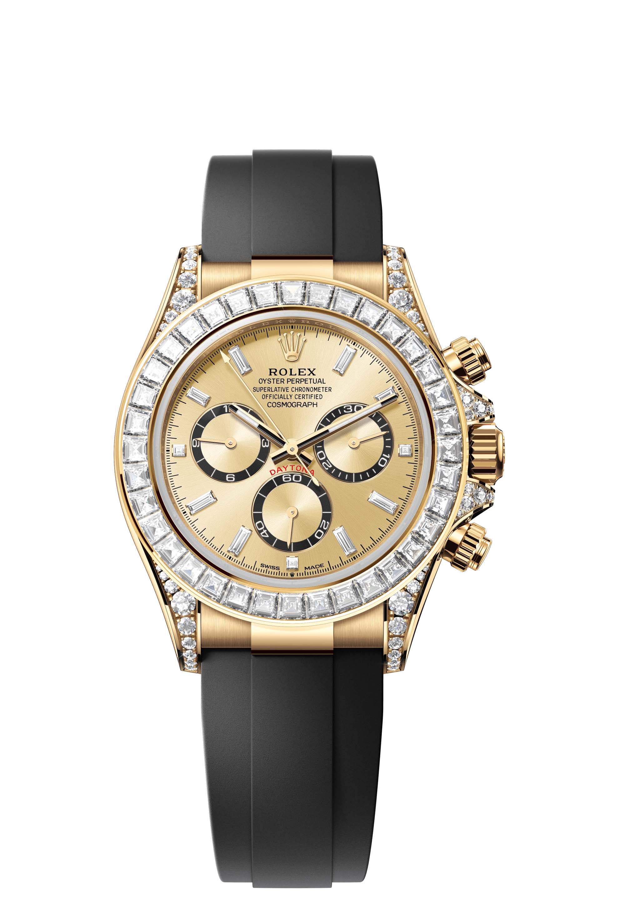 This Oyster Perpetual Cosmograph Daytona in 18 ct yellow gold, with a golden, diamond-set dial and contrasting counter rings, features an Oysterflex bracelet as well as a diamond-set bezel and diamond-set lugs.