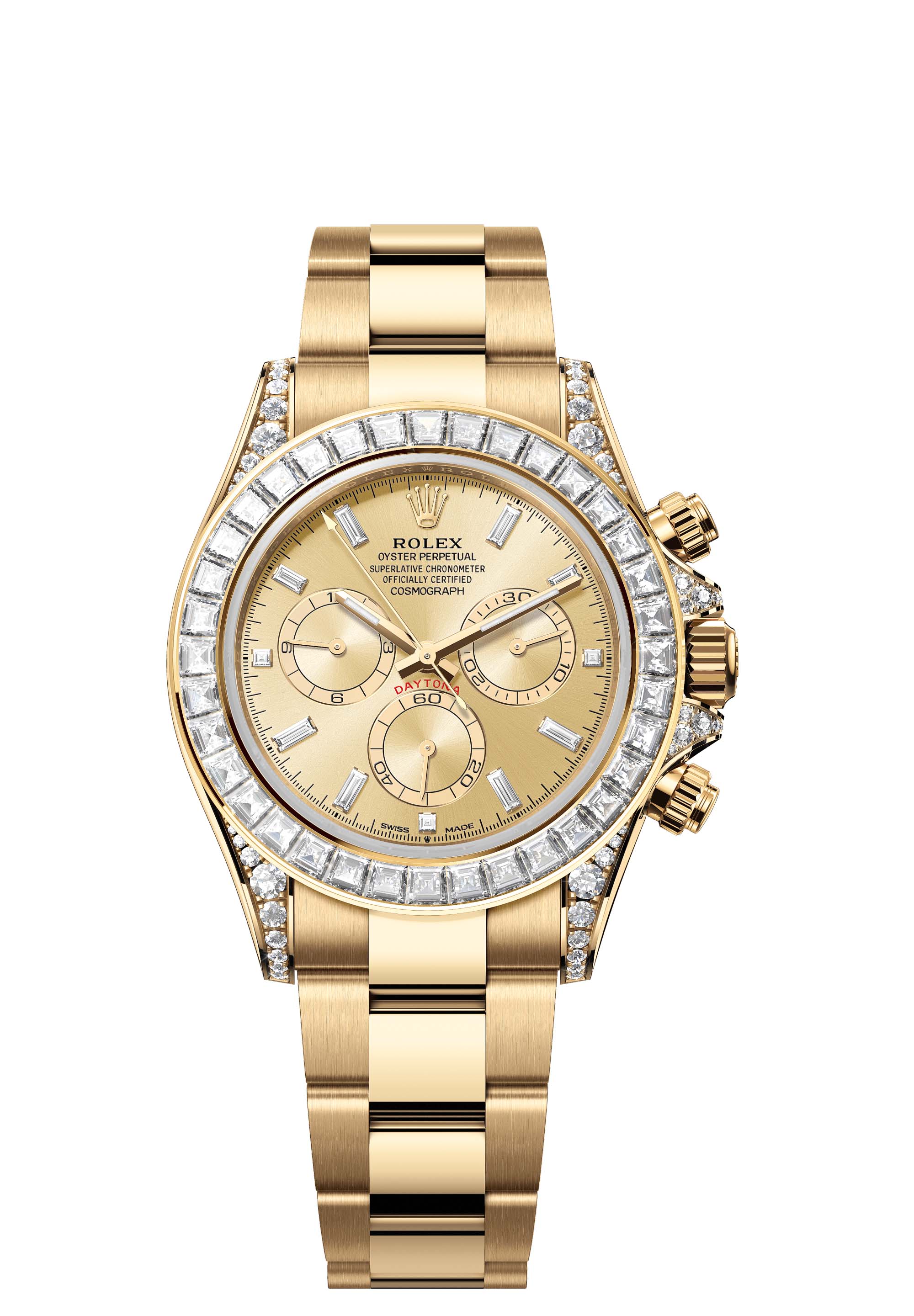 This Oyster Perpetual Cosmograph Daytona in 18 ct yellow gold, with a golden, diamond-set dial and an Oyster bracelet, features a diamond-set bezel and diamond-set lugs.