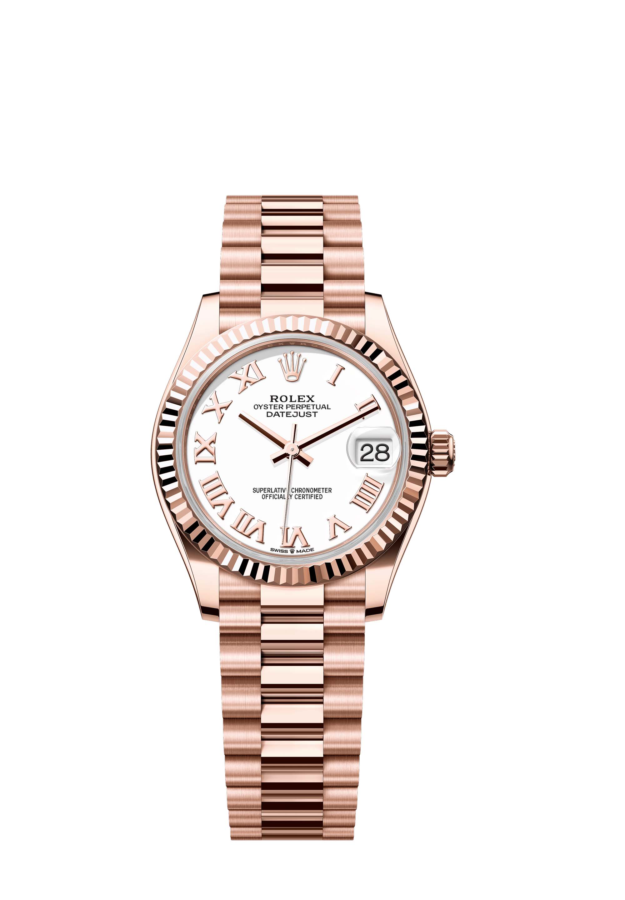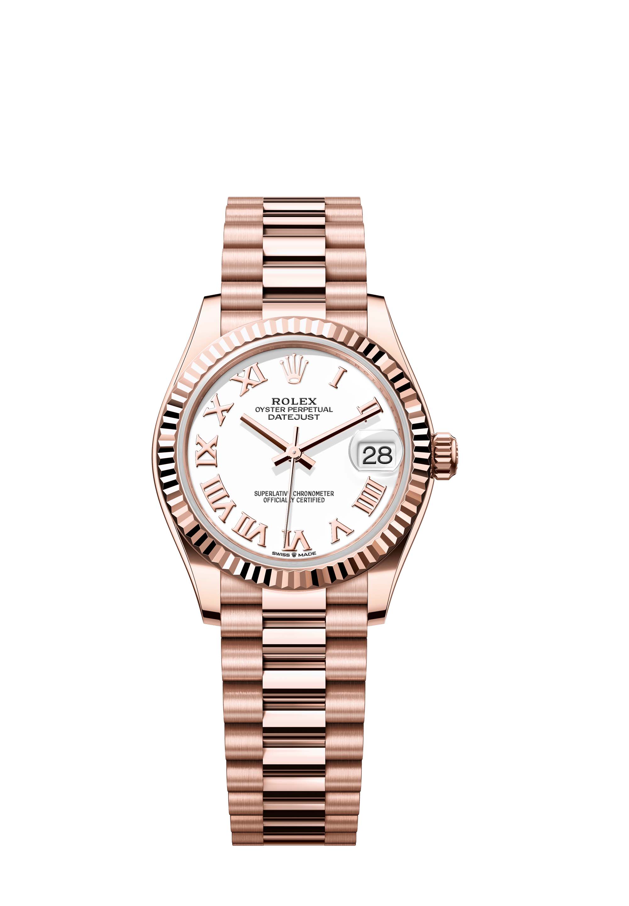 This Oyster Perpetual Datejust 31 in 18 ct Everose gold features a white dial and a President bracelet.