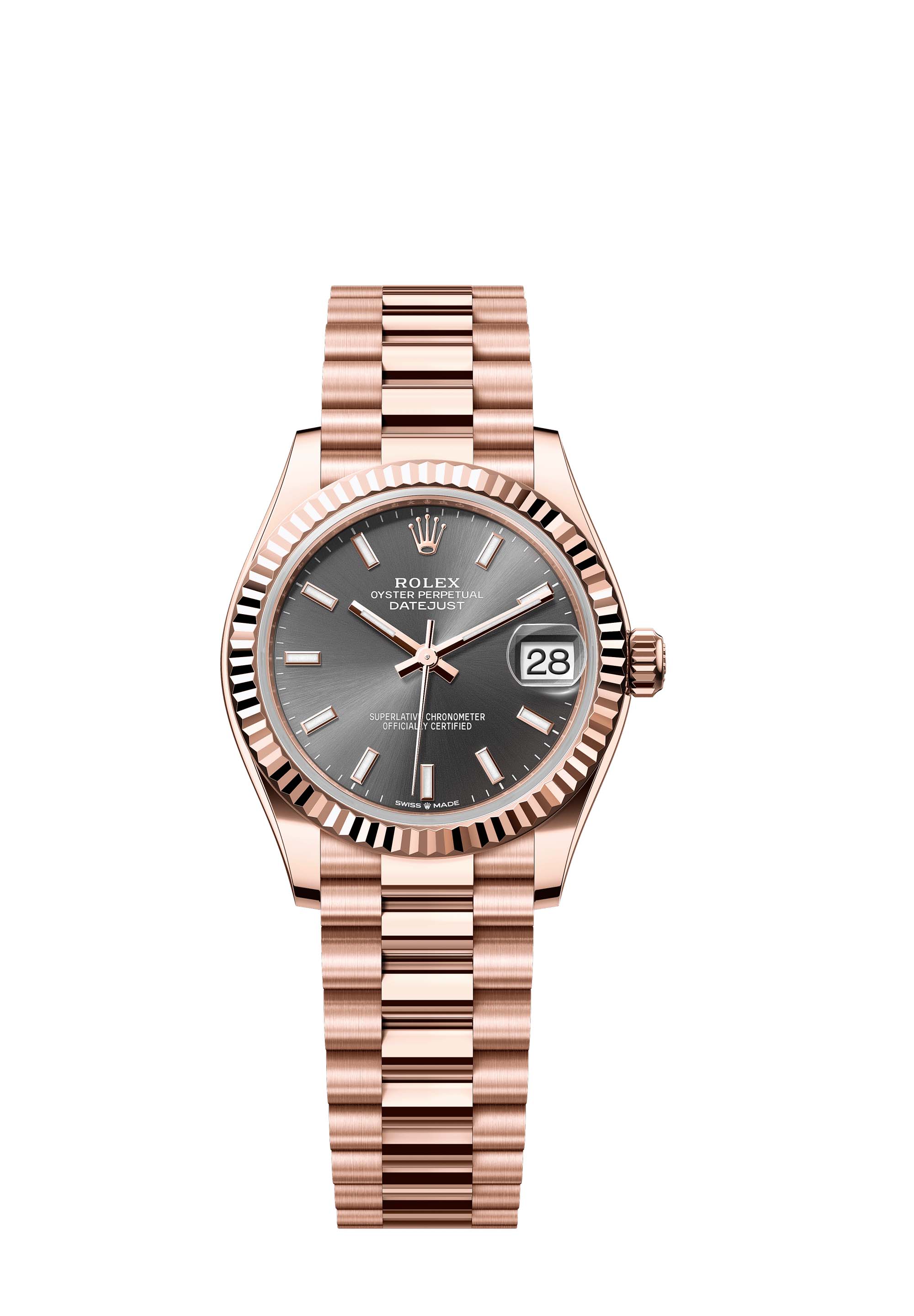 This Oyster Perpetual Datejust 31 in 18 ct Everose gold features a slate dial and a President bracelet.