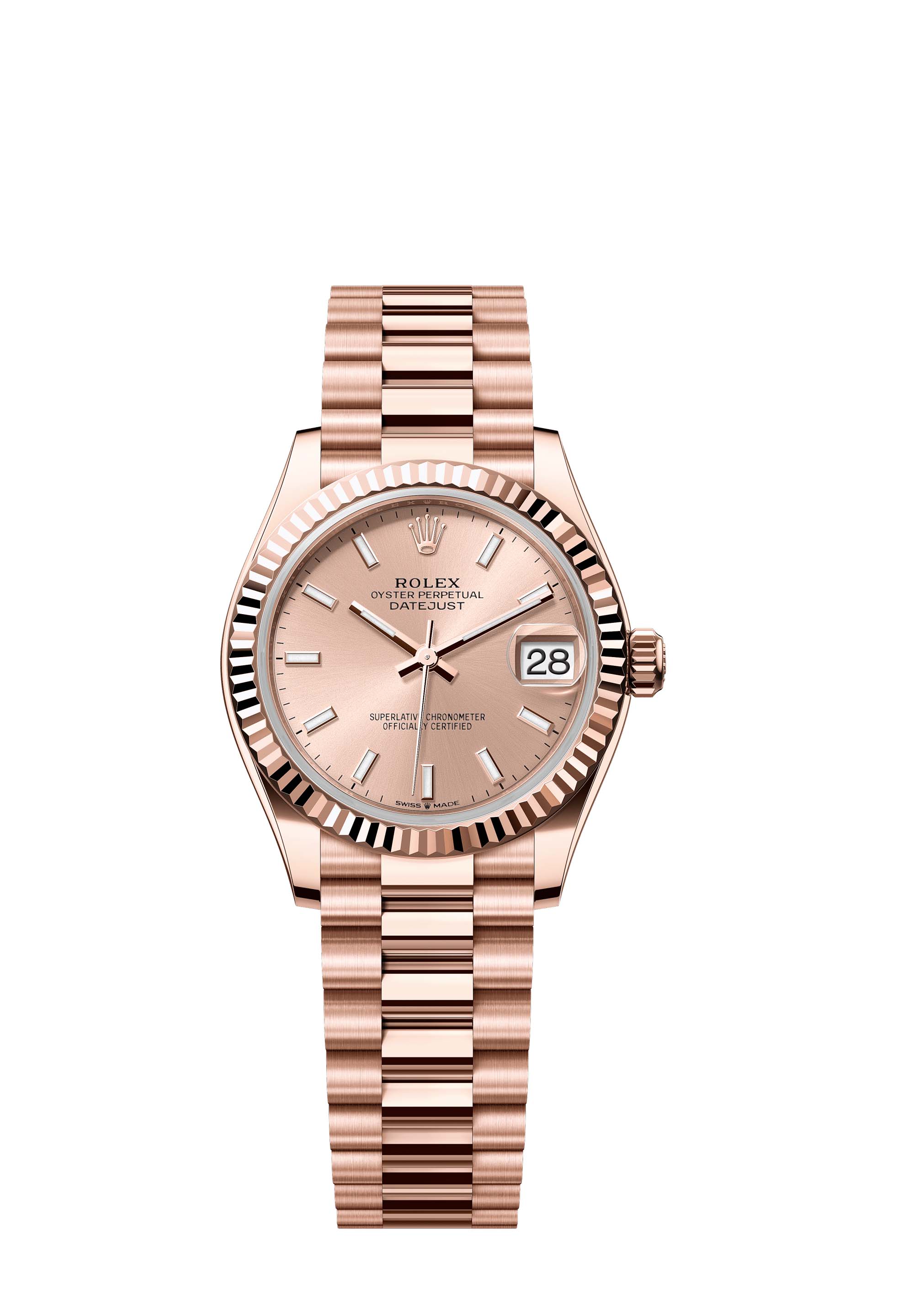 This Oyster Perpetual Datejust 31 in 18 ct Everose gold features a rosé-colour dial and a President bracelet.