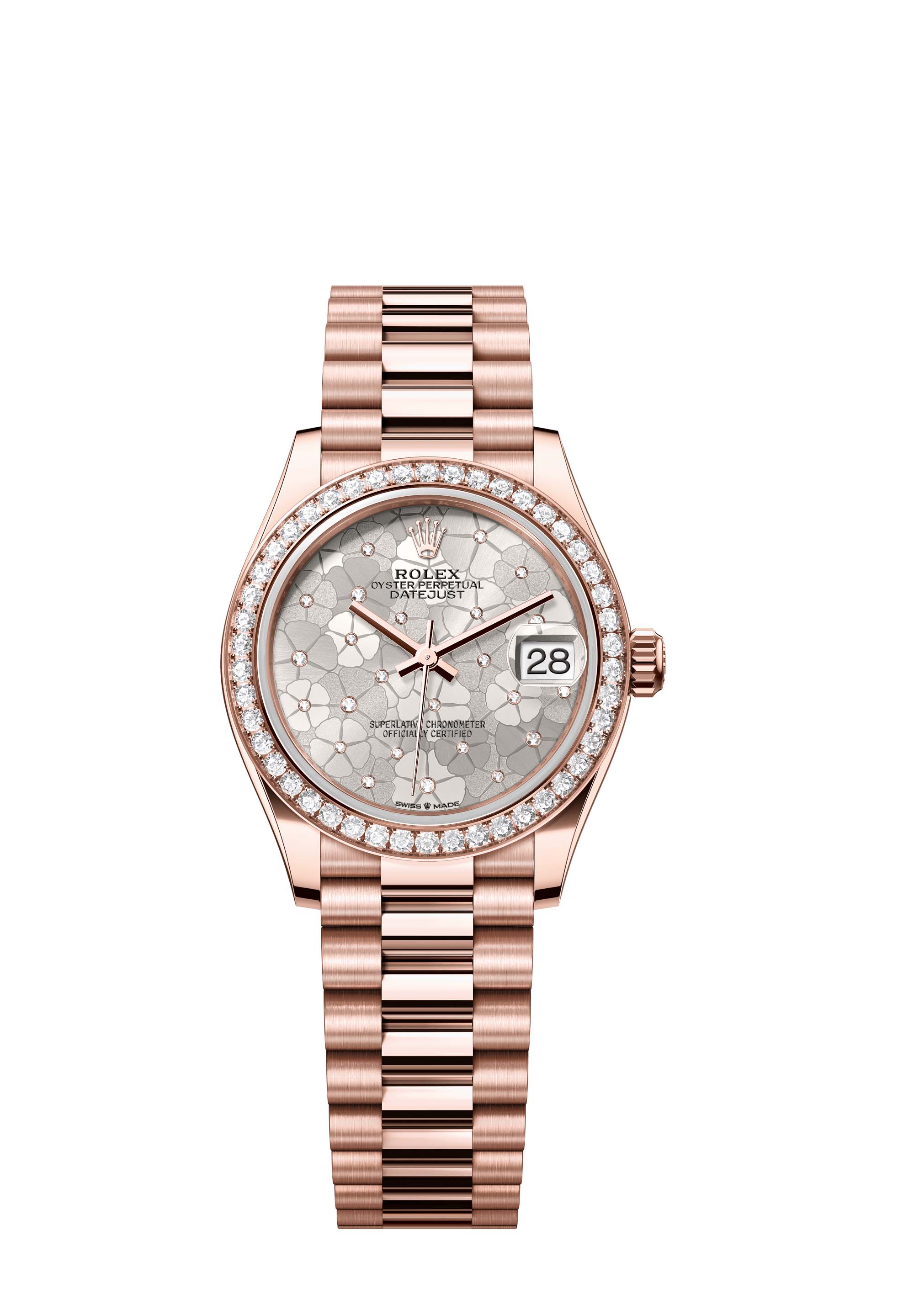 This Oyster Perpetual Datejust 31 in 18 ct Everose gold features a silver floral-motif, diamond-set dial and a President bracelet.