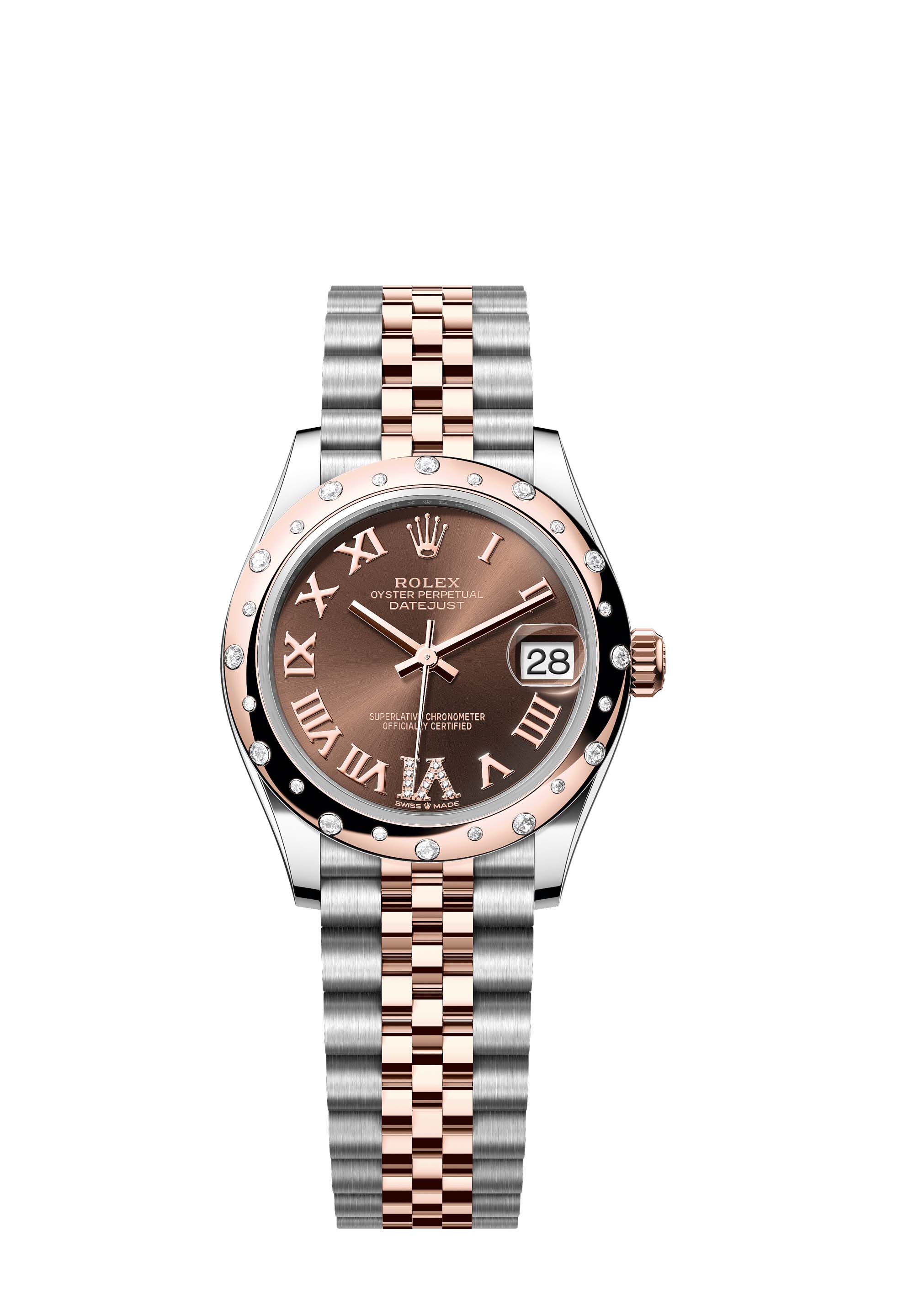 This Oyster Perpetual Datejust 31 in Oystersteel and Everose gold features a chocolate, diamond-set dial and a Jubilee bracelet.