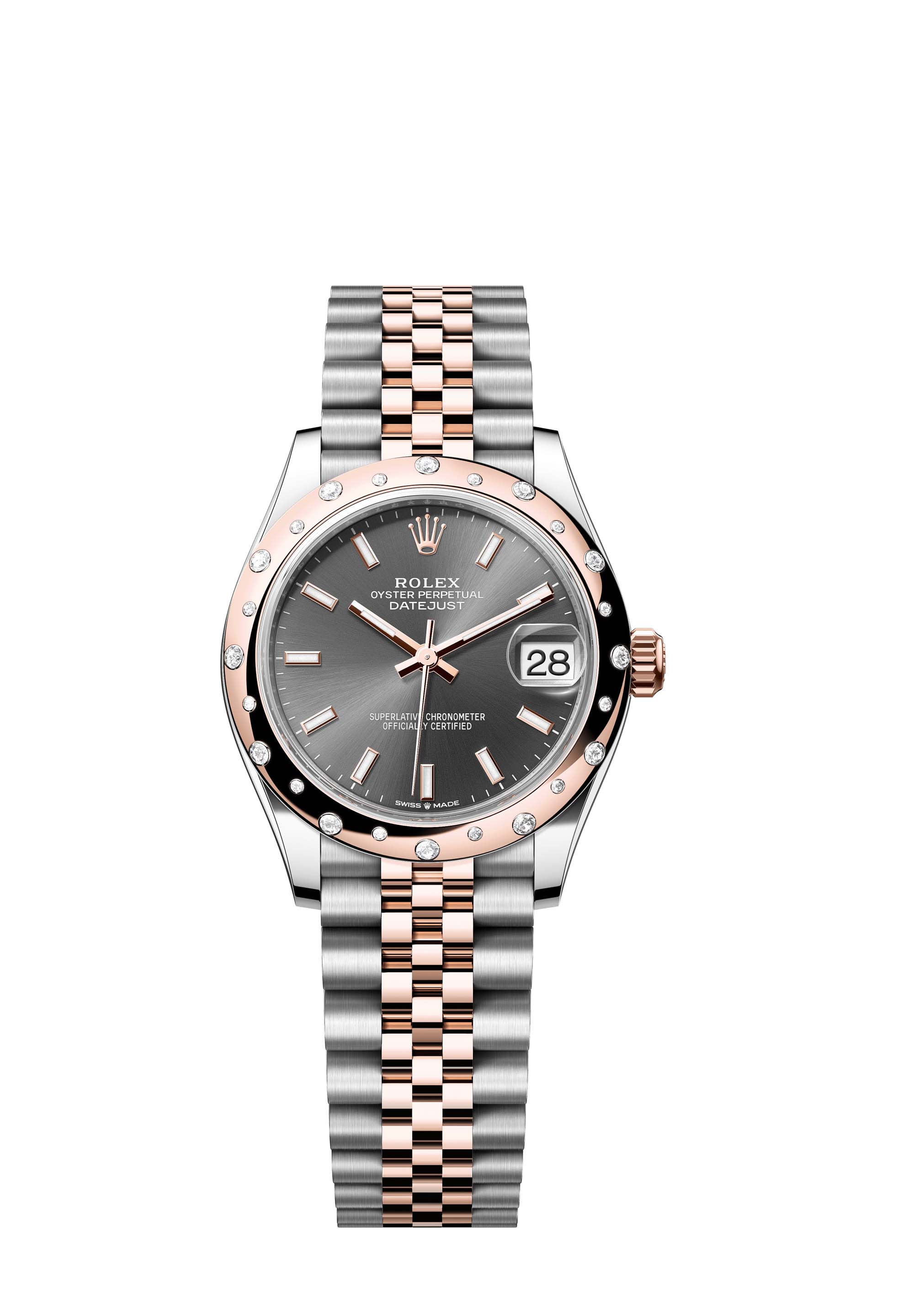 This Oyster Perpetual Datejust 31 in Oystersteel and Everose gold features a slate dial and a Jubilee bracelet.