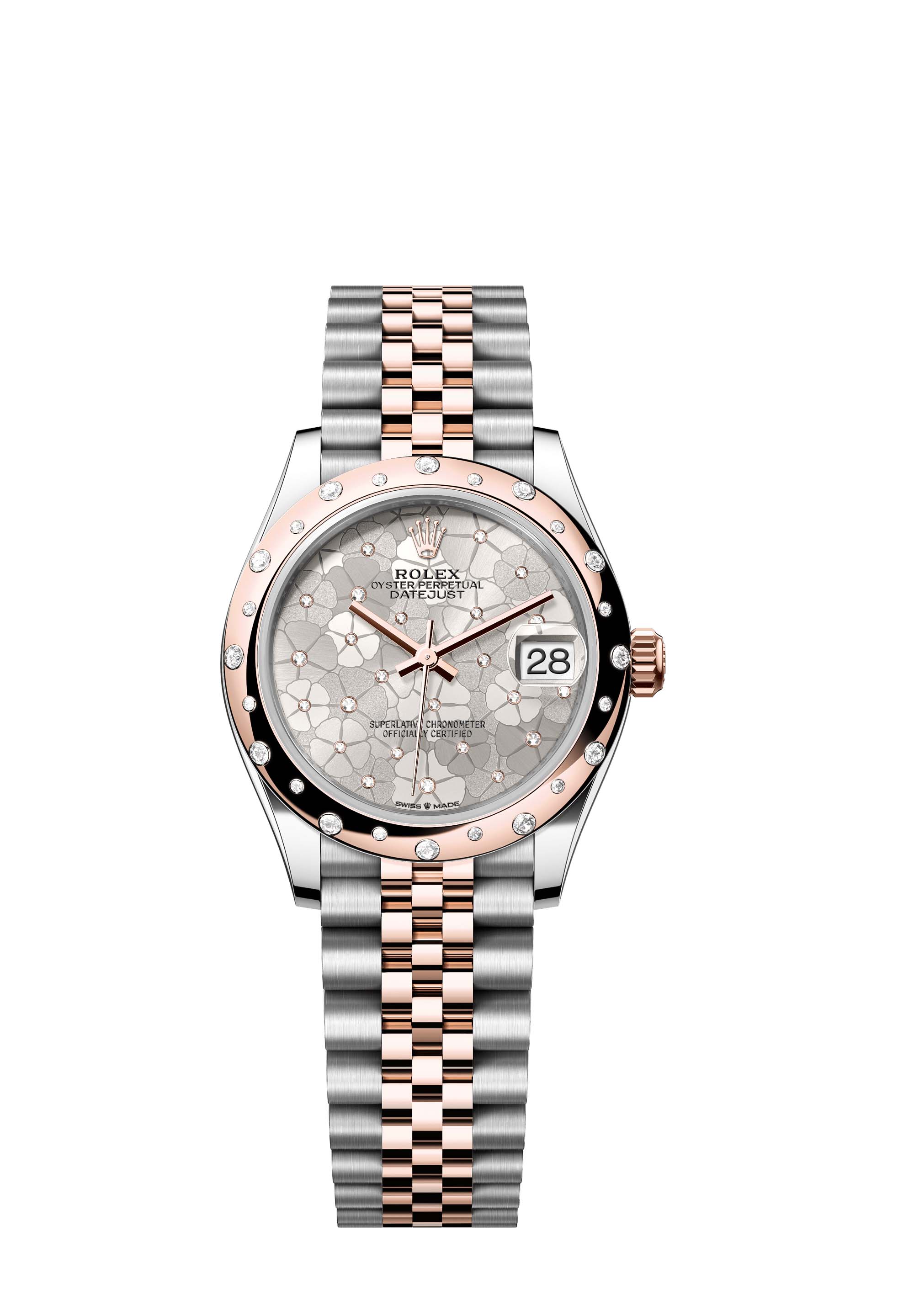 This Oyster Perpetual Datejust 31 in Oystersteel and Everose gold features a silver floral-motif, diamond-set dial and a Jubilee bracelet.