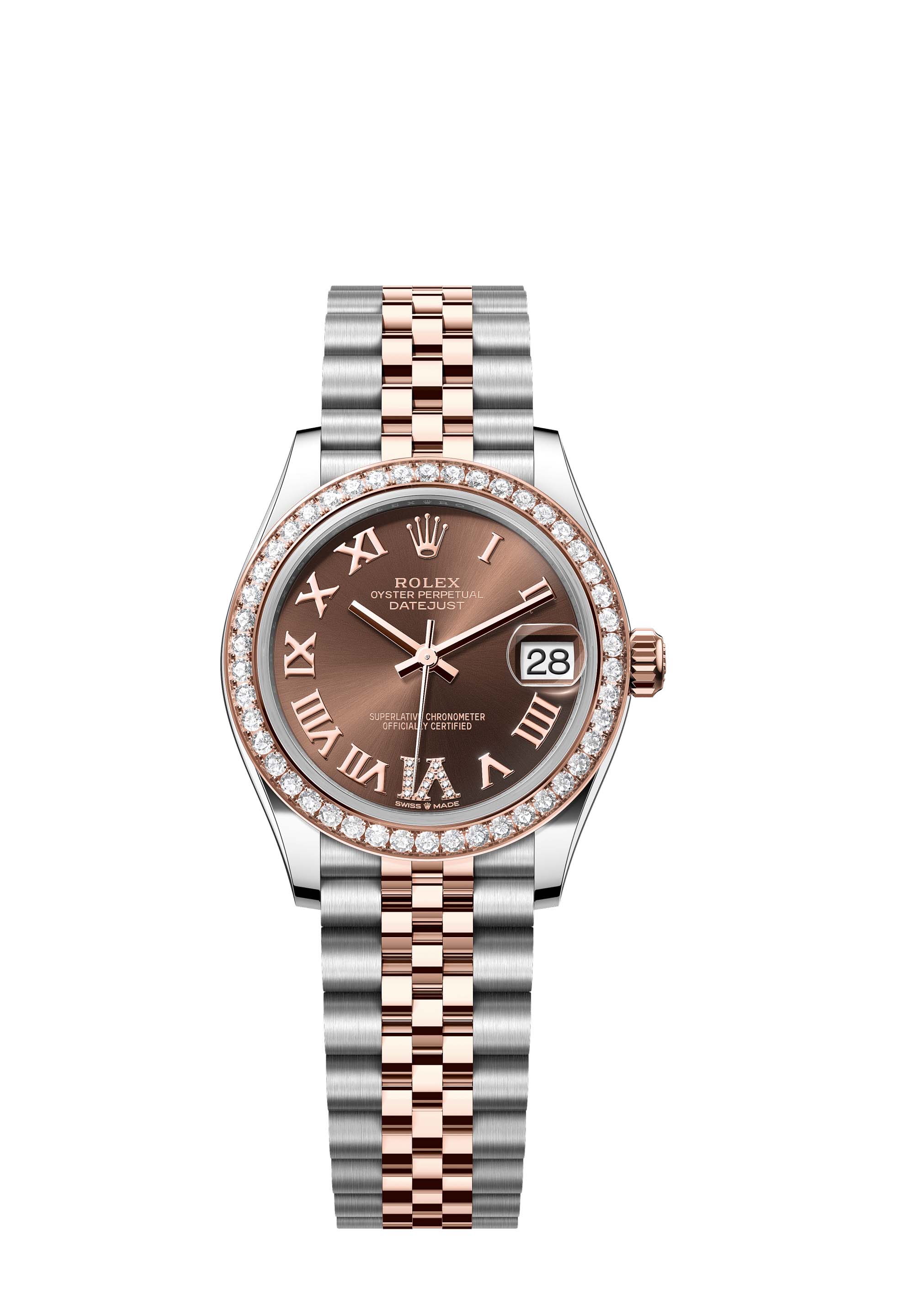 This Oyster Perpetual Datejust 31 in Oystersteel and Everose gold features a chocolate, diamond-set dial and a Jubilee bracelet.