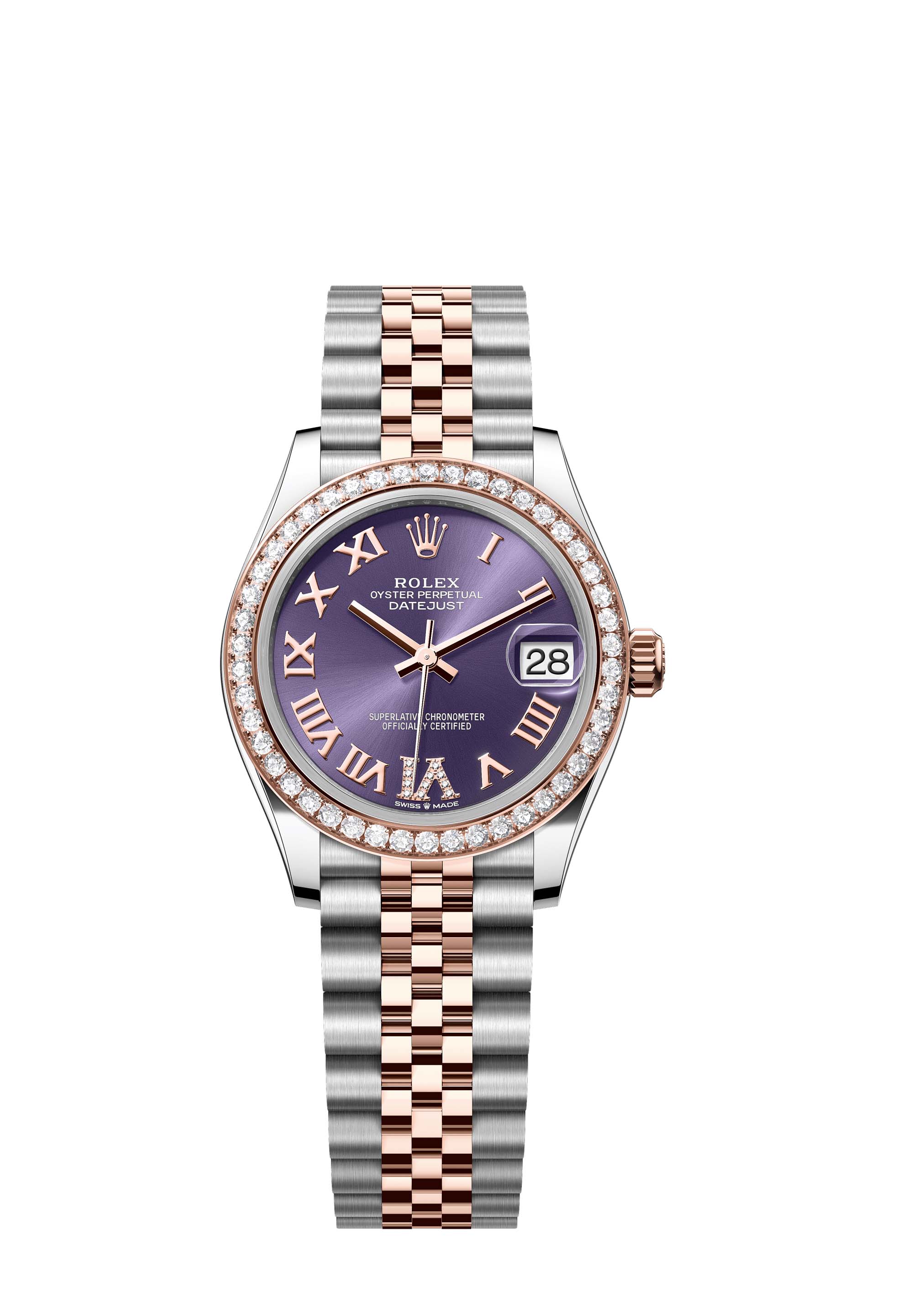 This Oyster Perpetual Datejust 31 in Oystersteel and Everose gold features an aubergine, diamond-set dial and a Jubilee bracelet.