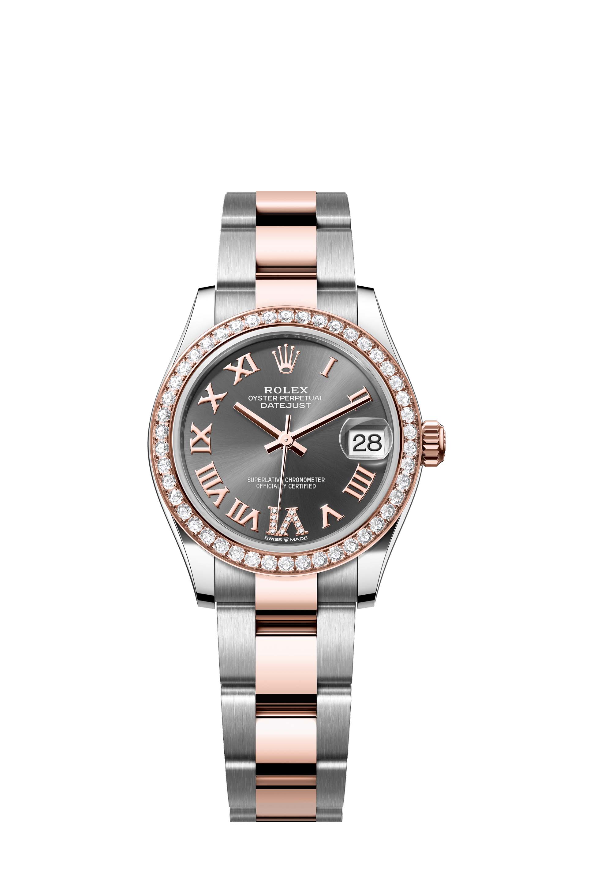 This Oyster Perpetual Datejust 31 in Oystersteel and Everose gold features a slate, diamond-set dial and an Oyster bracelet.