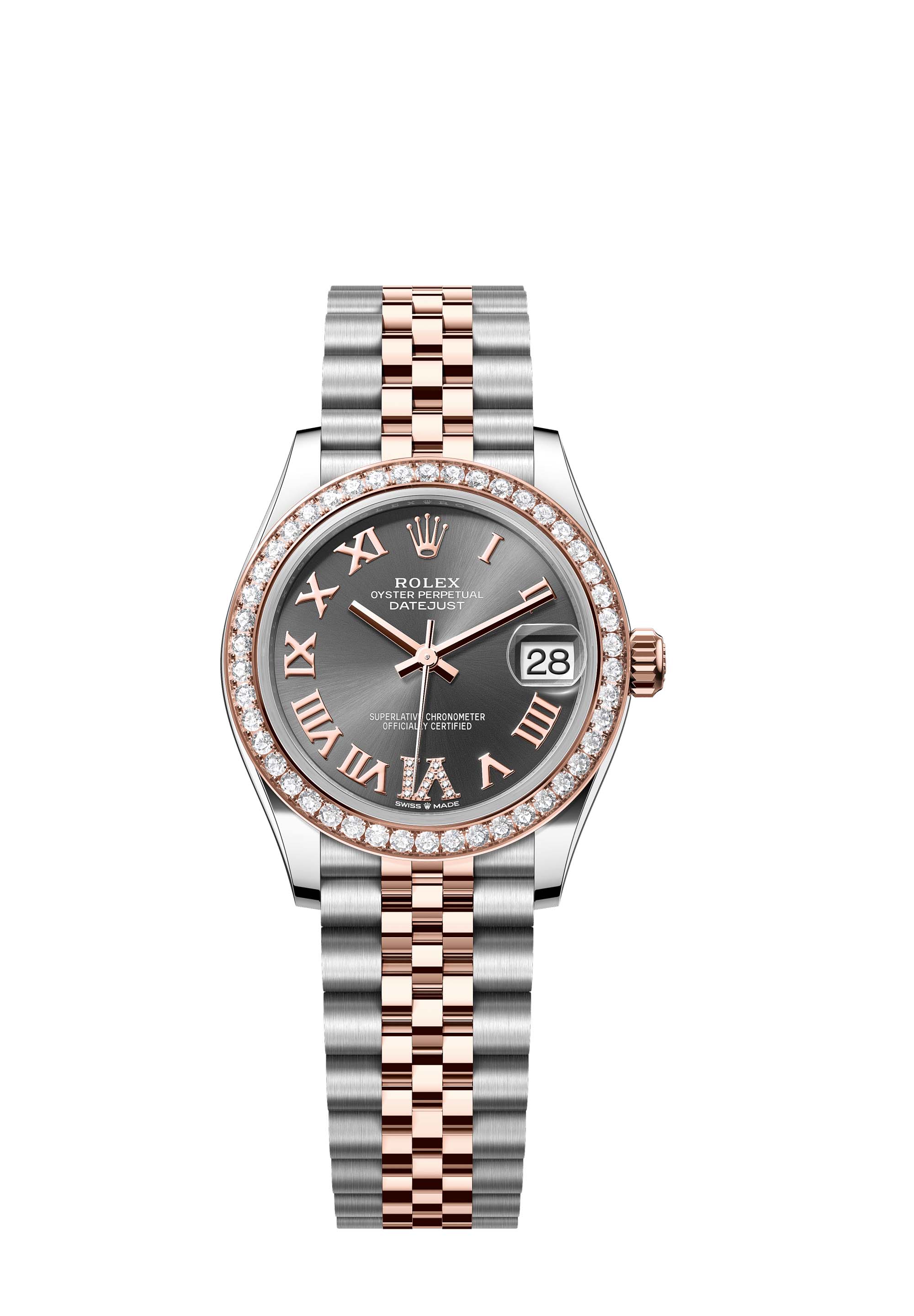 This Oyster Perpetual Datejust 31 in Oystersteel and Everose gold features a slate, diamond-set dial and a Jubilee bracelet.