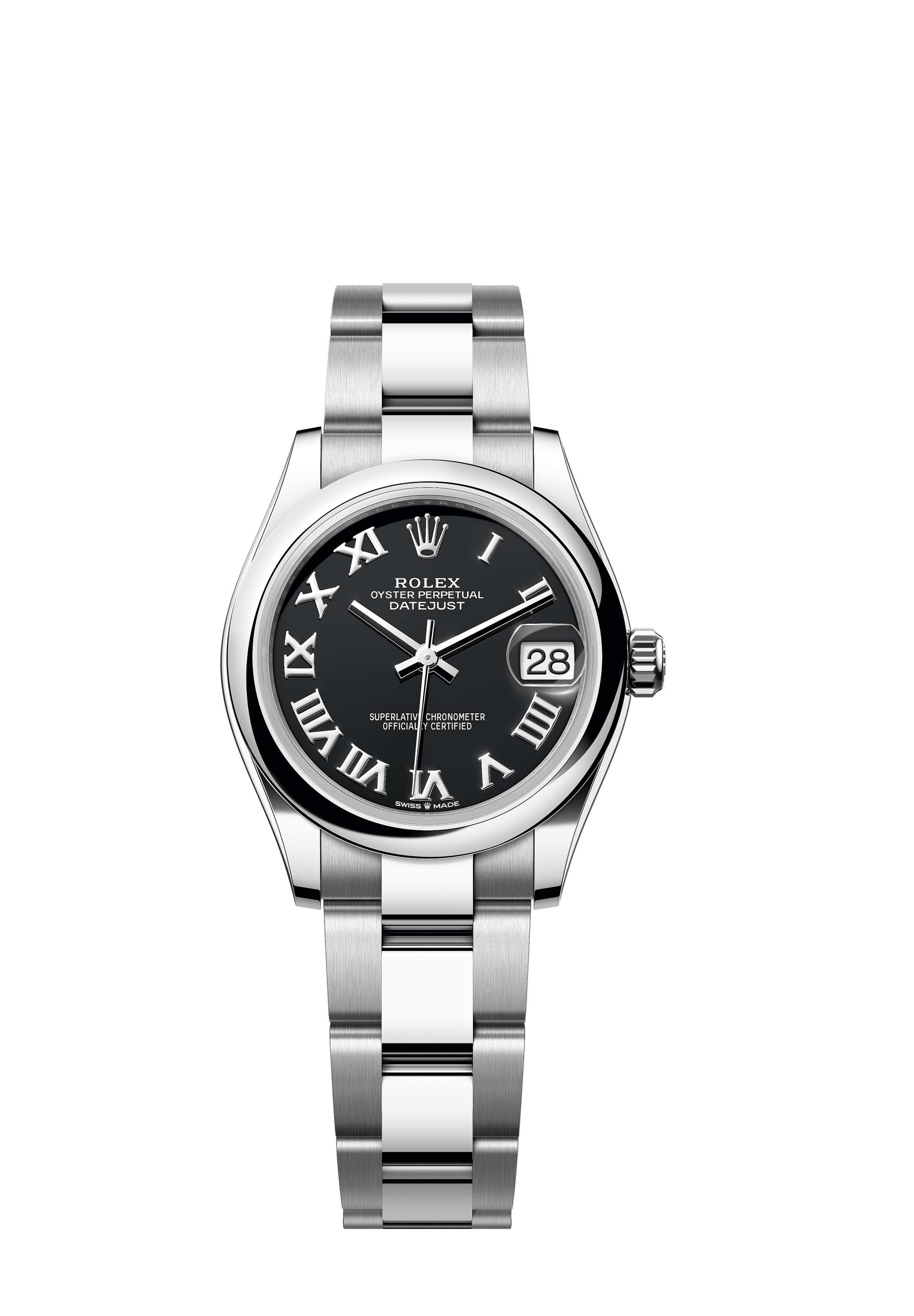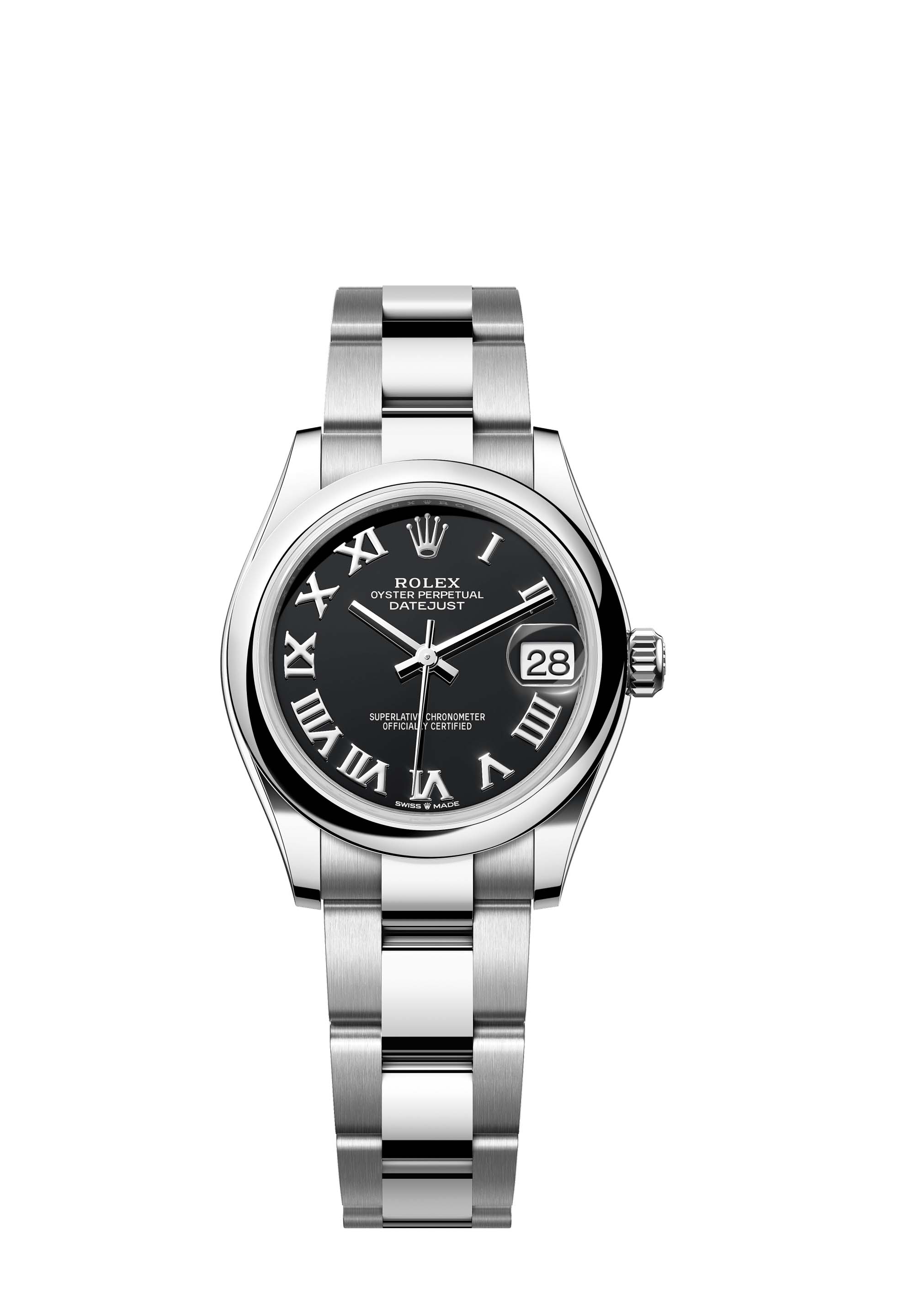 This Oyster Perpetual Datejust 31 in Oystersteel features a bright black dial and an Oyster bracelet.