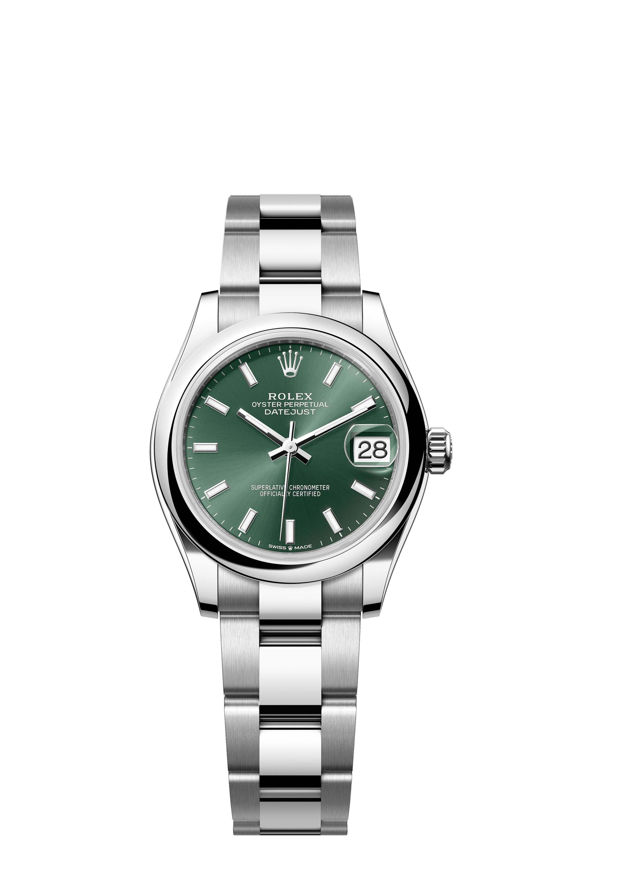 This Oyster Perpetual Datejust 31 in Oystersteel features a mint green dial and an Oyster bracelet.