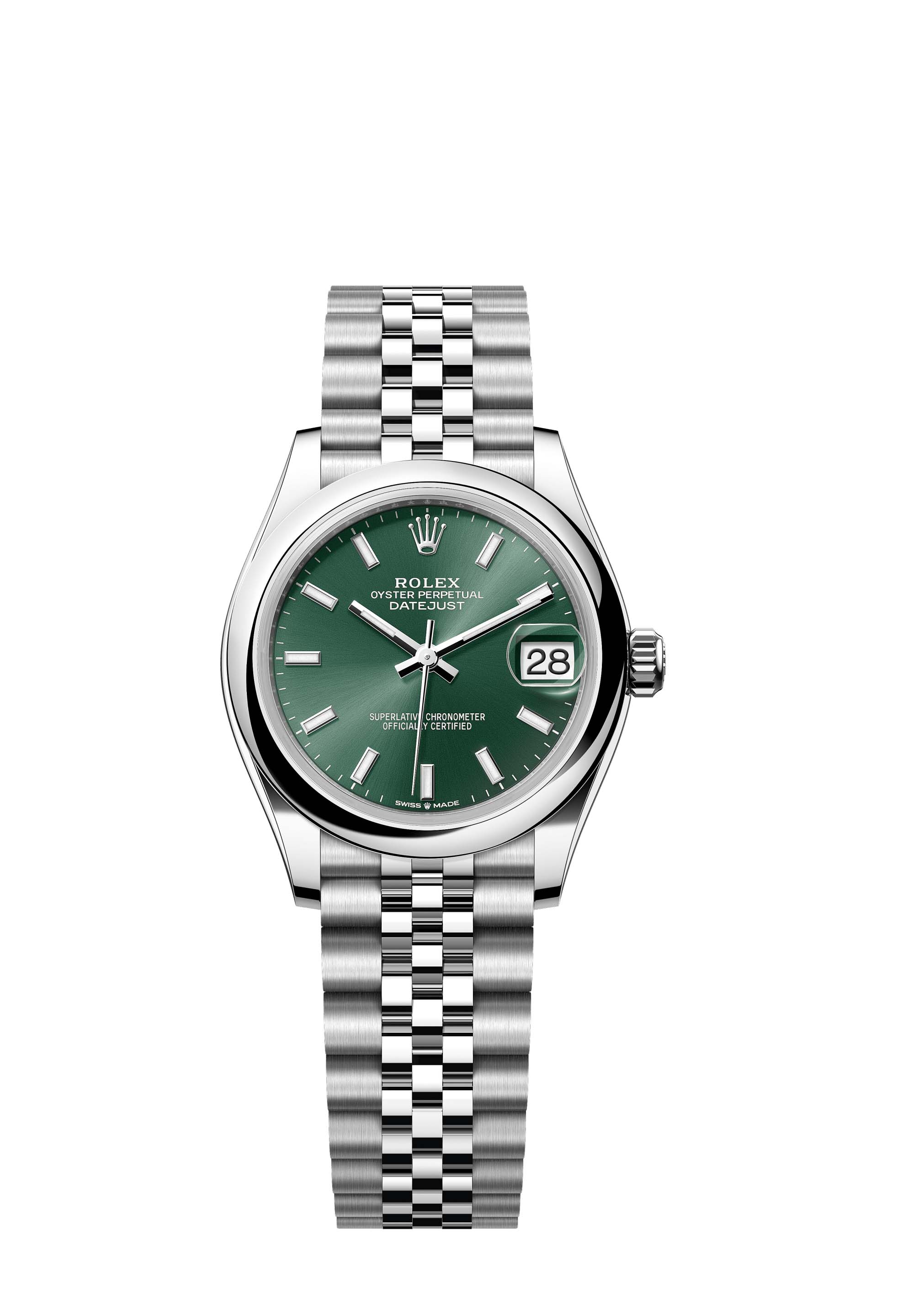 This Oyster Perpetual Datejust 31 in Oystersteel features a mint green dial and a Jubilee bracelet.