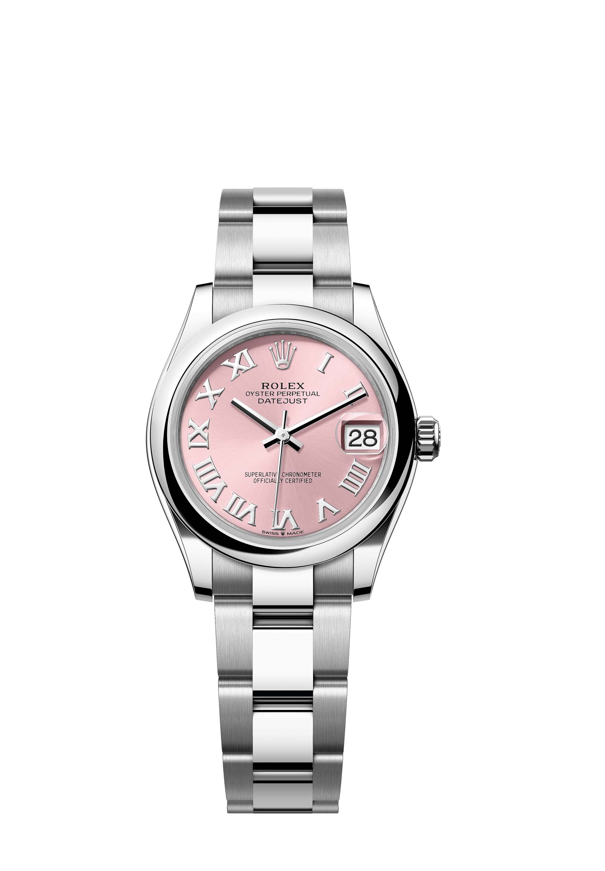 This Oyster Perpetual Datejust 31 in Oystersteel features a pink dial and an Oyster bracelet.