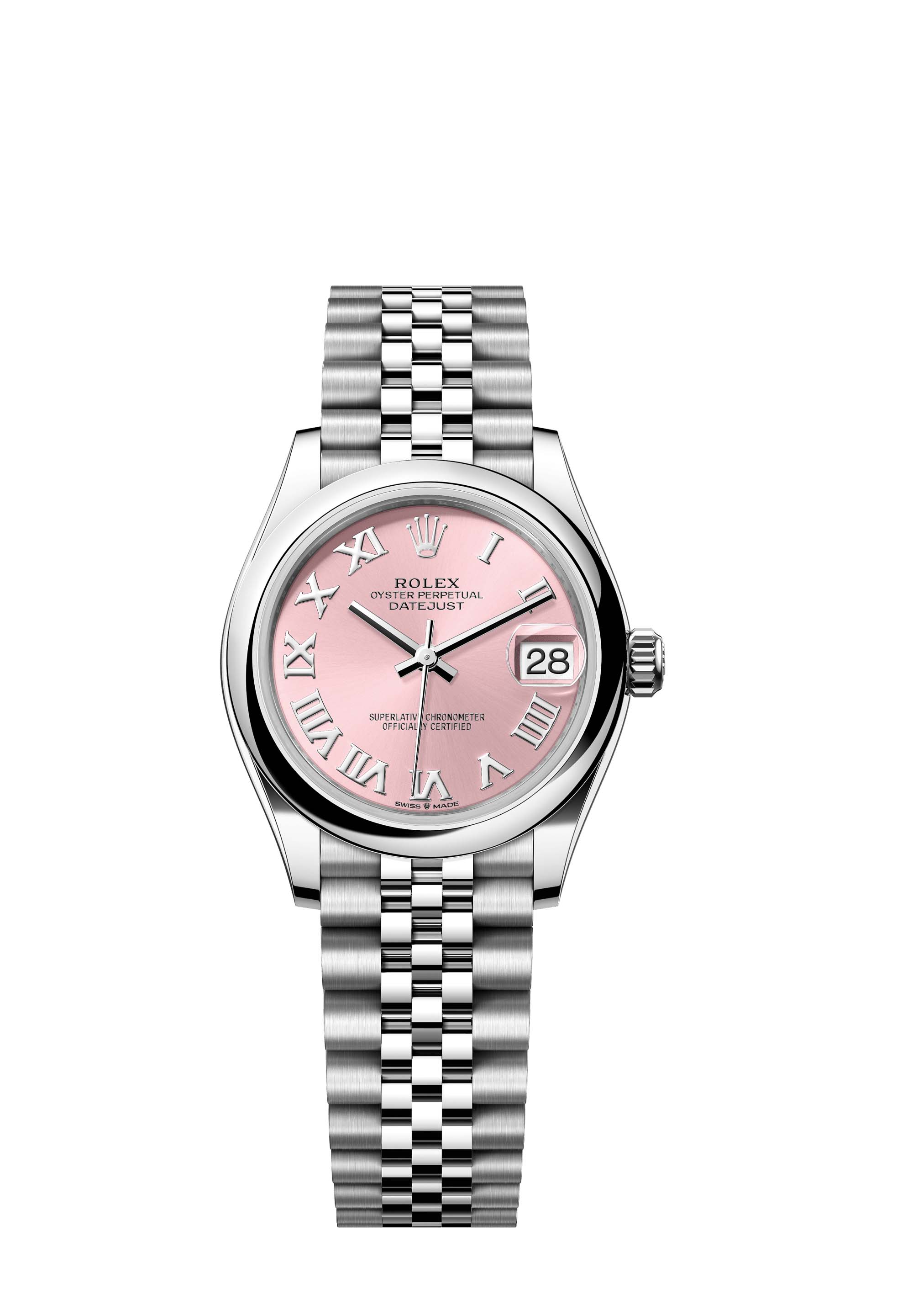 This Oyster Perpetual Datejust 31 in Oystersteel features a pink dial and a Jubilee bracelet.