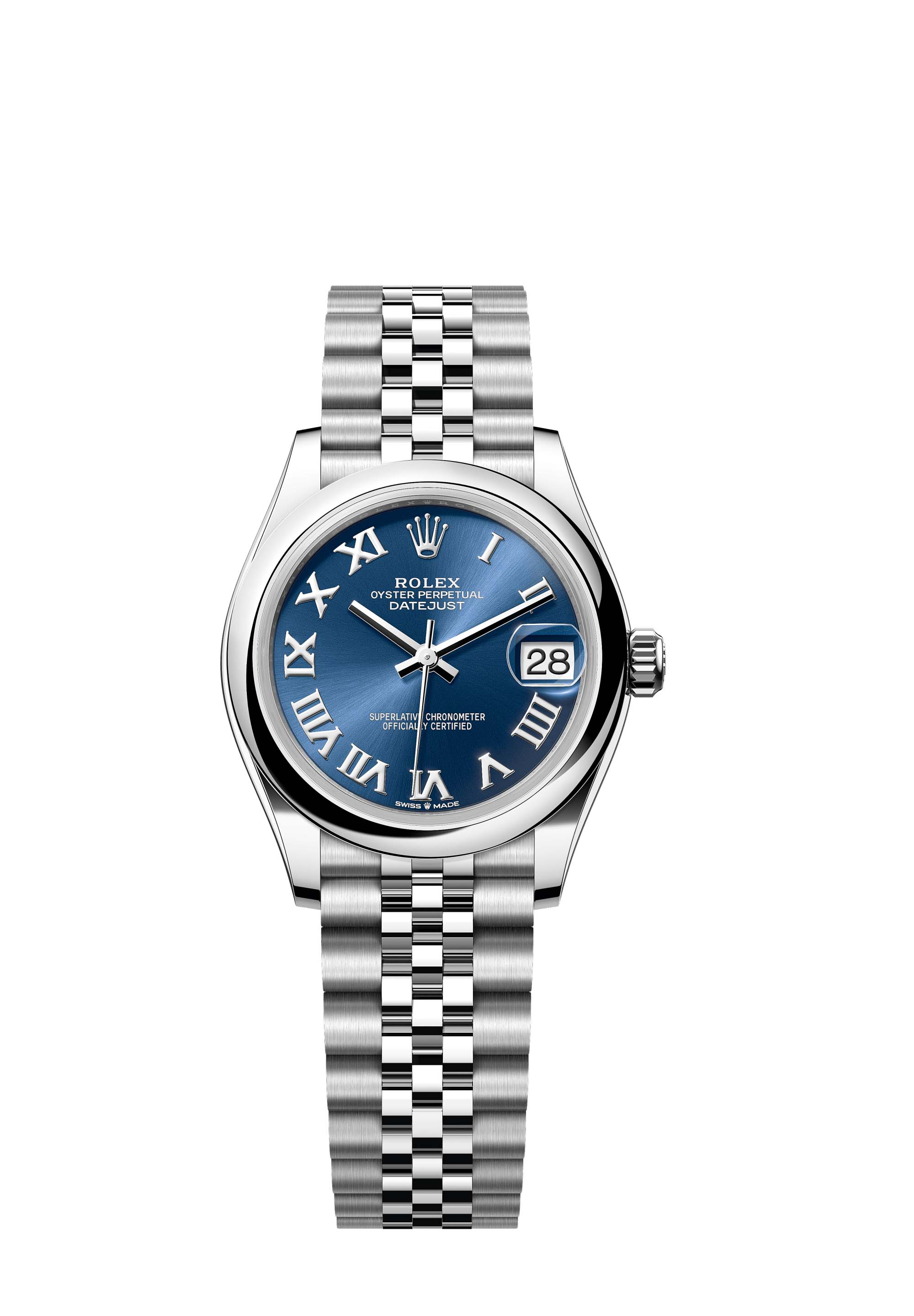 This Oyster Perpetual Datejust 31 in Oystersteel features a bright blue dial and a Jubilee bracelet.