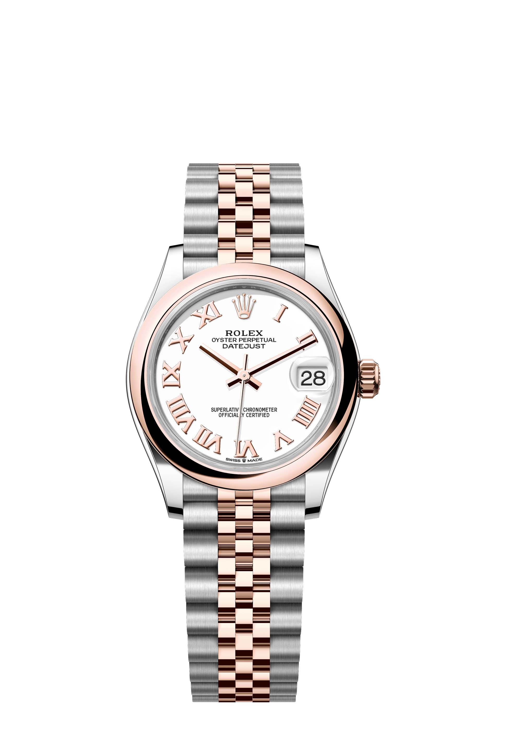 This Oyster Perpetual Datejust 31 in Oystersteel and Everose gold features a white dial and a Jubilee bracelet.